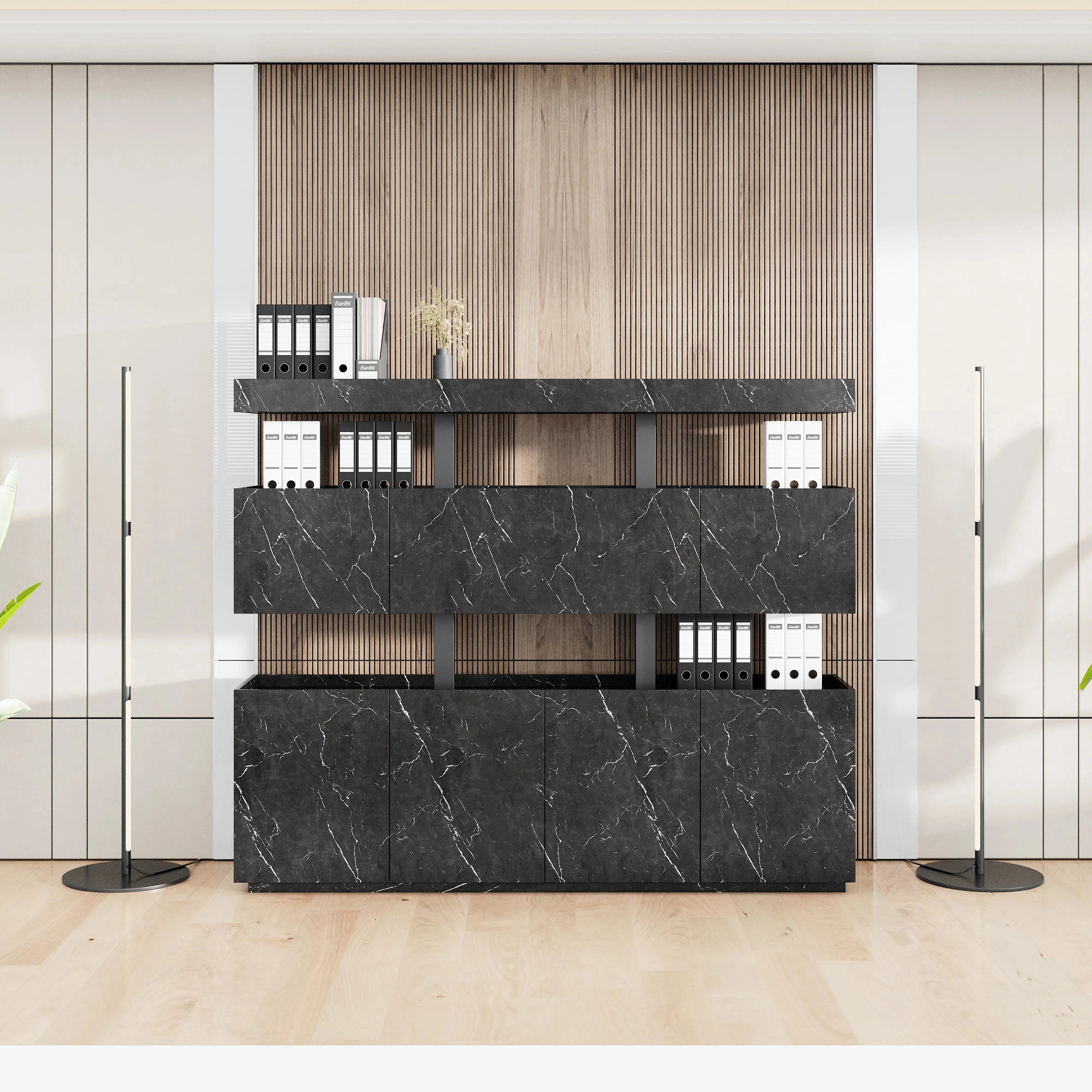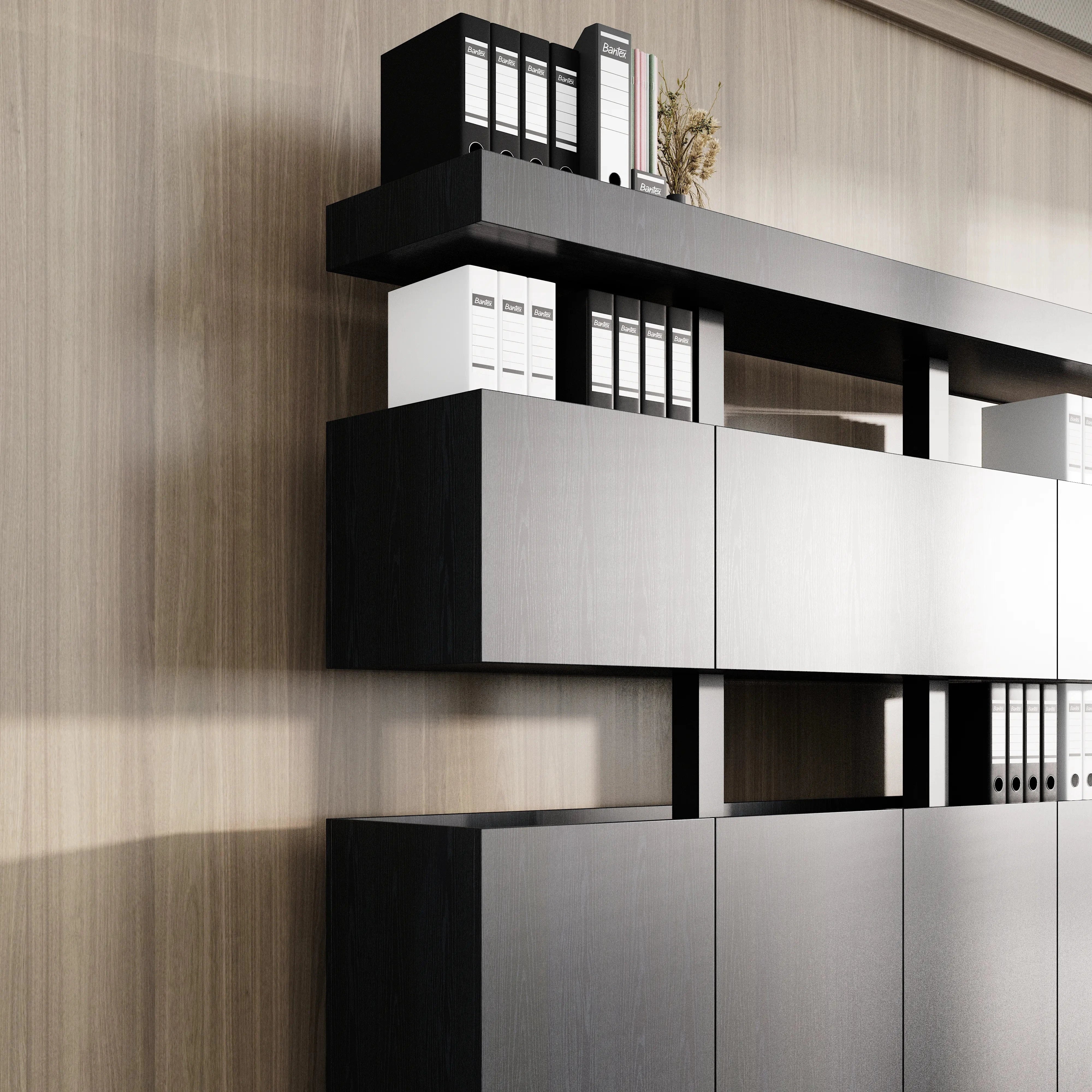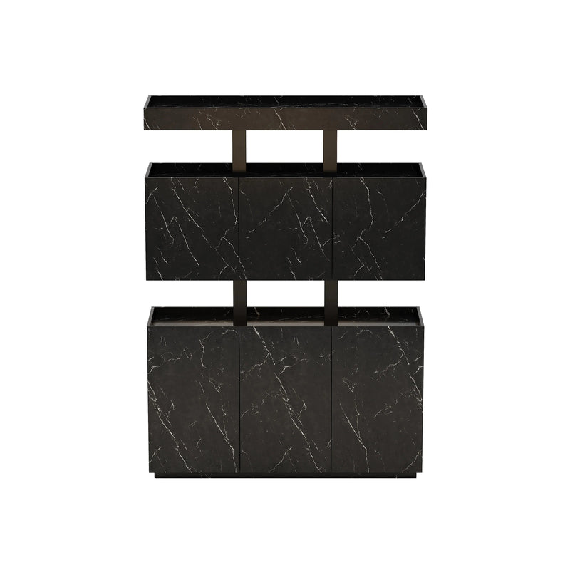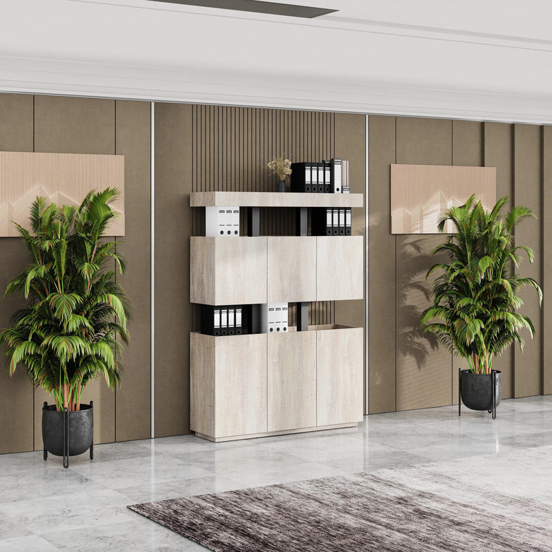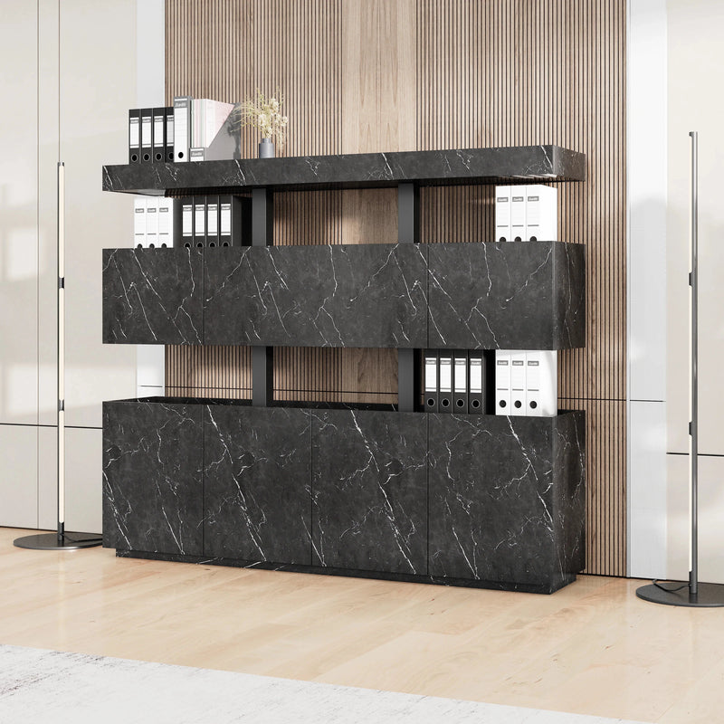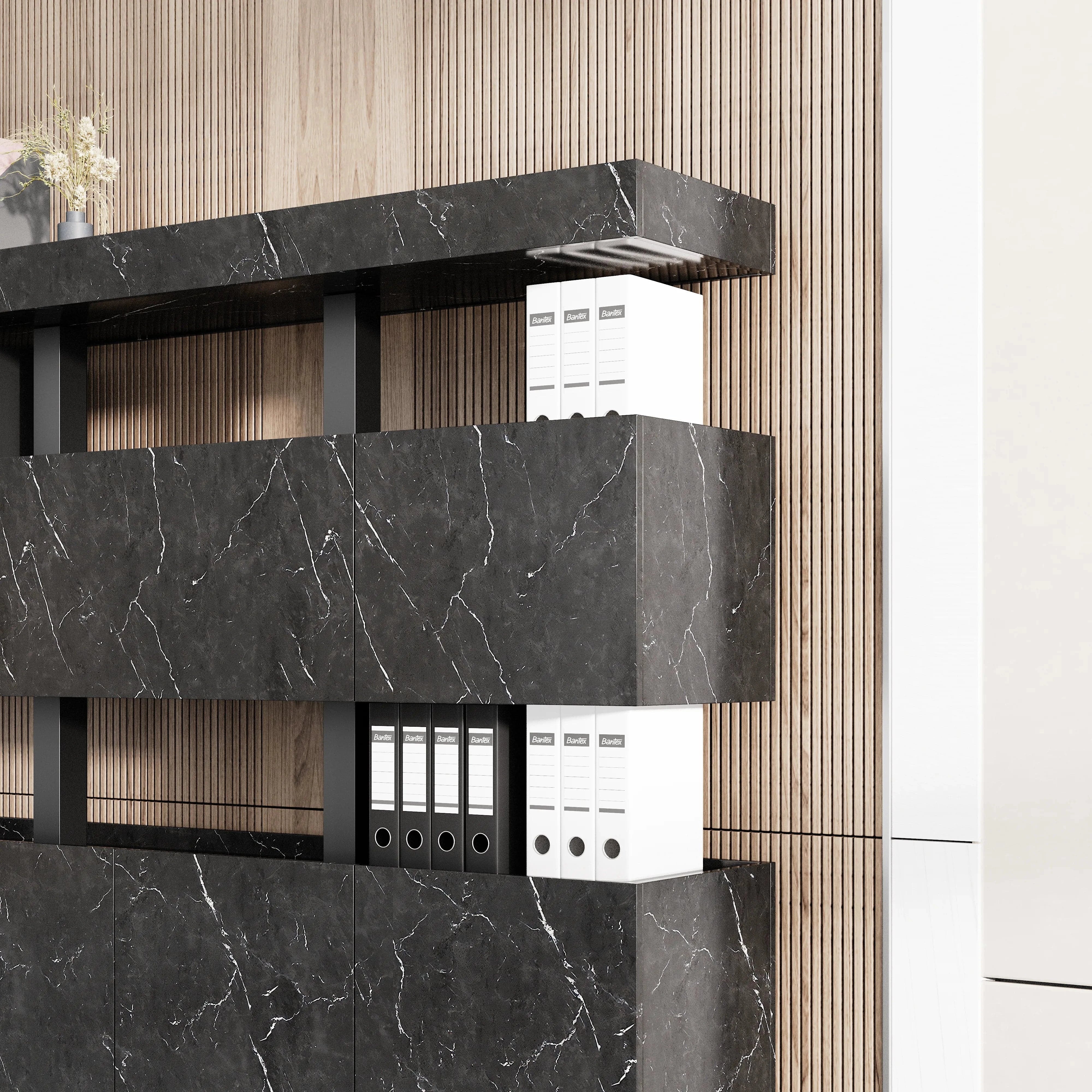 - Estanterías abiertas: cuenta con múltiples estantes abiertos, perfectos para exhibir libros, artículos decorativos u otros elementos esenciales.