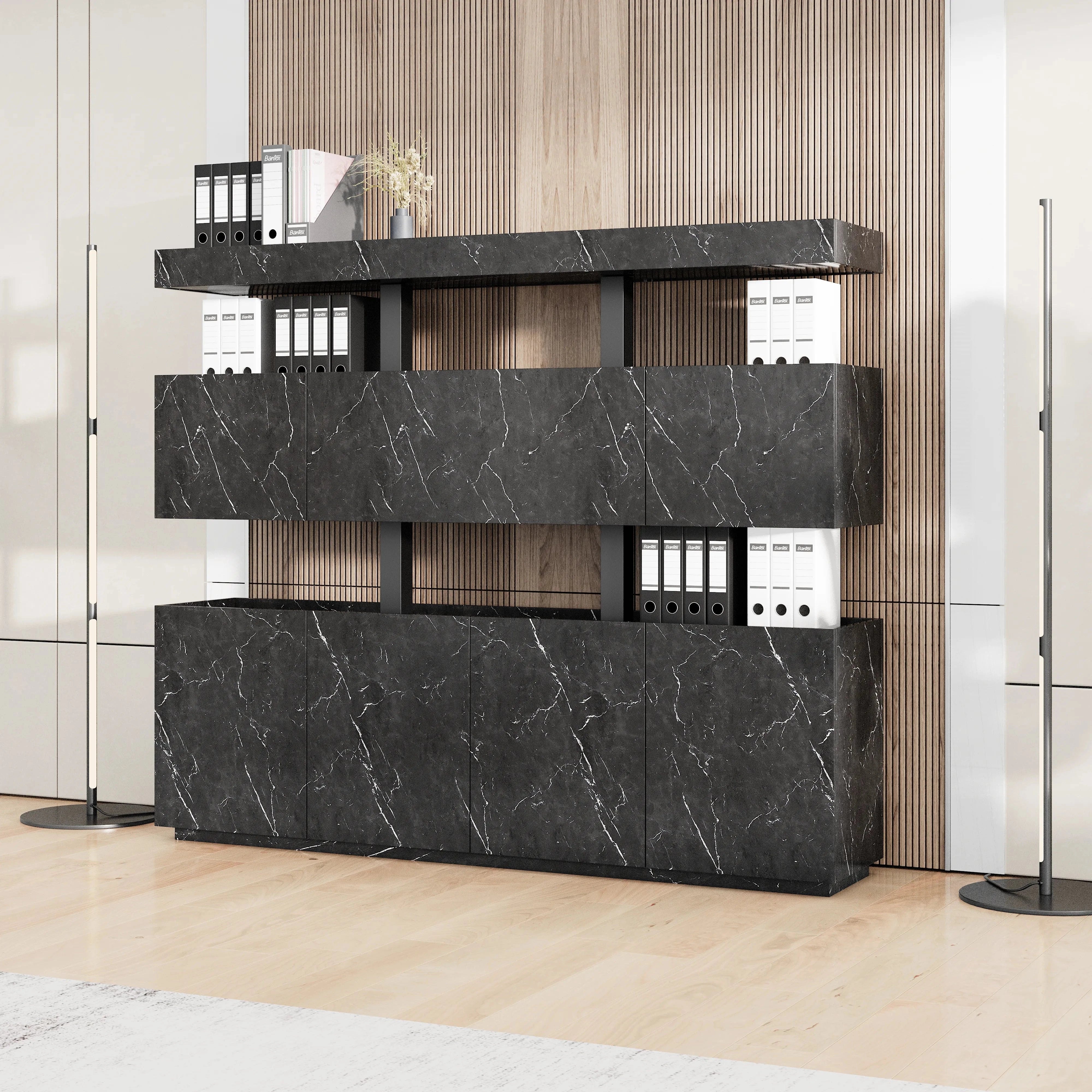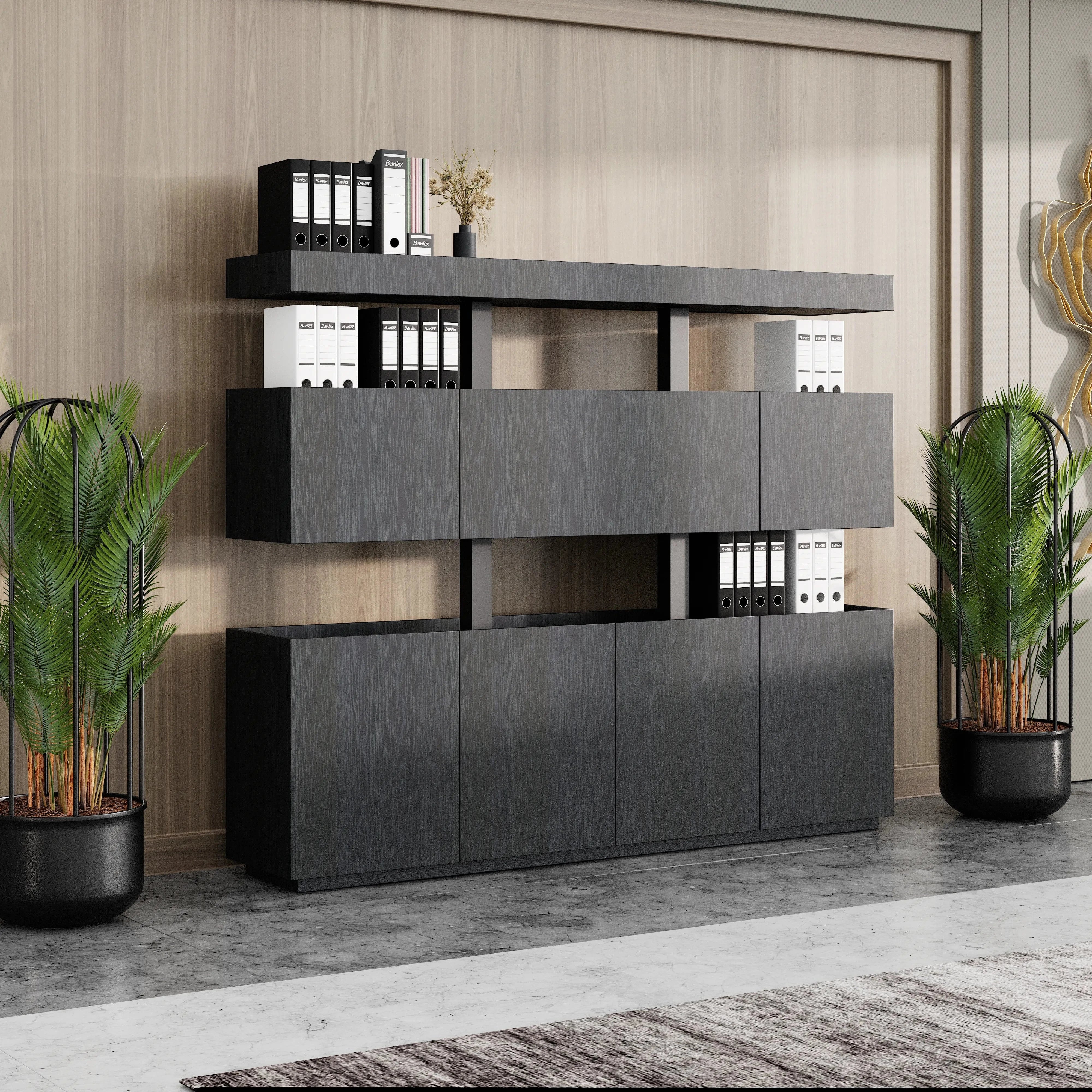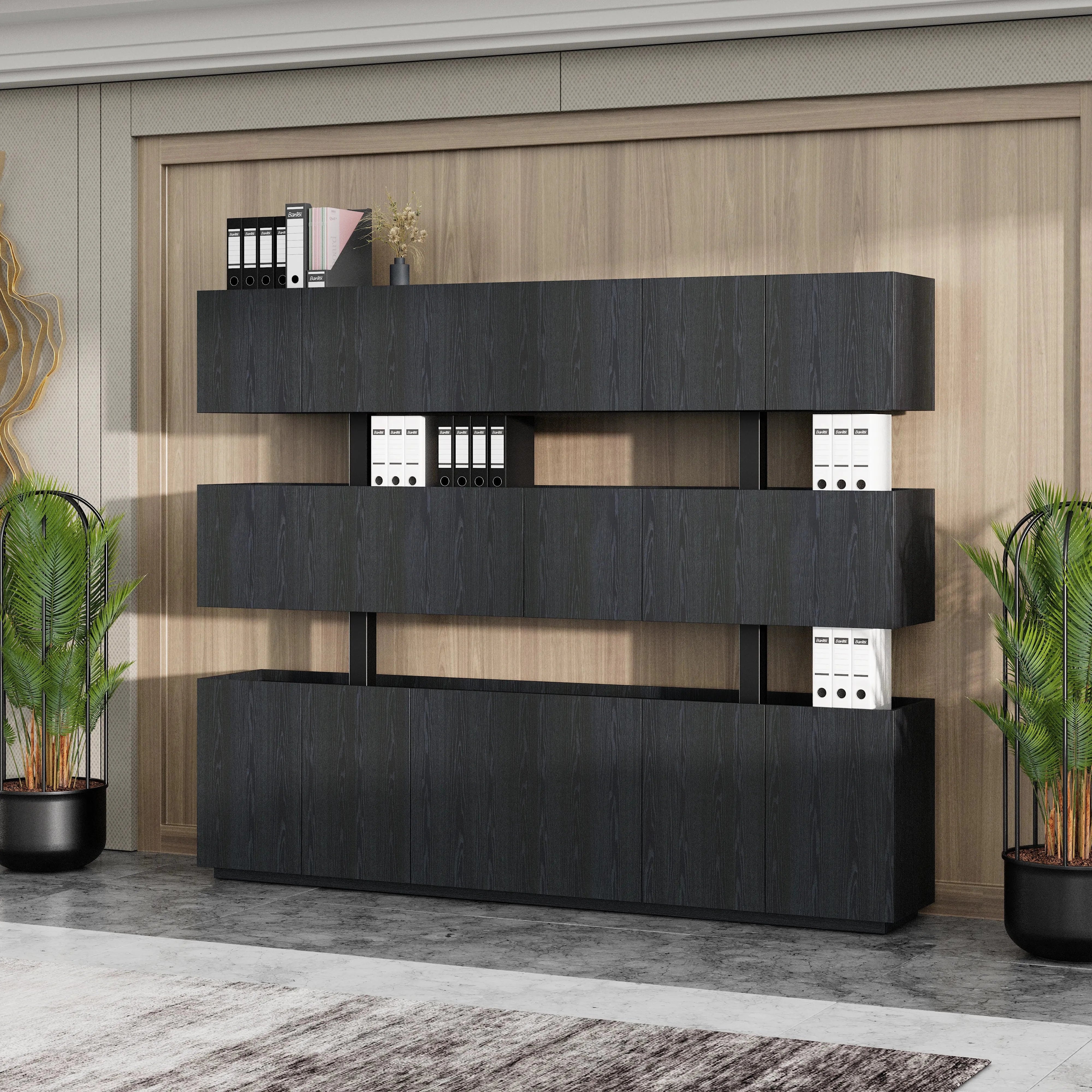 La estantería de pared para biblioteca Finn de 53 a 95" de la colección AF Essence Mooreen es una solución elegante y práctica para organizar y exhibir sus pertenencias. Con su ancho ajustable, esta versátil unidad ofrece una combinación perfecta de estantería abierta y espacio de almacenamiento, lo que la hace ideal para habitaciones grandes u oficinas en el hogar.