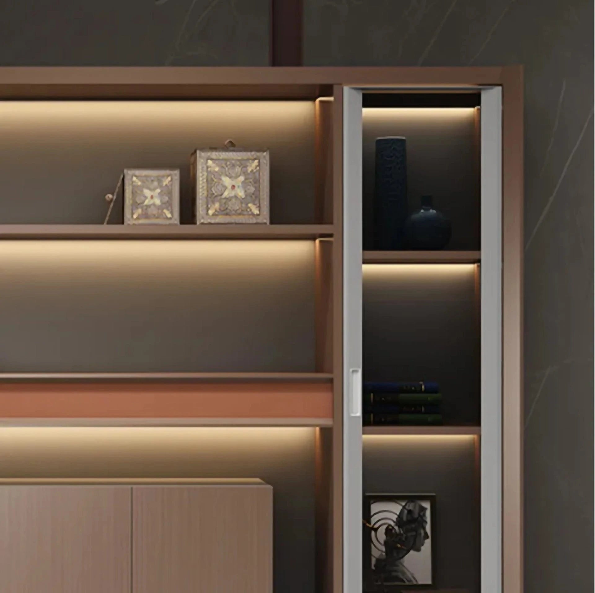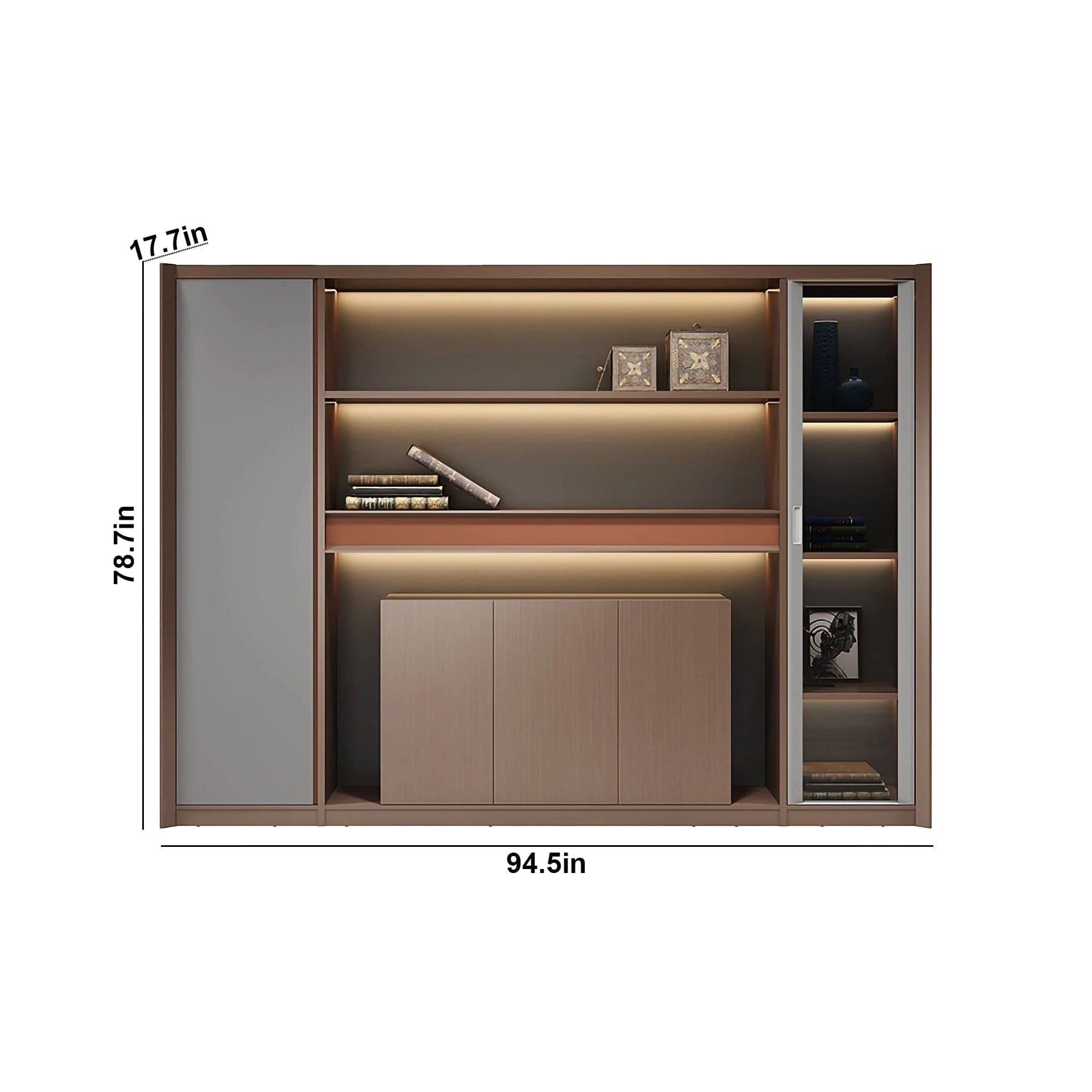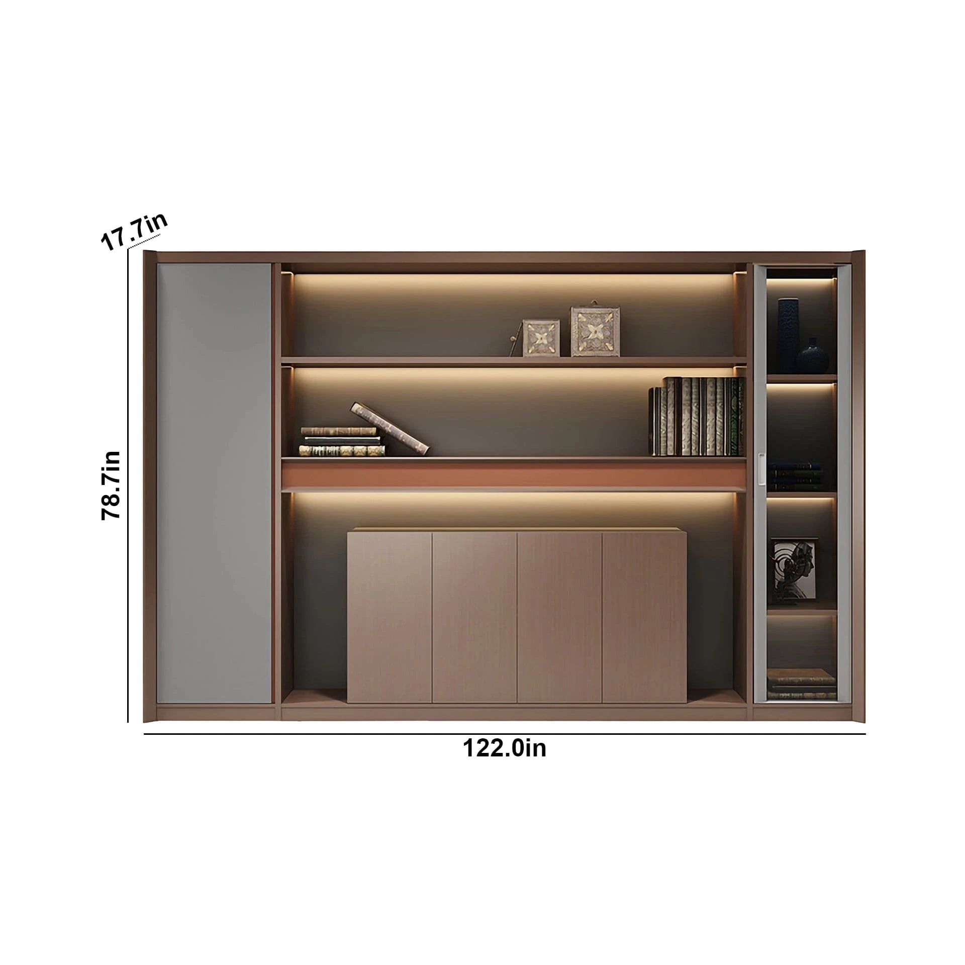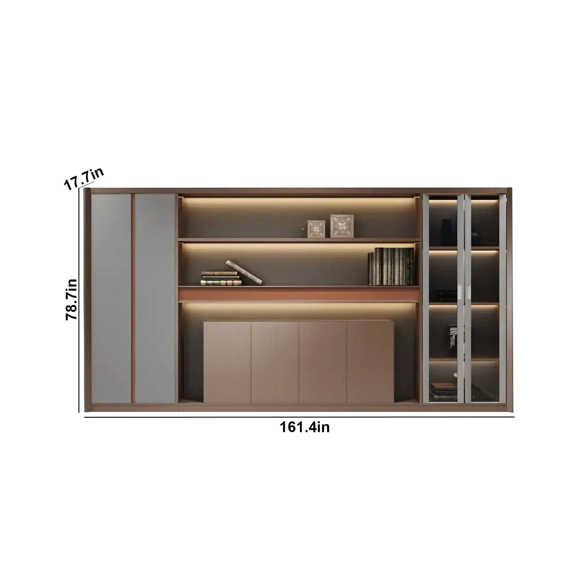 - Design Features: Modern design with a mix of light brownish-gray, beige, and glass-fronted display sections, recessed LED lighting