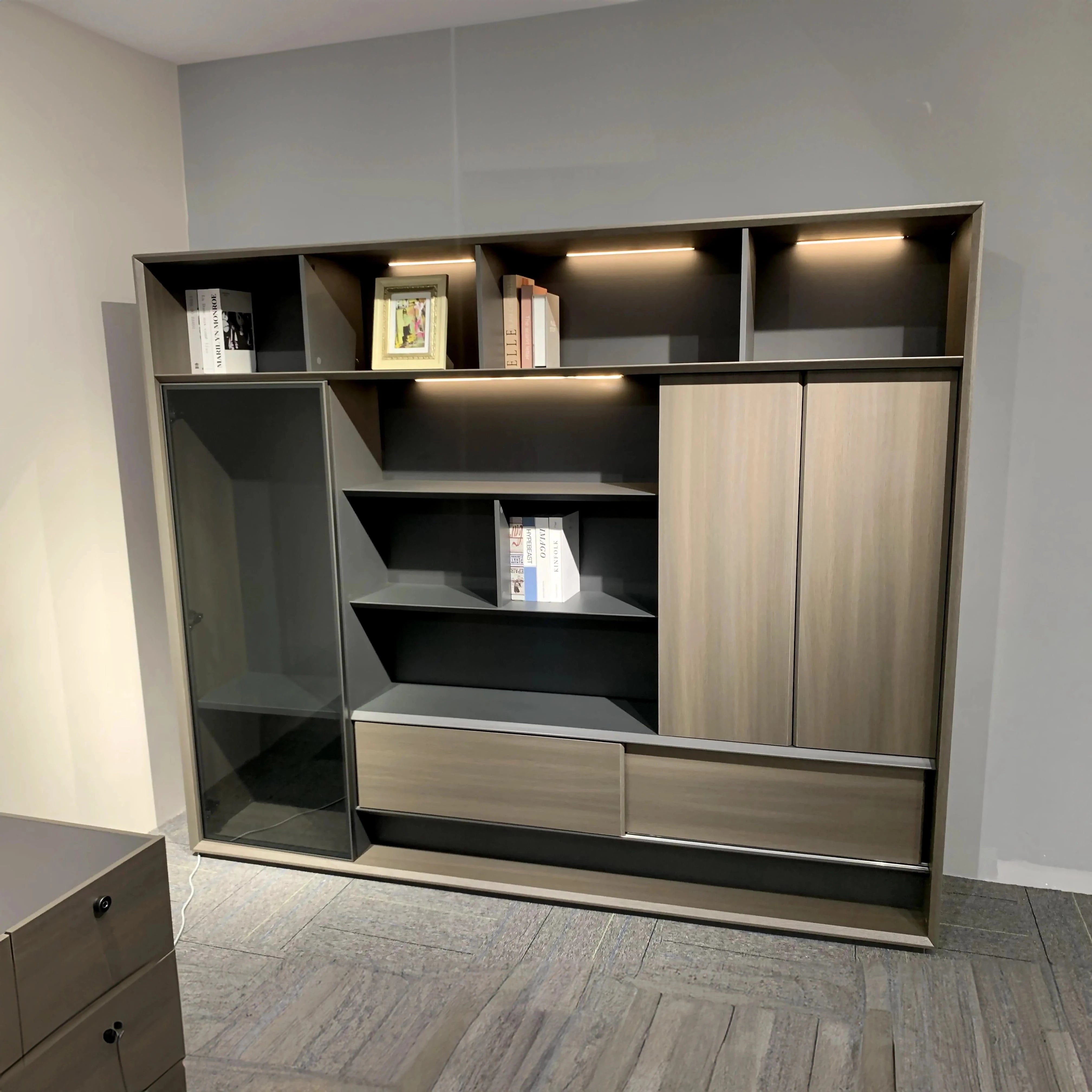 Designed with functionality and flexibility in mind, the Greg shelving system is available in three set options with width ranges from 94 to 150 inches. Its modular layout features integrated LED lighting that brings subtle brightness to display sections, making it perfect for showcasing books, awards, or decorative accents. A built-in wardrobe compartment allows for convenient hanging of garments such as coats or uniforms, supporting use in executive suites or multi-purpose rooms.