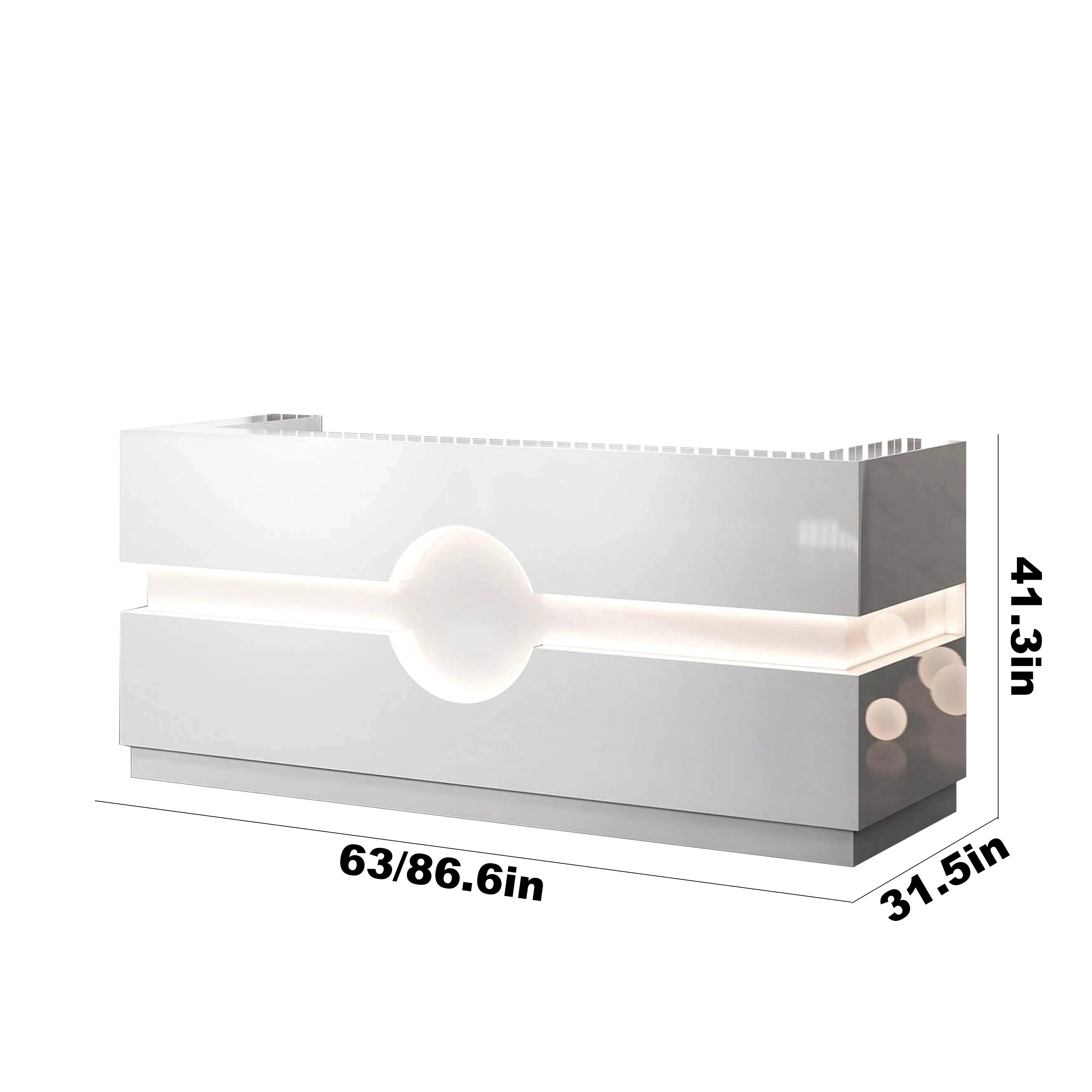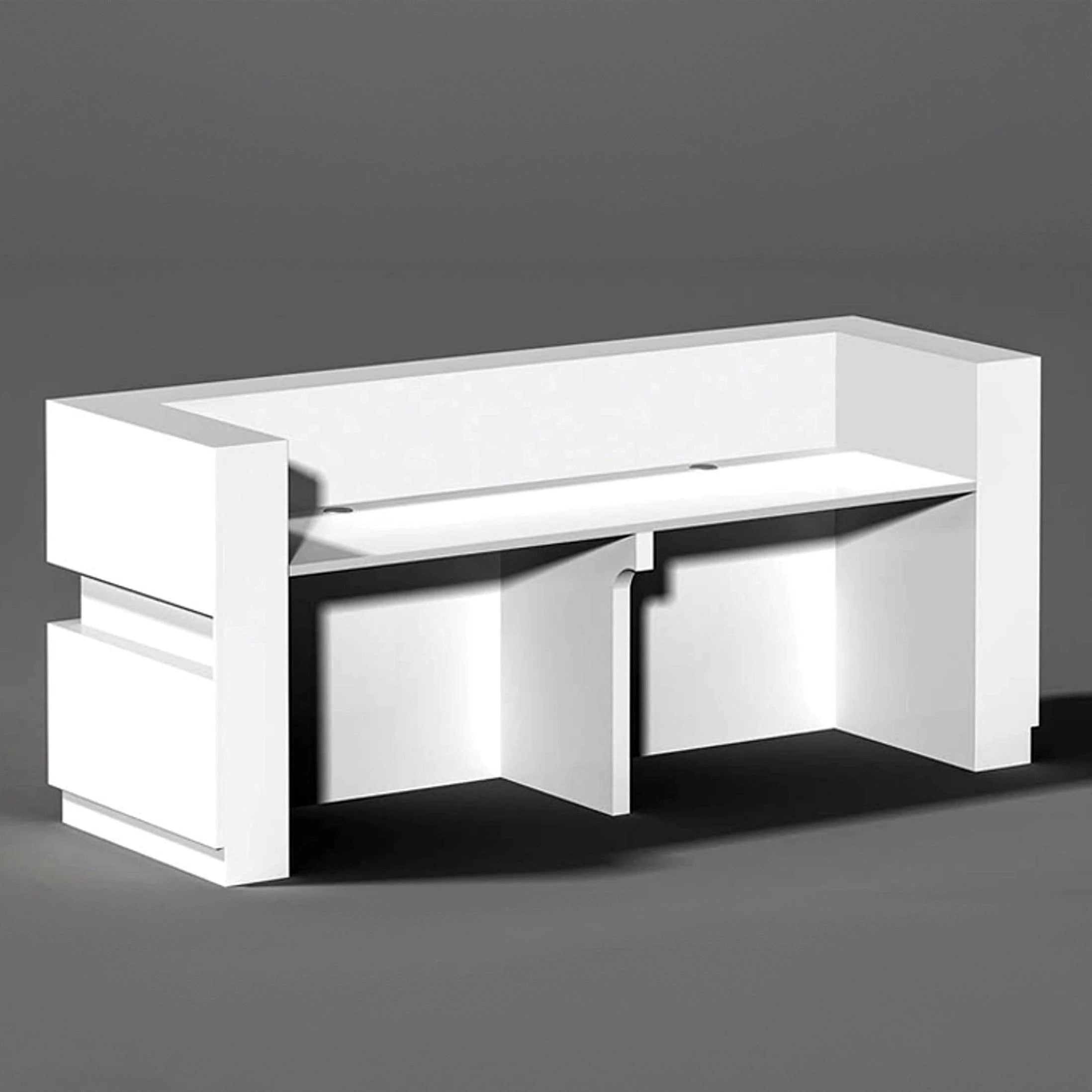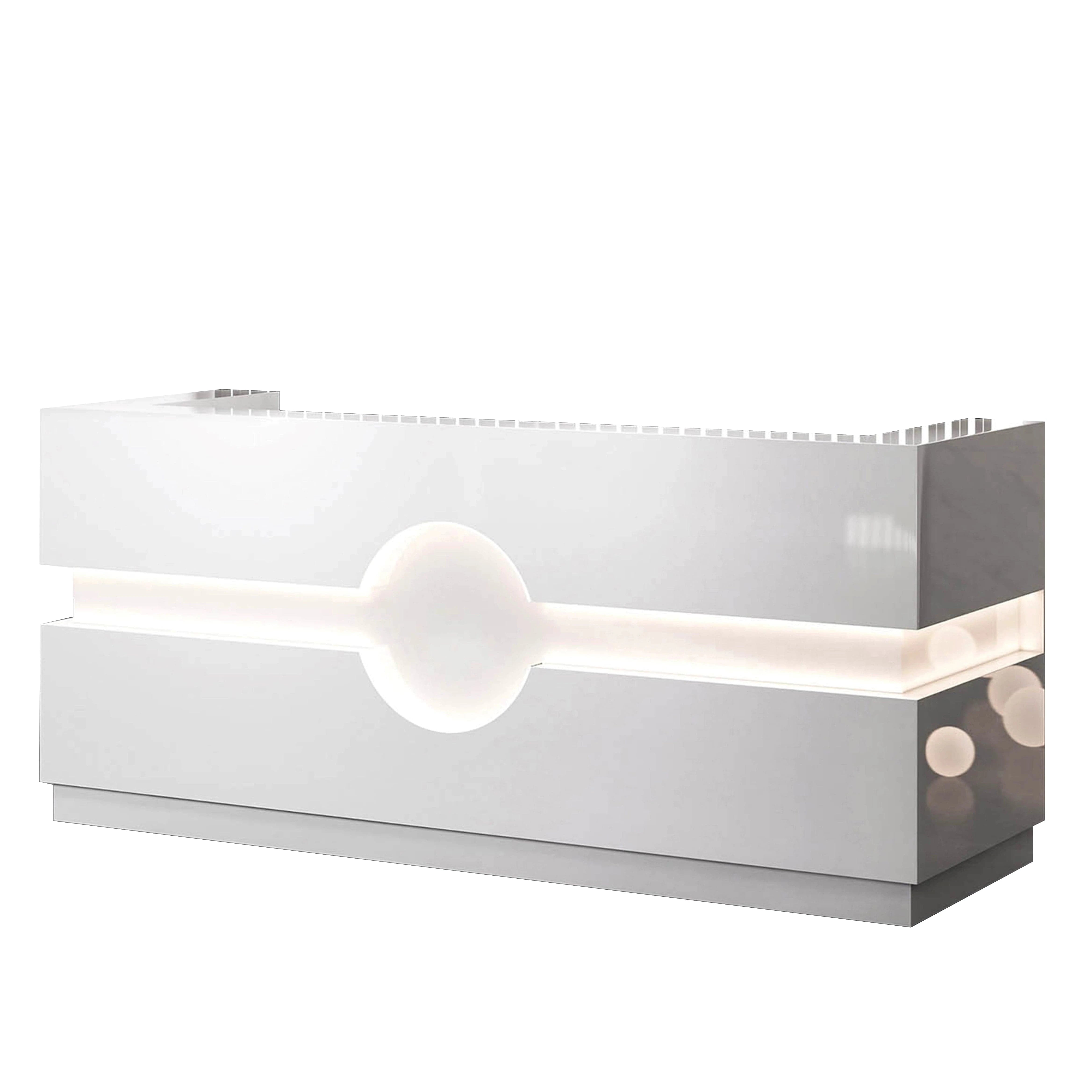 The standout design element is the geometric exterior paneling, which adds subtle dimension and architectural flair. Integrated LED undertone lighting adds a soft glow across the workspace, enhancing both ambiance and visibility during interactions and daily work.