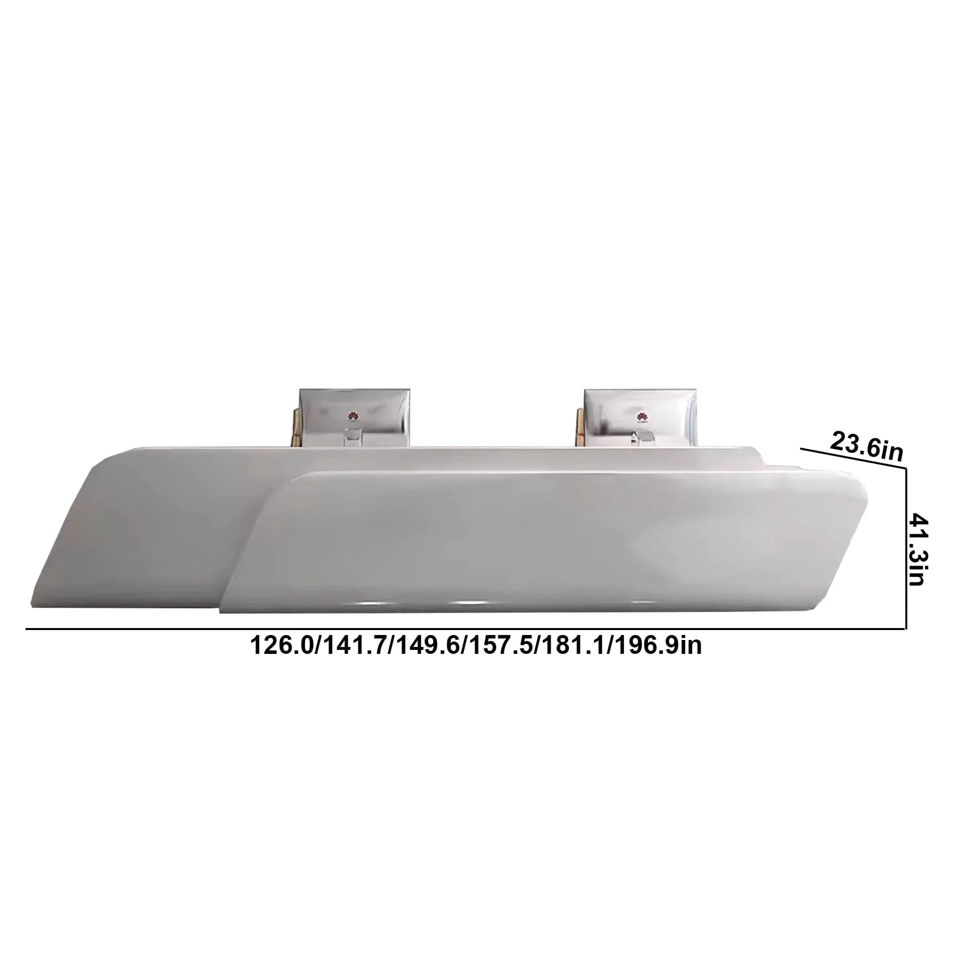 The design is distinguished by its aerodynamic contours and fully rounded front façade, offering a futuristic and minimalist aesthetic. Its sweeping form creates a calming, fluid visual impact while the integrated privacy slate ensures that front-facing staff maintain discretion and organization during client interactions.