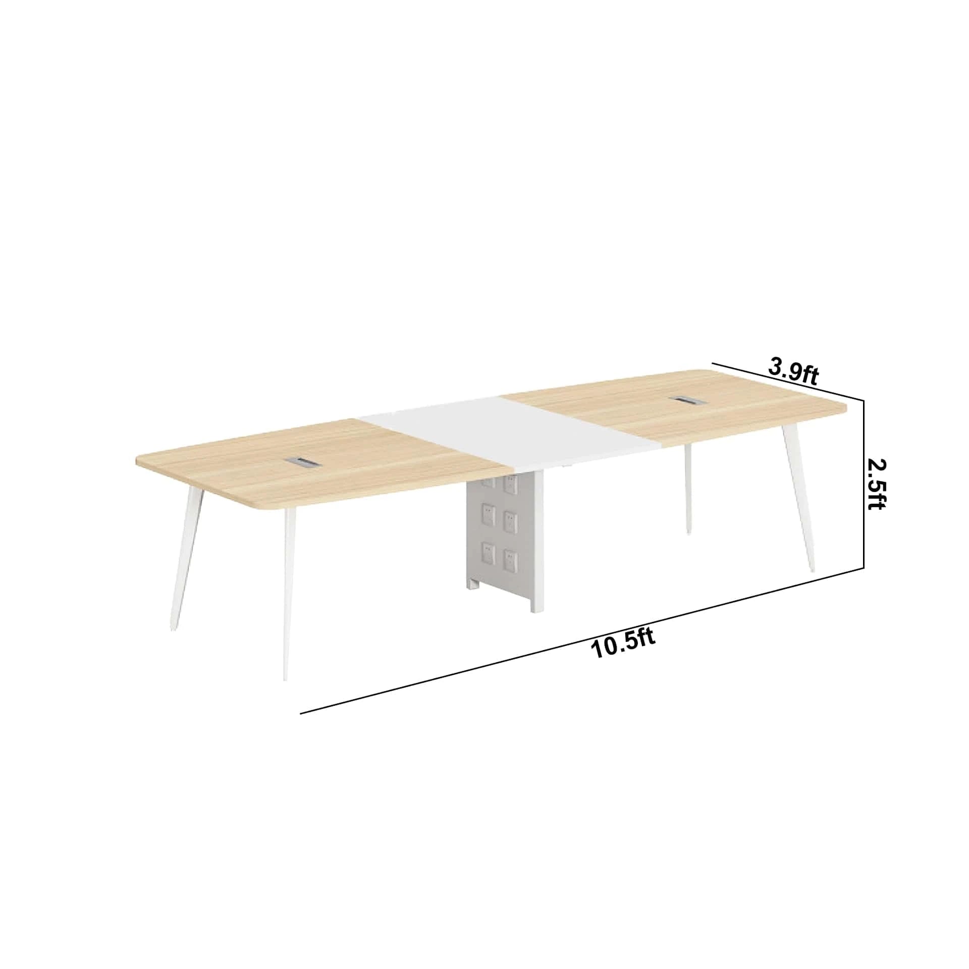 At the center of the table is a rectangular utility pedestal designed for communal accessibility. The white central panel houses six integrated outlets along with two multimedia power boxes, each equipped with USB ports and universal charging access. This ensures every participant can stay connected and powered without clutter.