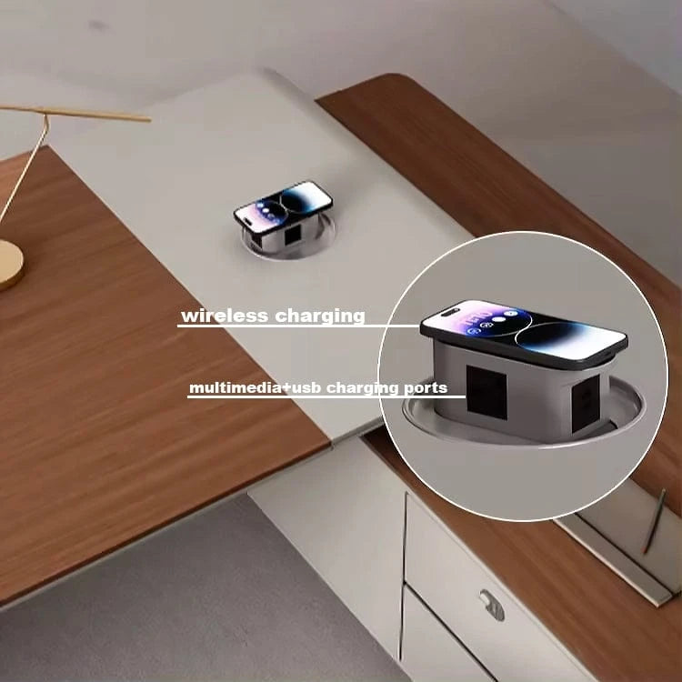 Technology integration is built into the desk with wireless charging, USB ports, and multimedia connections located on the desktop for easy access. Embedded LED lighting adds a subtle glow to the setup, enhancing visibility without compromising the desk’s clean aesthetic. To keep everything organized, an advanced cable management system guides wires through the desktop and into the return, maintaining a clutter-free appearance.