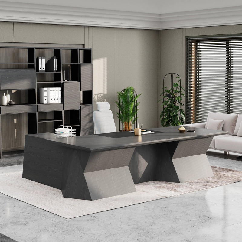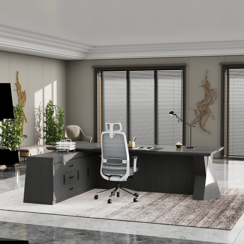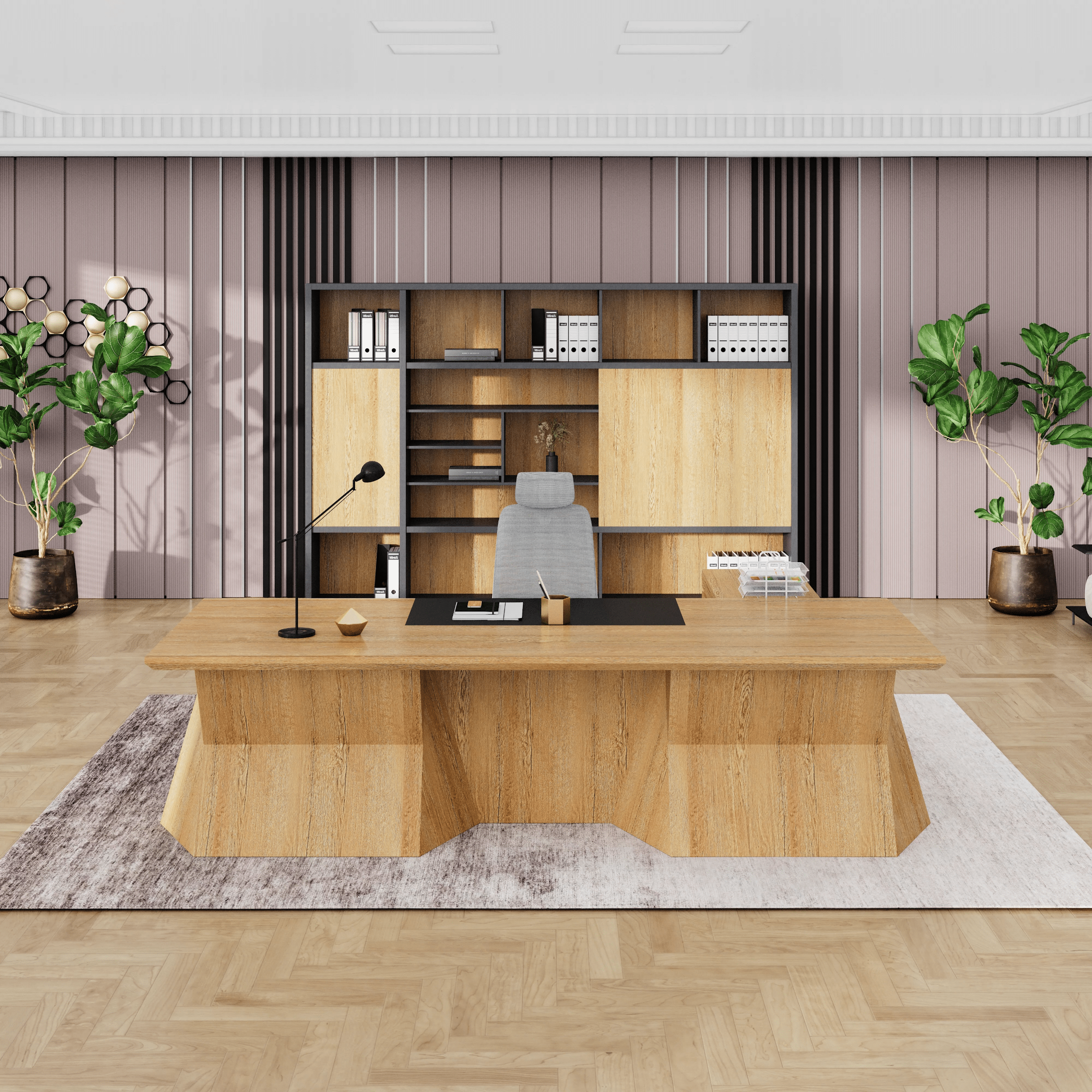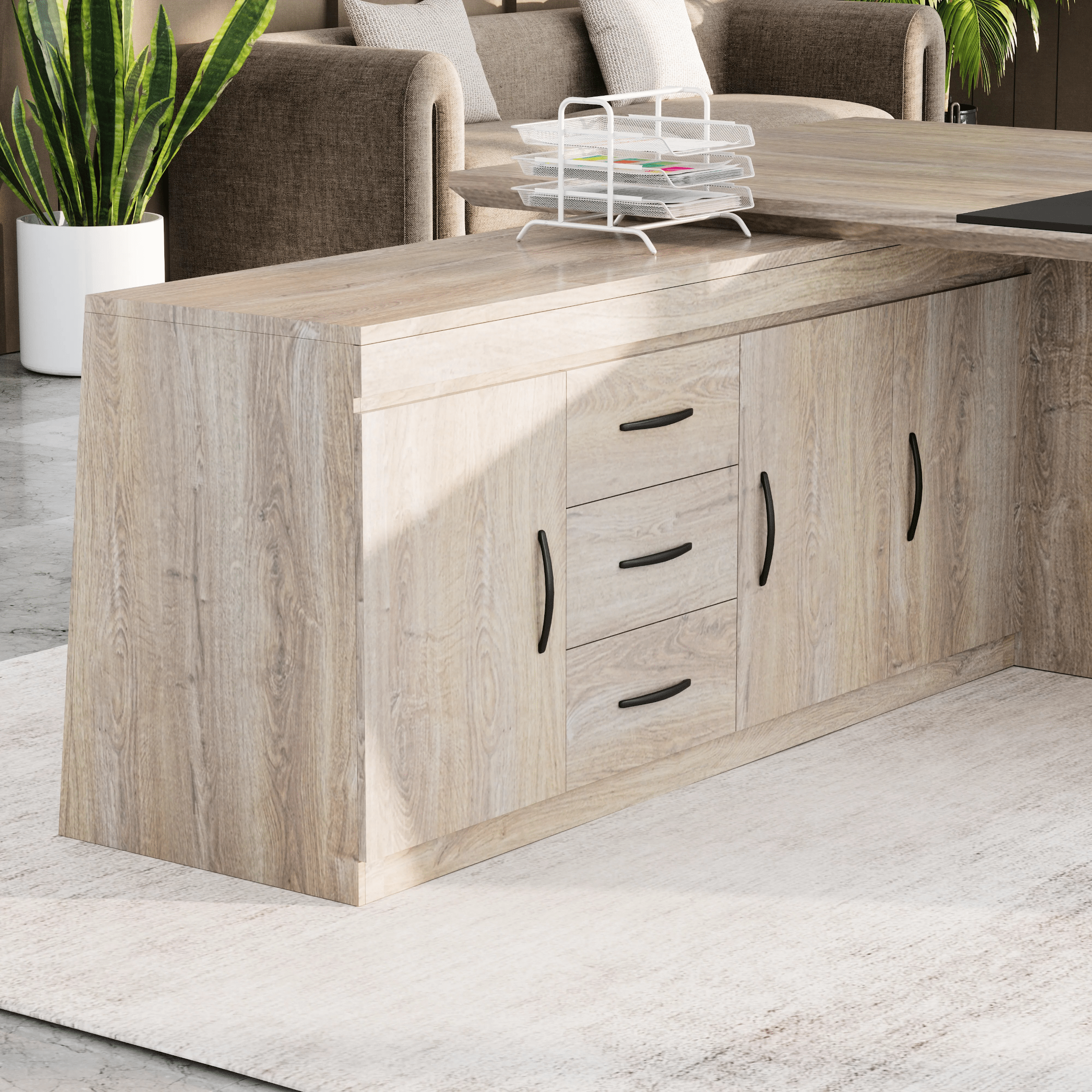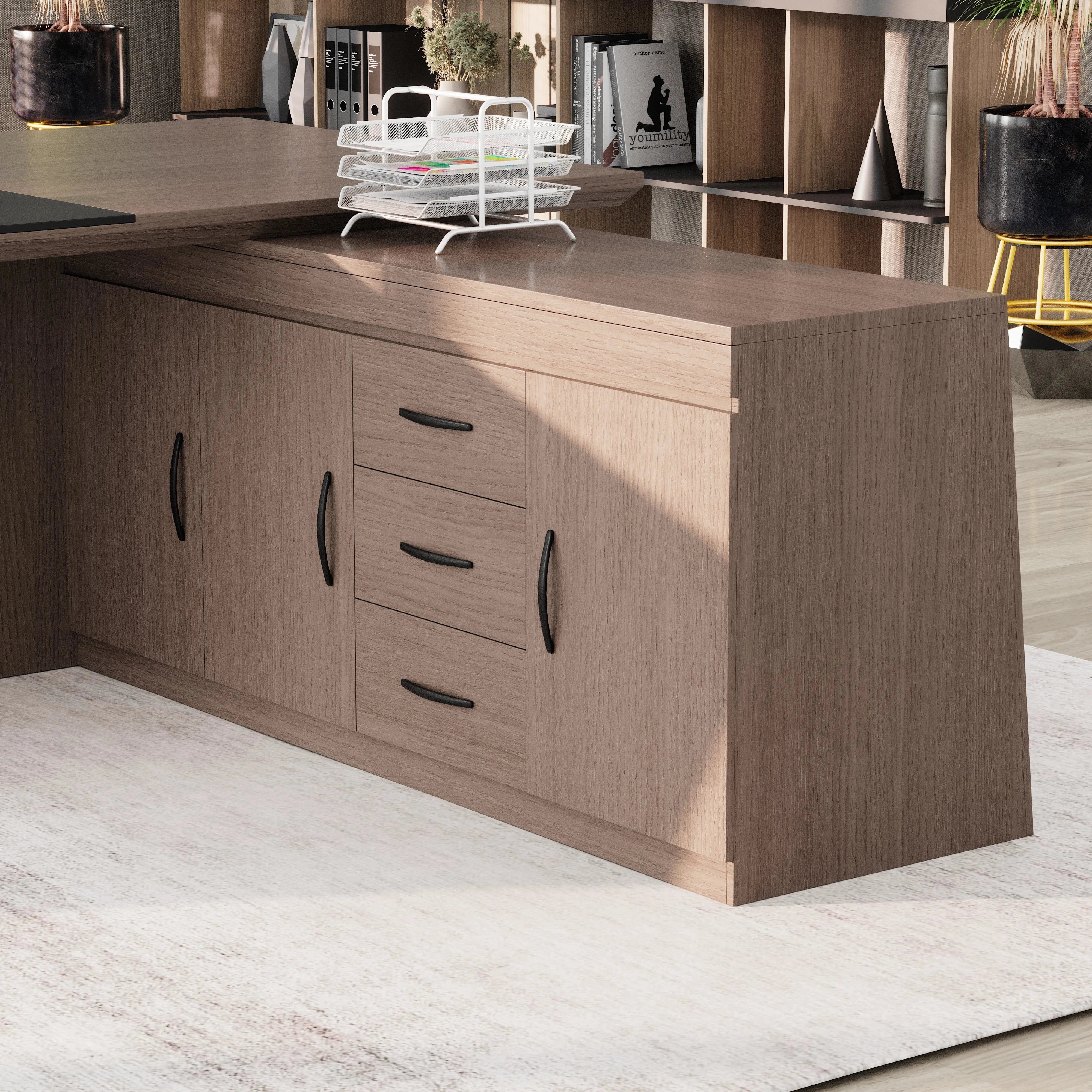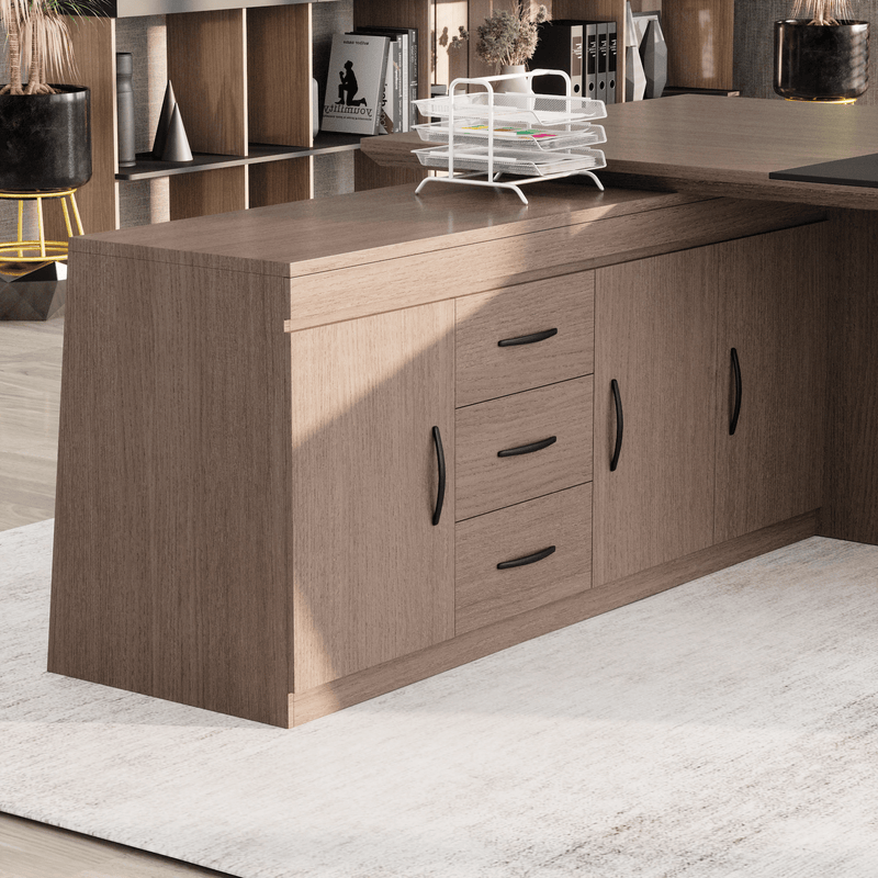 This executive desk offers generous storage with three drawers for stationery and daily-use items, along with three closed cabinets that provide secure, concealed storage for files, tech accessories, or personal items. The expansive desktop and legroom ensure ample working space for up to two users or one user with auxiliary equipment.