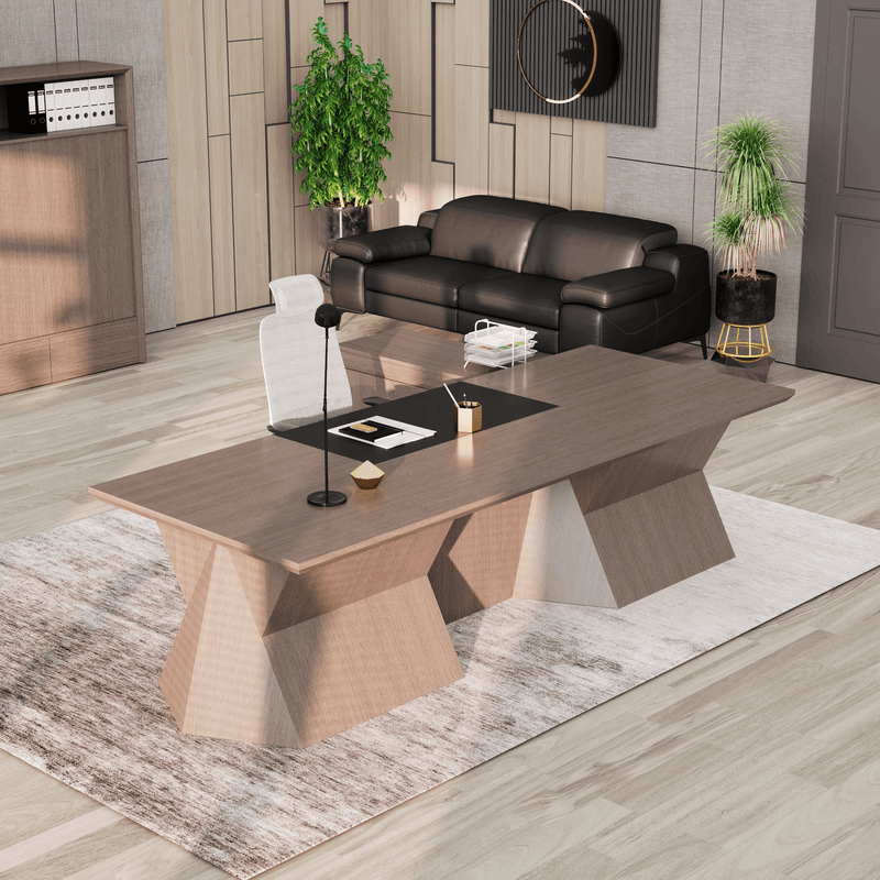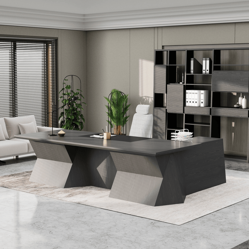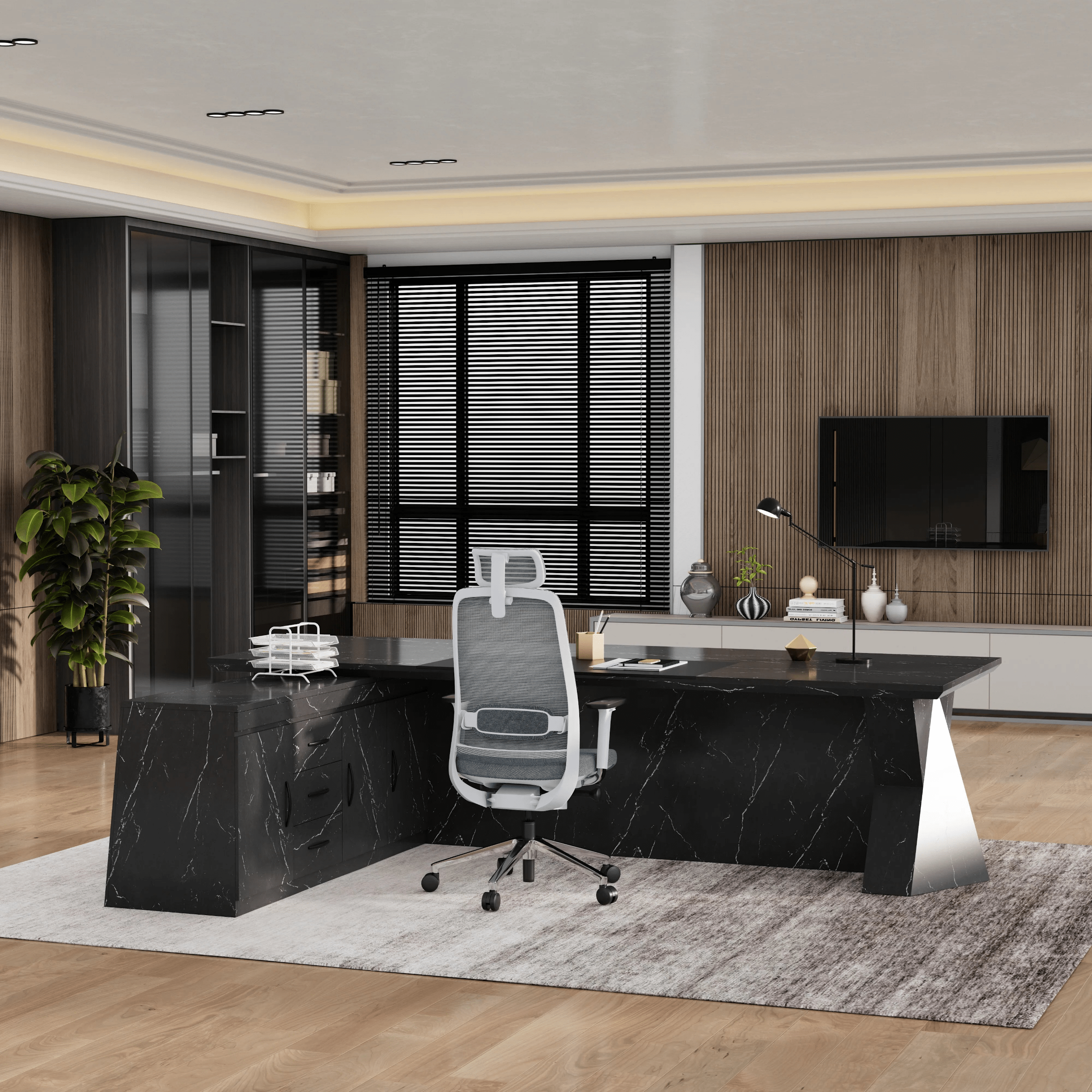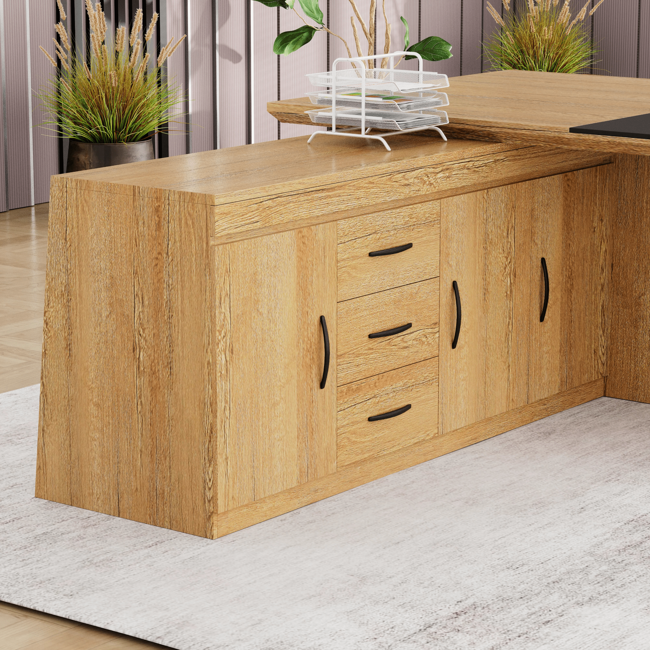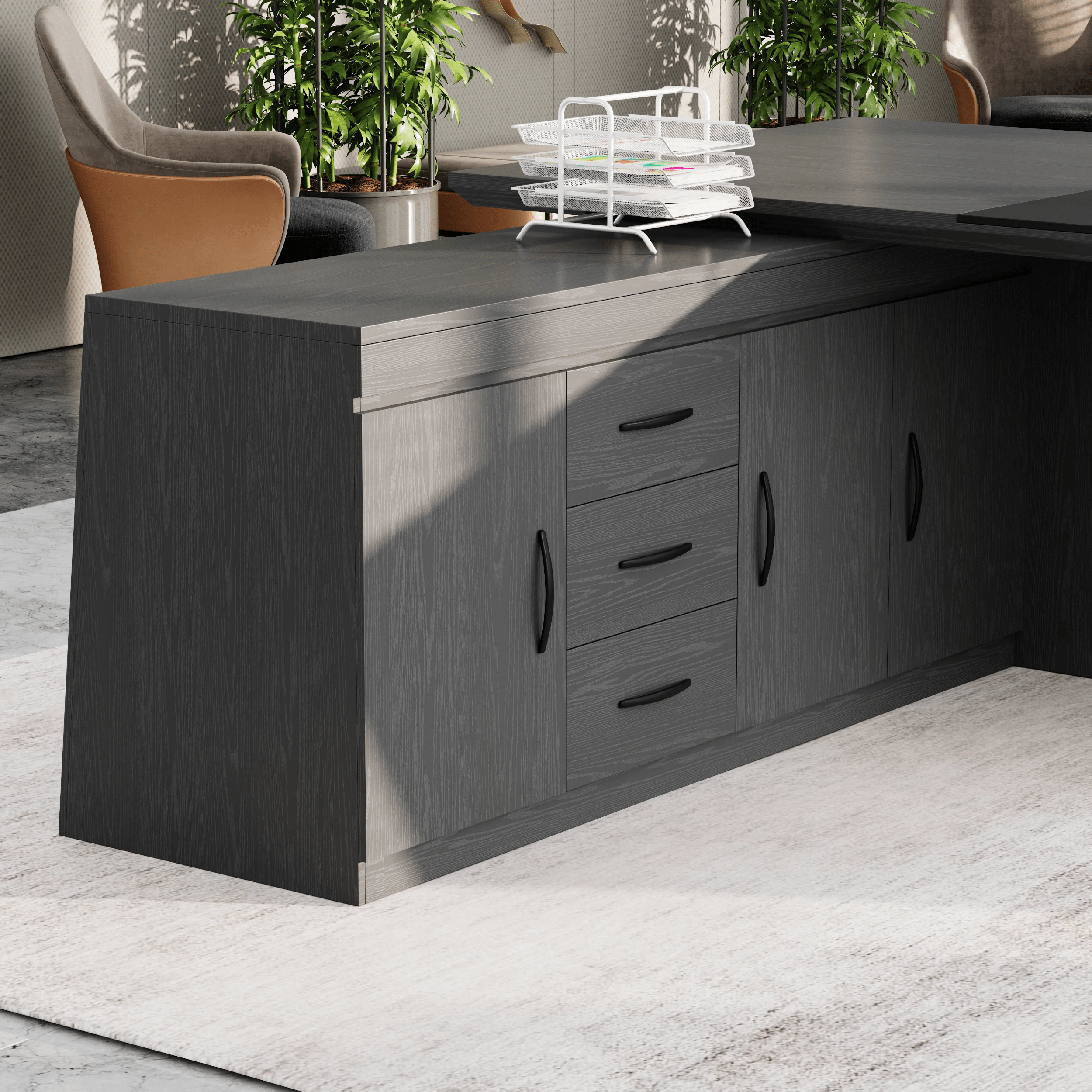 This executive desk offers generous storage with three drawers for stationery and daily-use items, along with three closed cabinets that provide secure, concealed storage for files, tech accessories, or personal items. The expansive desktop and legroom ensure ample working space for up to two users or one user with auxiliary equipment.