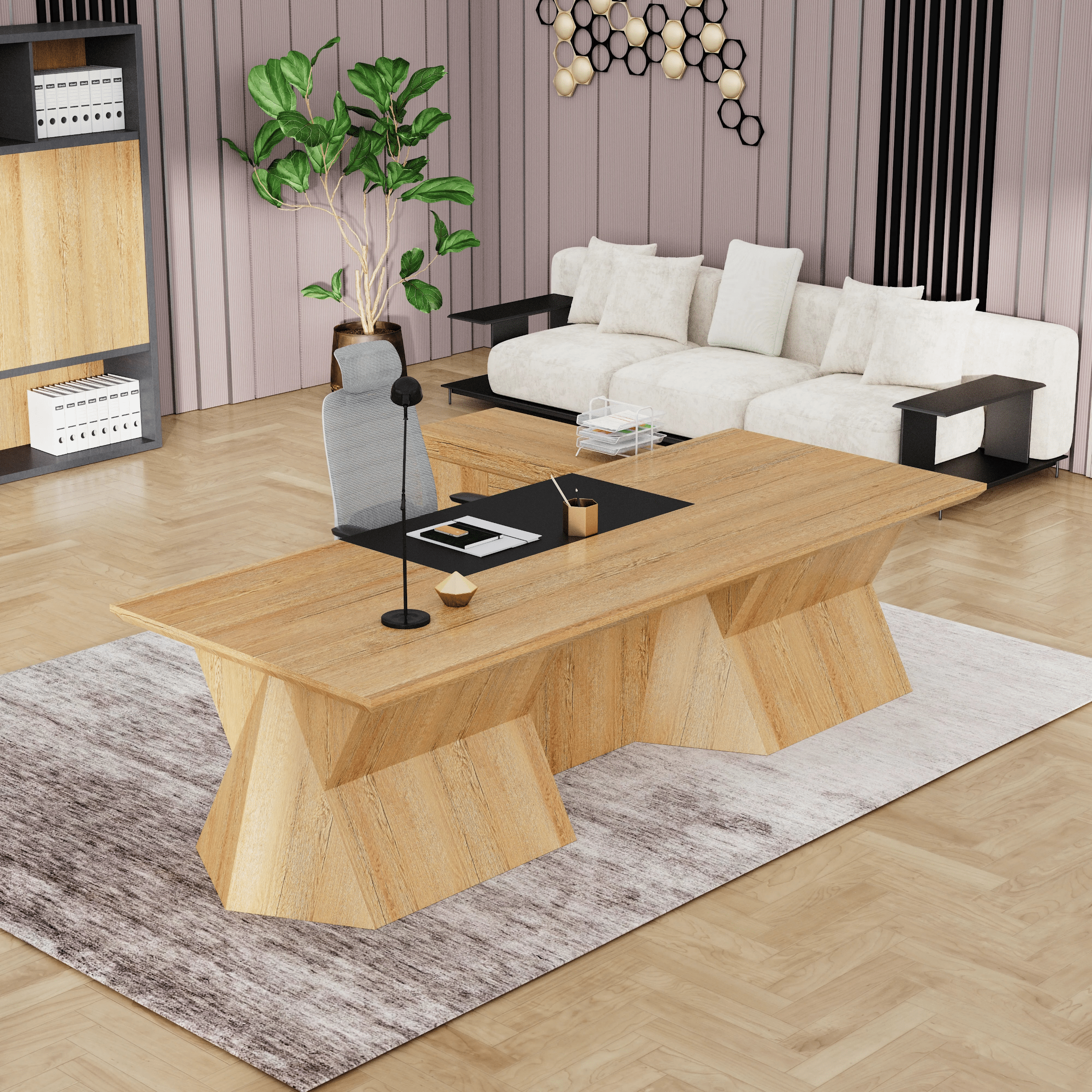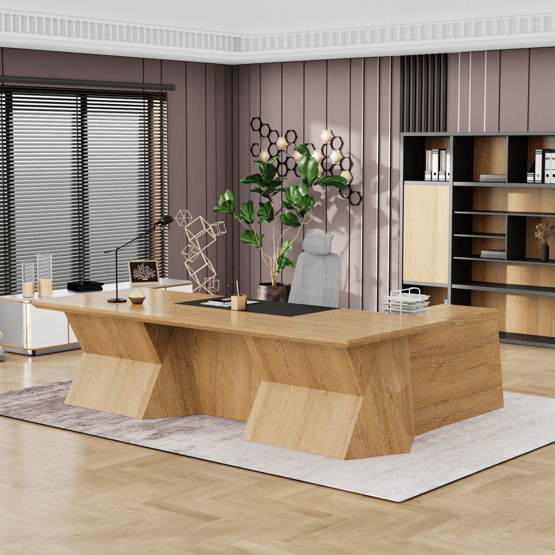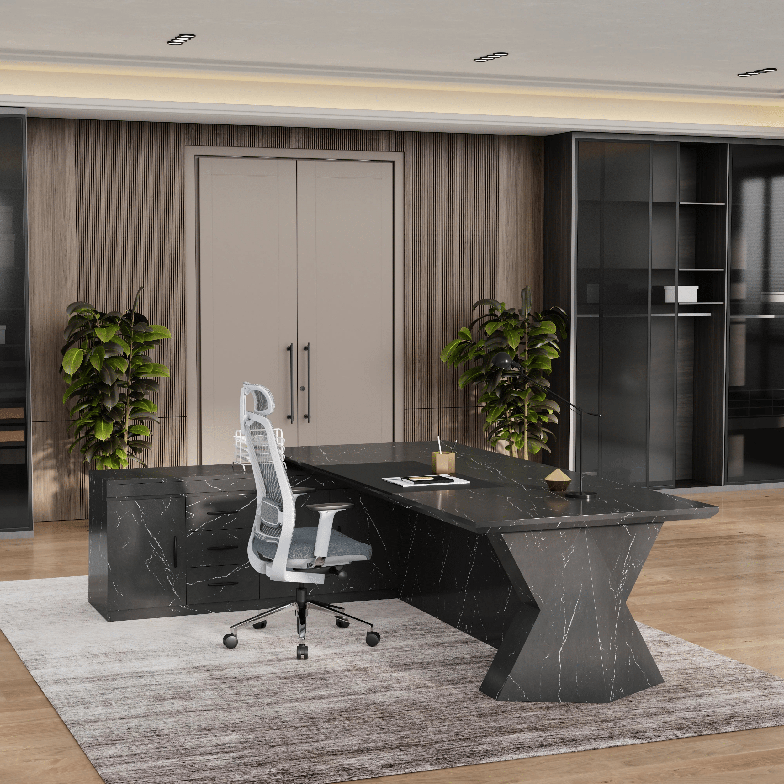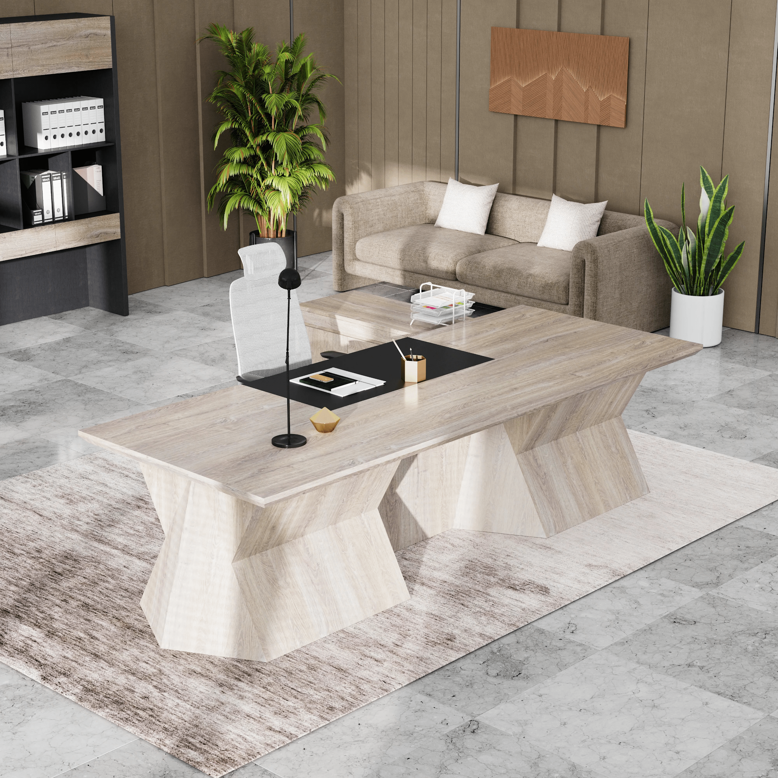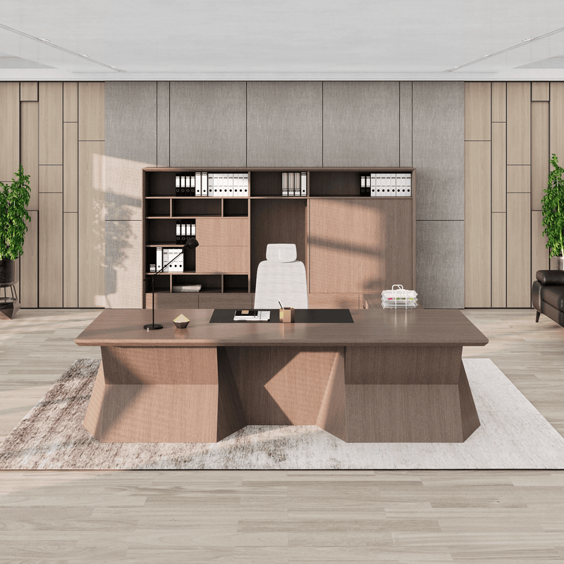 This executive desk offers generous storage with three drawers for stationery and daily-use items, along with three closed cabinets that provide secure, concealed storage for files, tech accessories, or personal items. The expansive desktop and legroom ensure ample working space for up to two users or one user with auxiliary equipment.