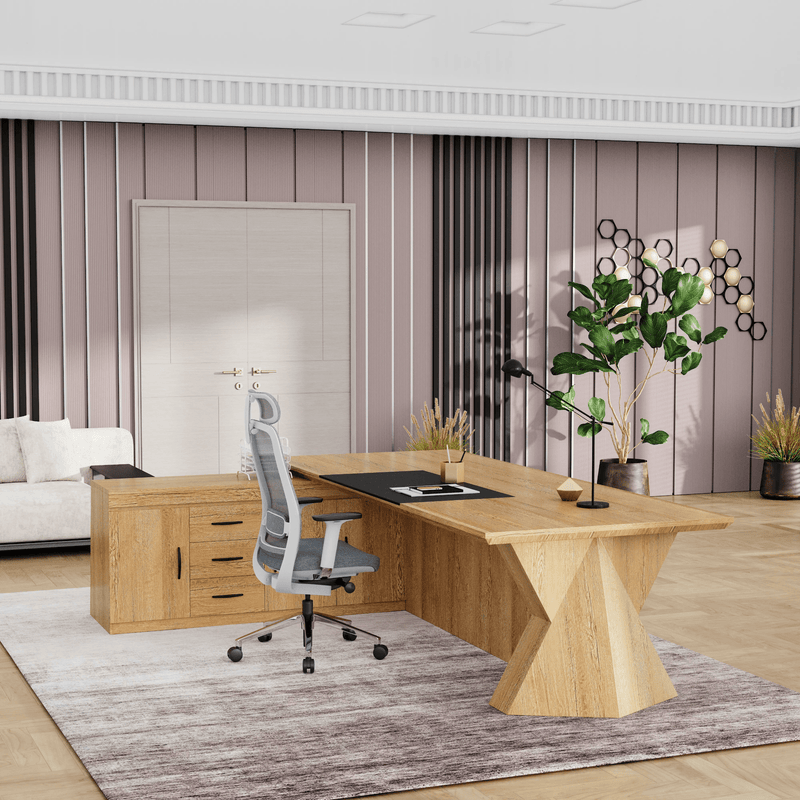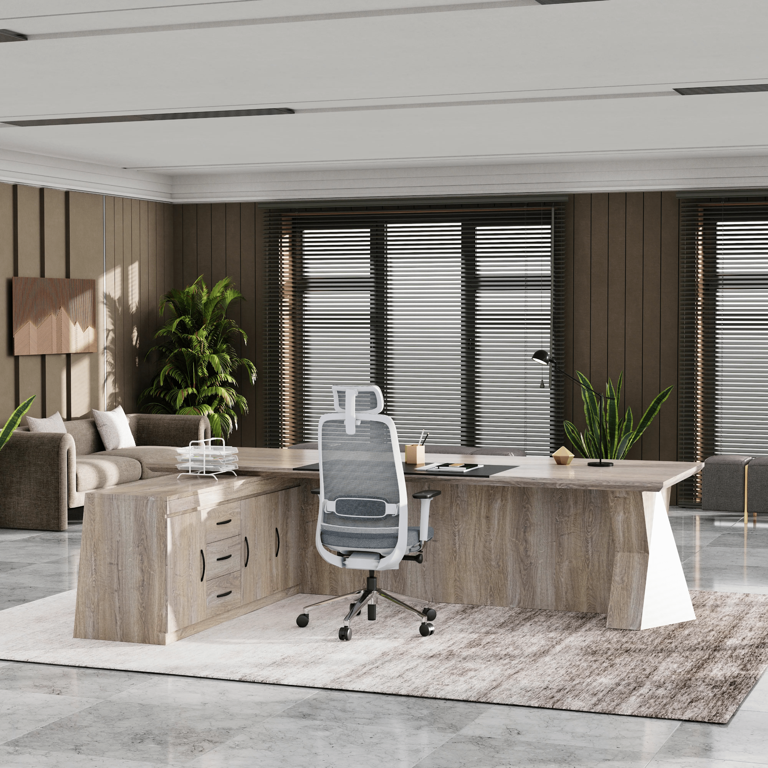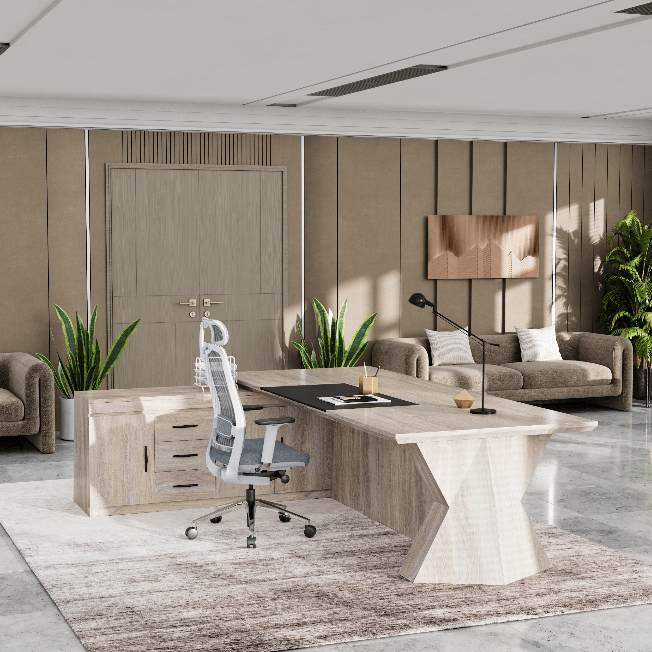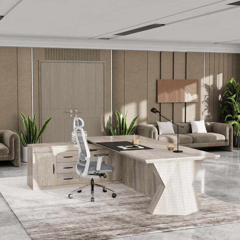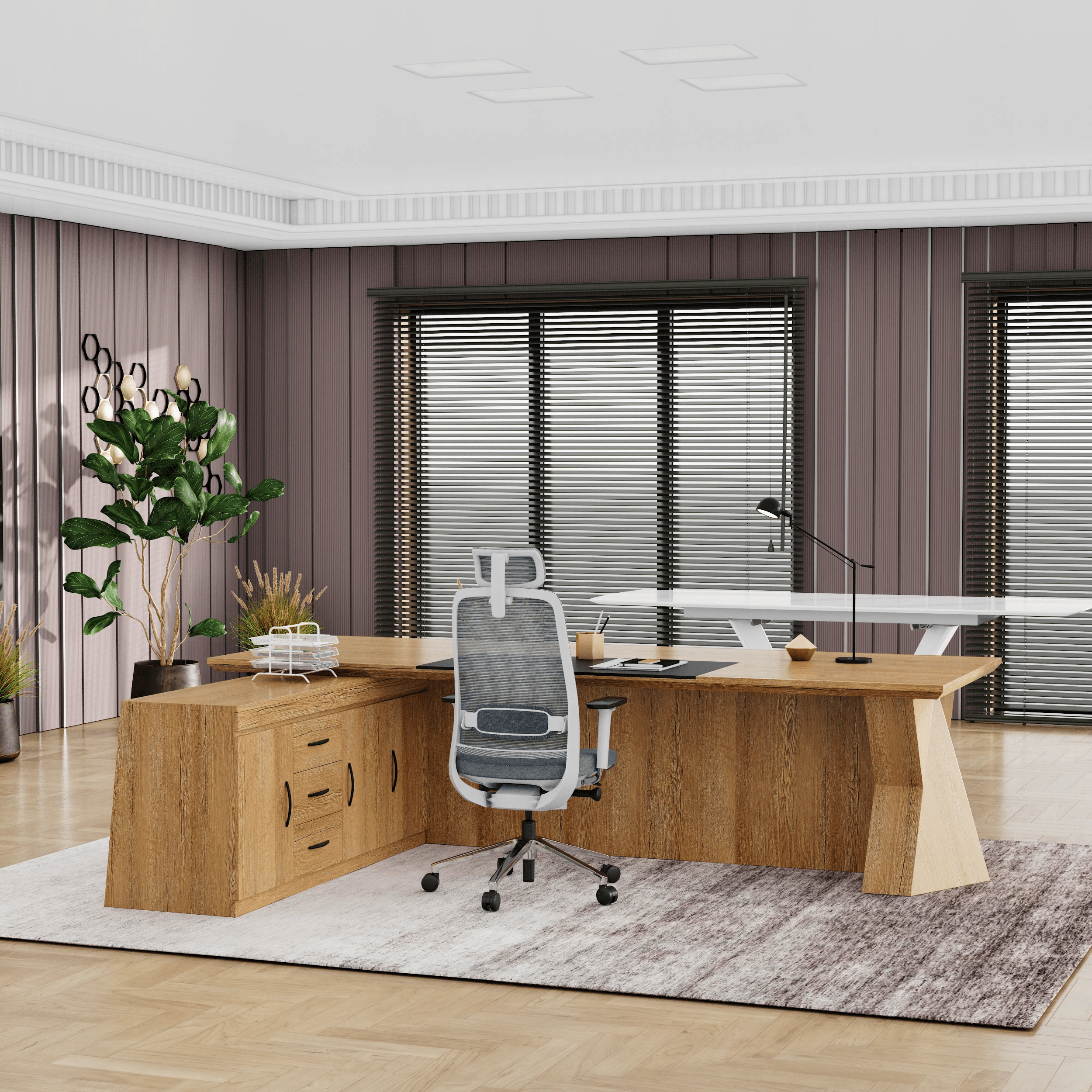 The Cupid Executive Desk from the Essence Mooreen Collection is a sophisticated workspace solution designed to elevate both the visual and functional quality of modern offices. Constructed from a durable MDF base layered with premium-grade MFC, the desk delivers an excellent balance of structure and surface resilience. This combination not only offers a refined matte texture but also provides enhanced resistance to moisture, heat, impact, and scratches, ensuring the desk retains its polished appearance even with daily use.