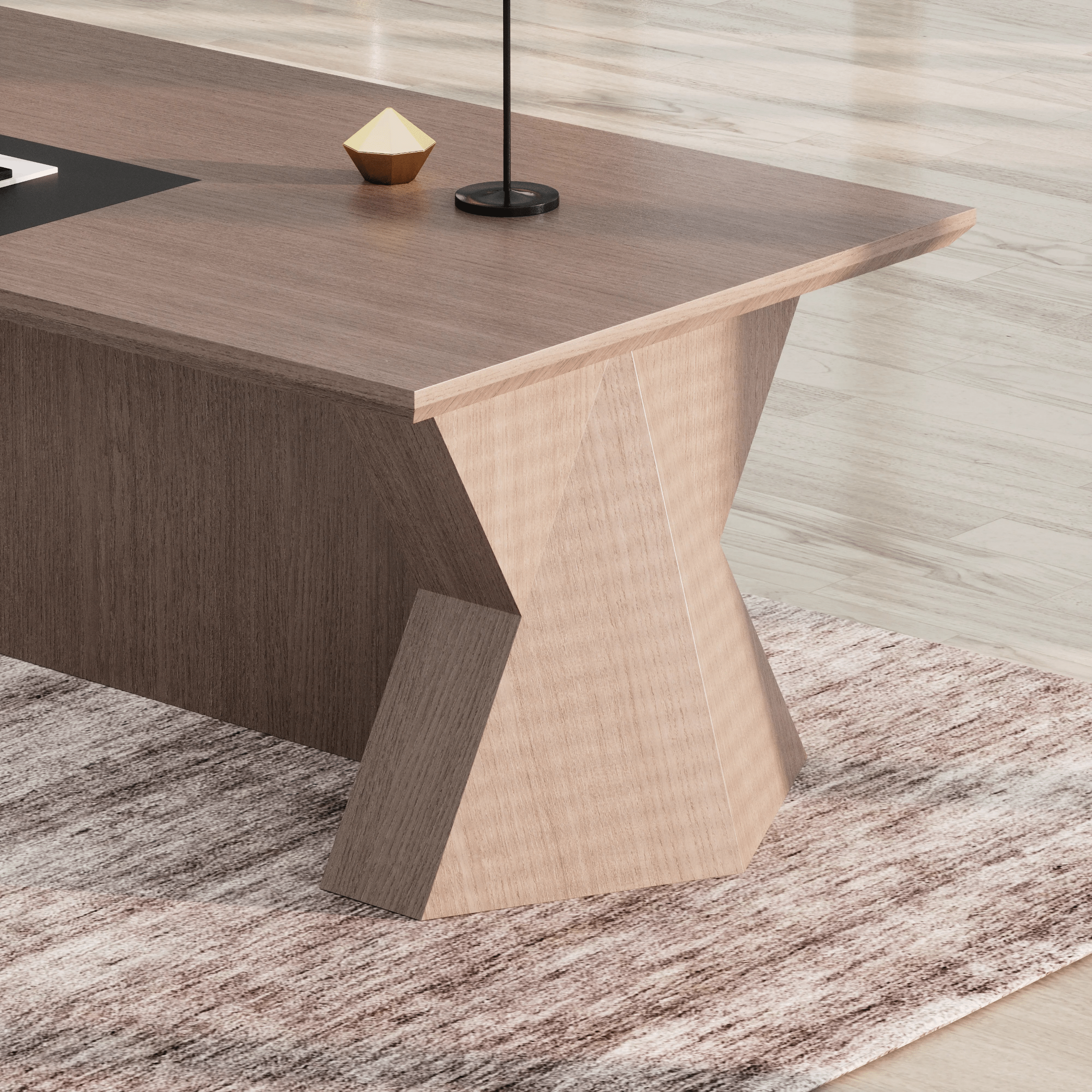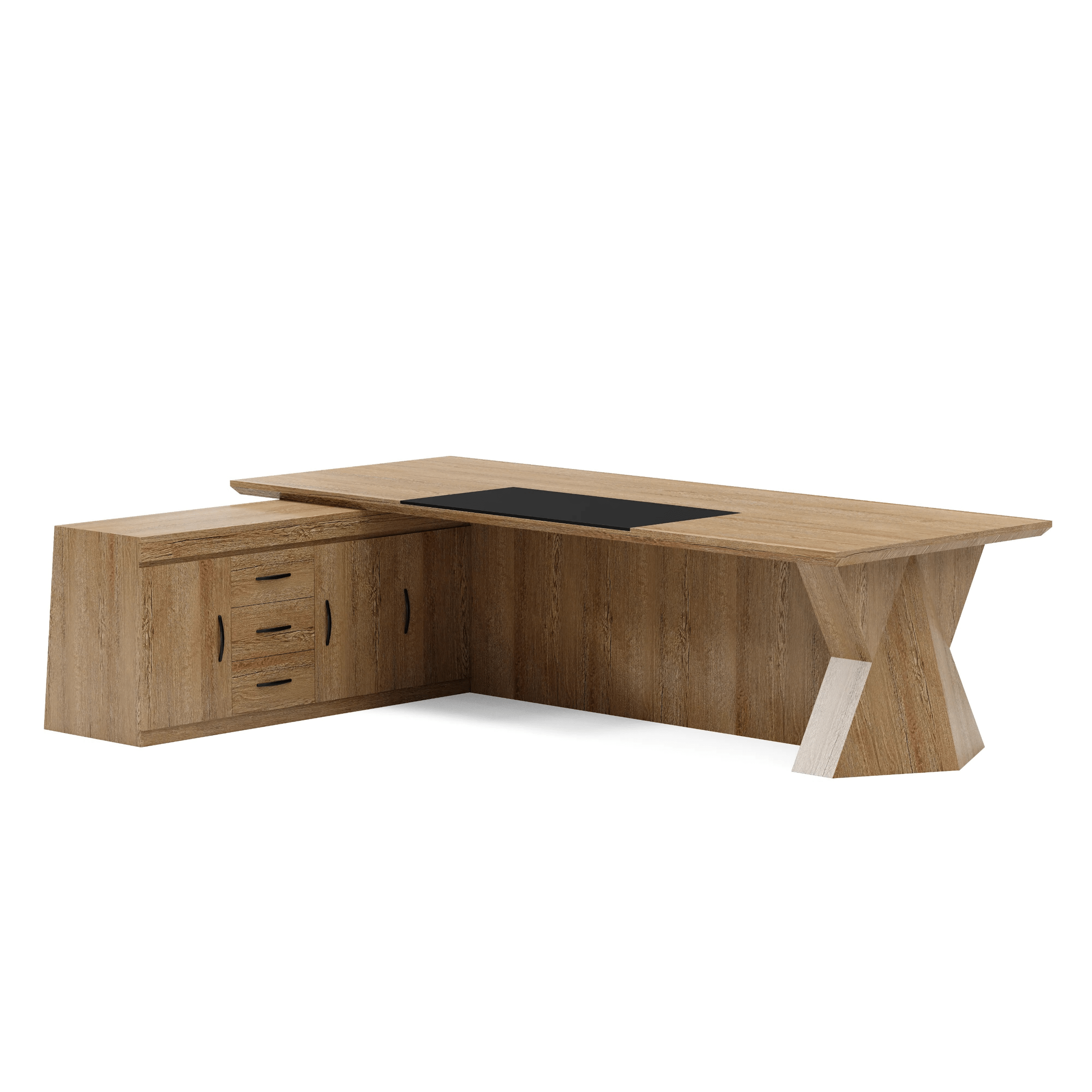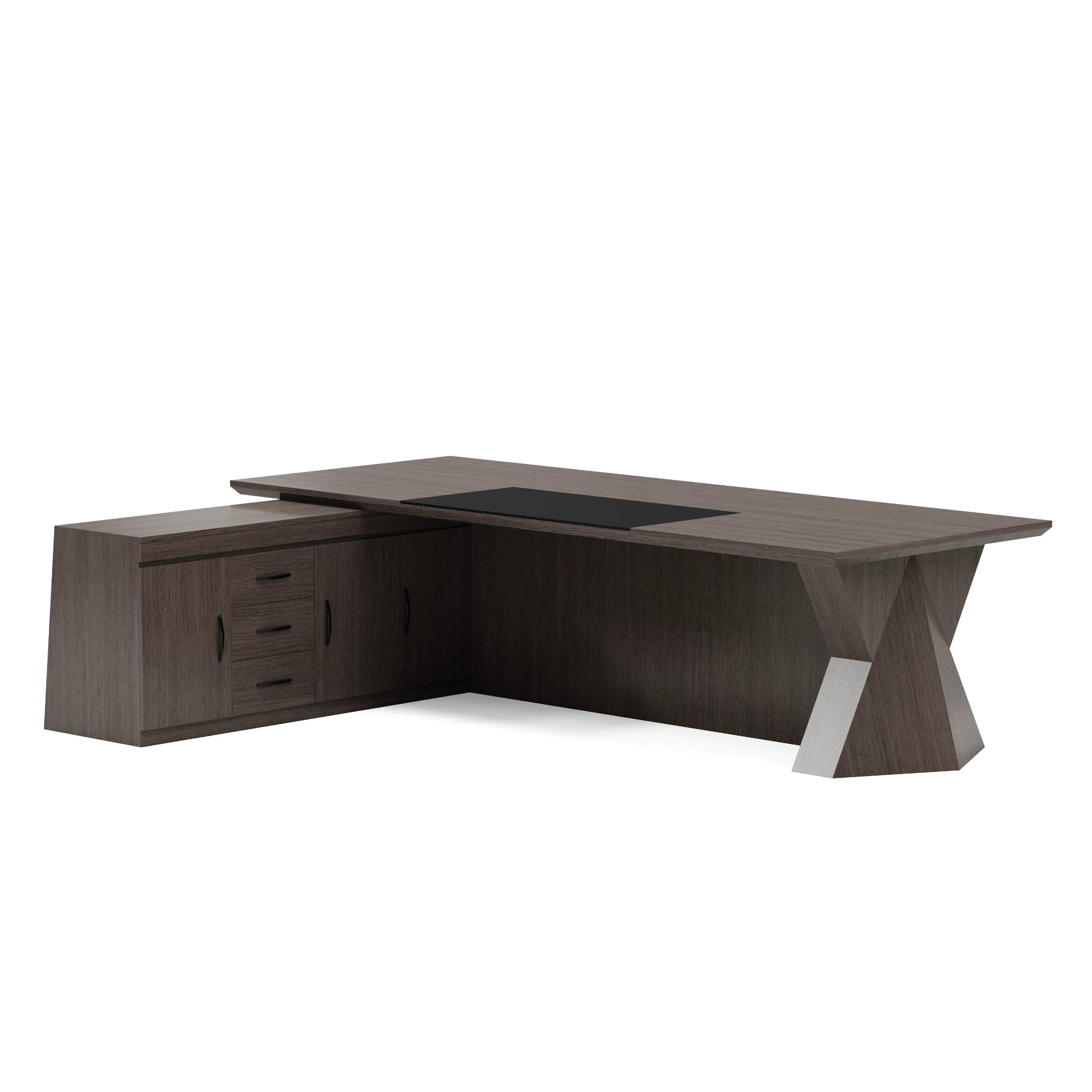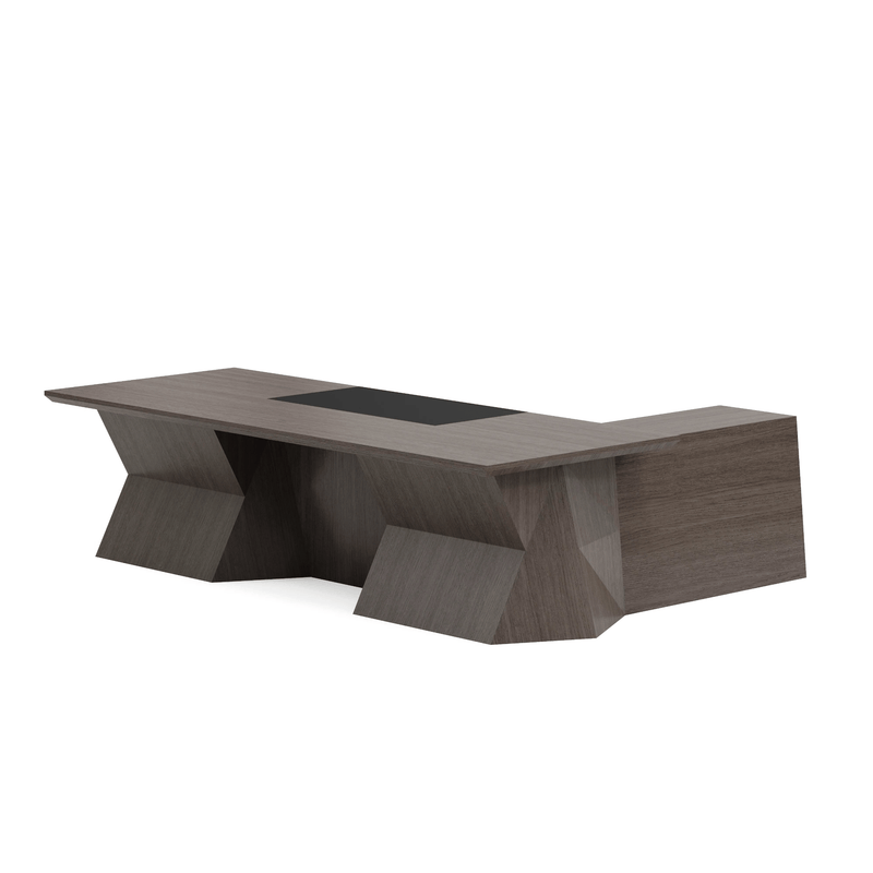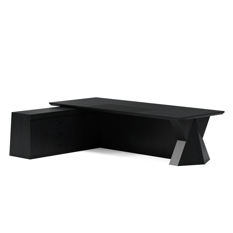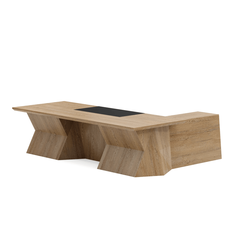 The desktop is enhanced with a genuine leather inlay, offering a tactile writing surface while adding visual depth and a touch of luxury to the overall design. With interchangeable return orientation (left or right), the Cupid adapts to diverse room layouts and workflow preferences.