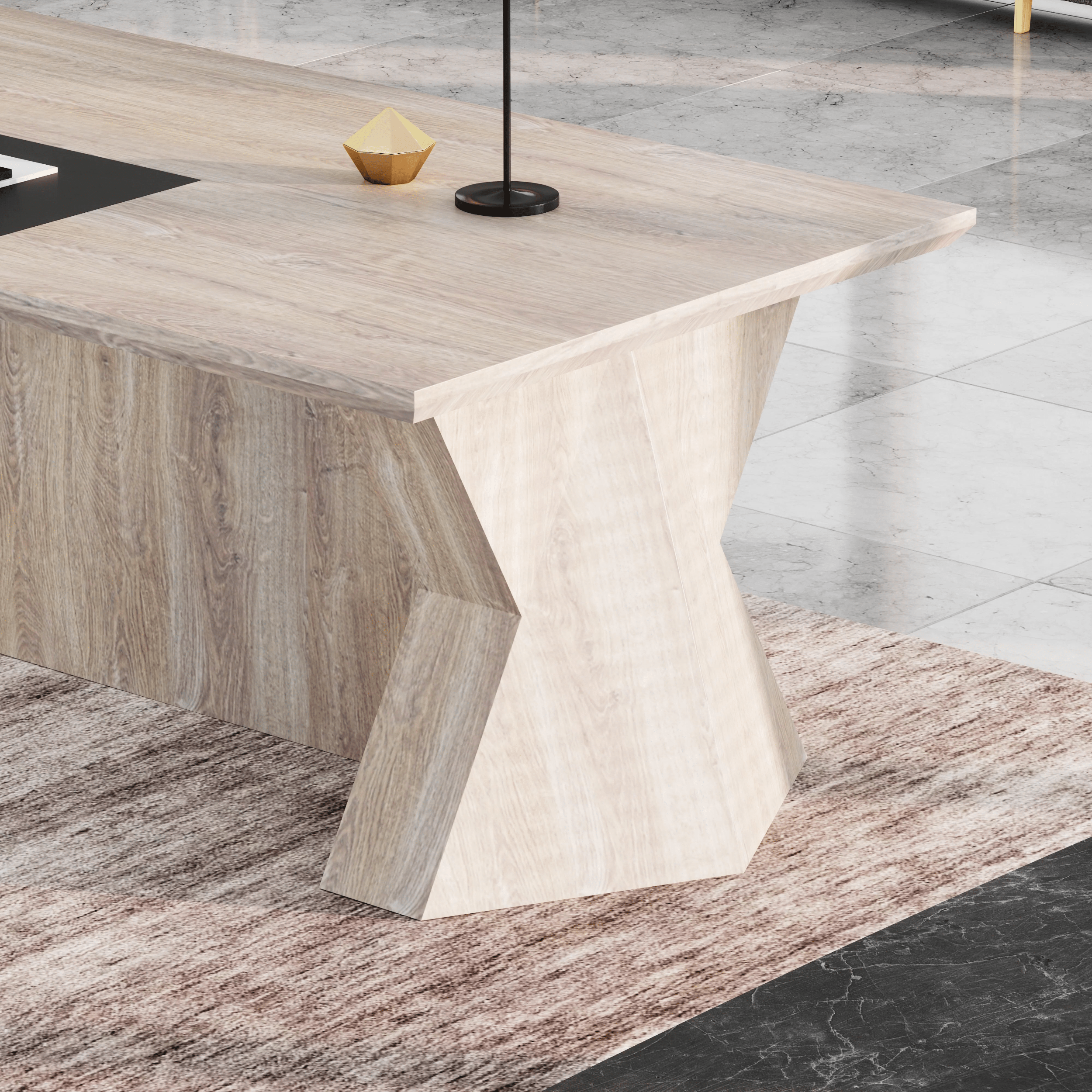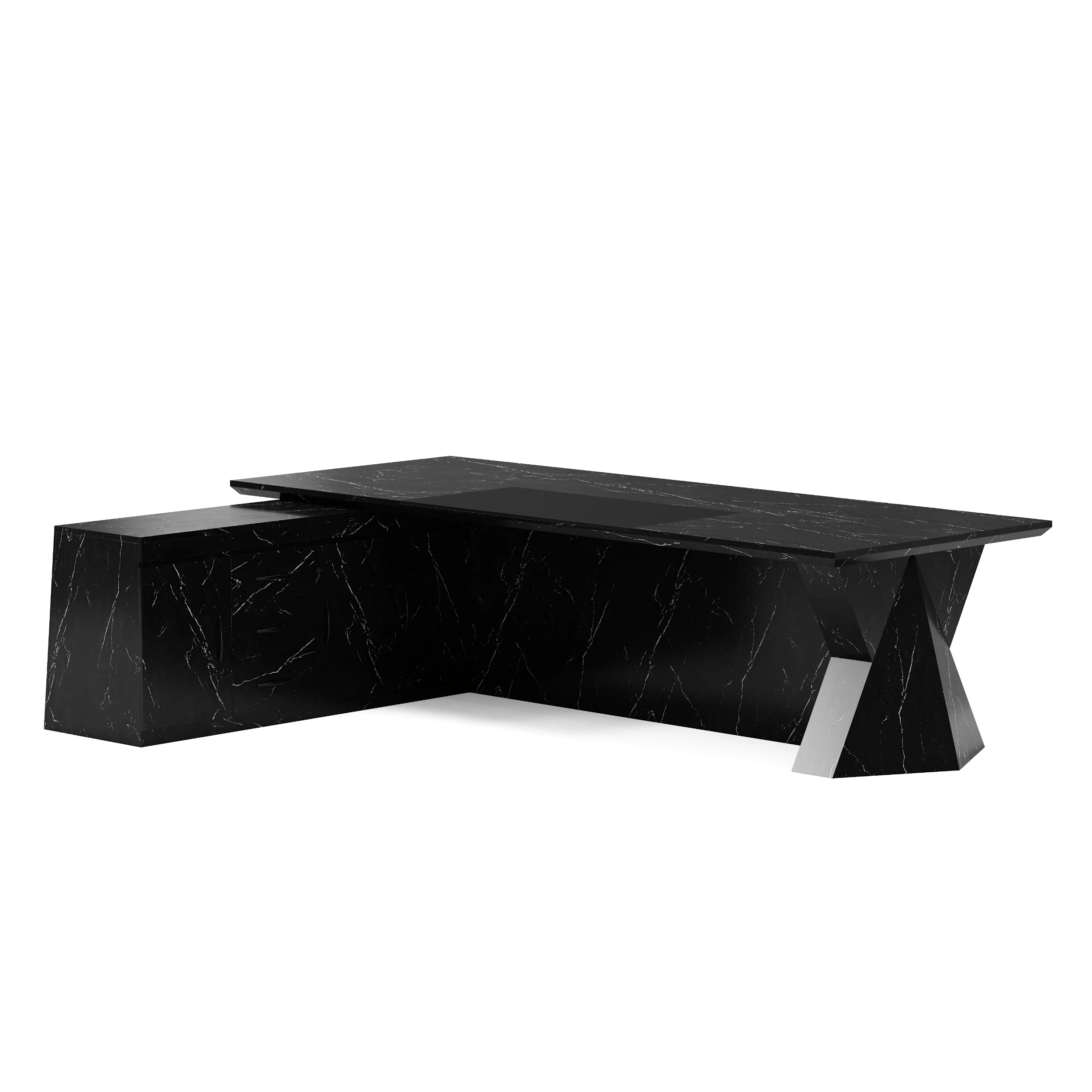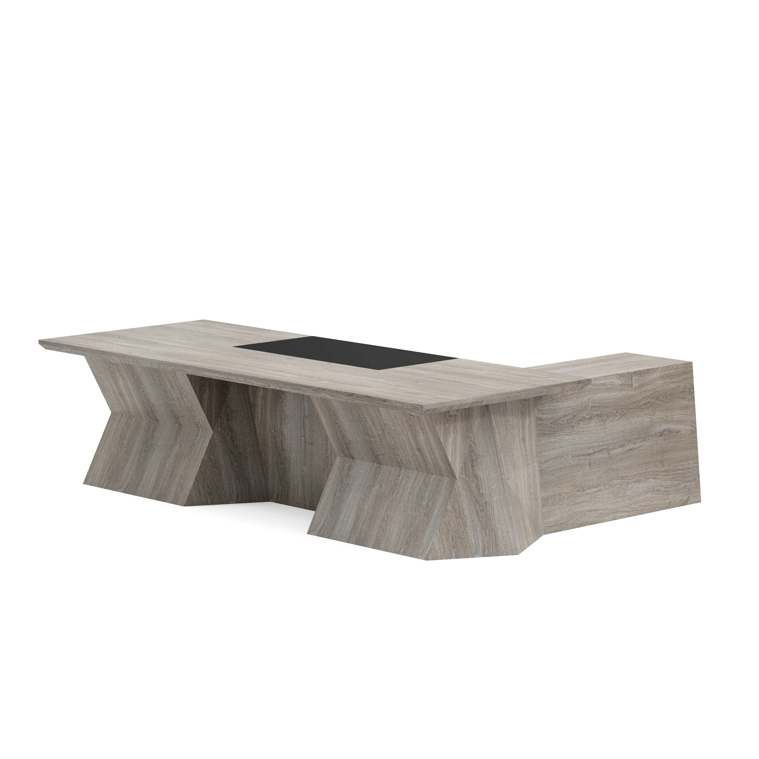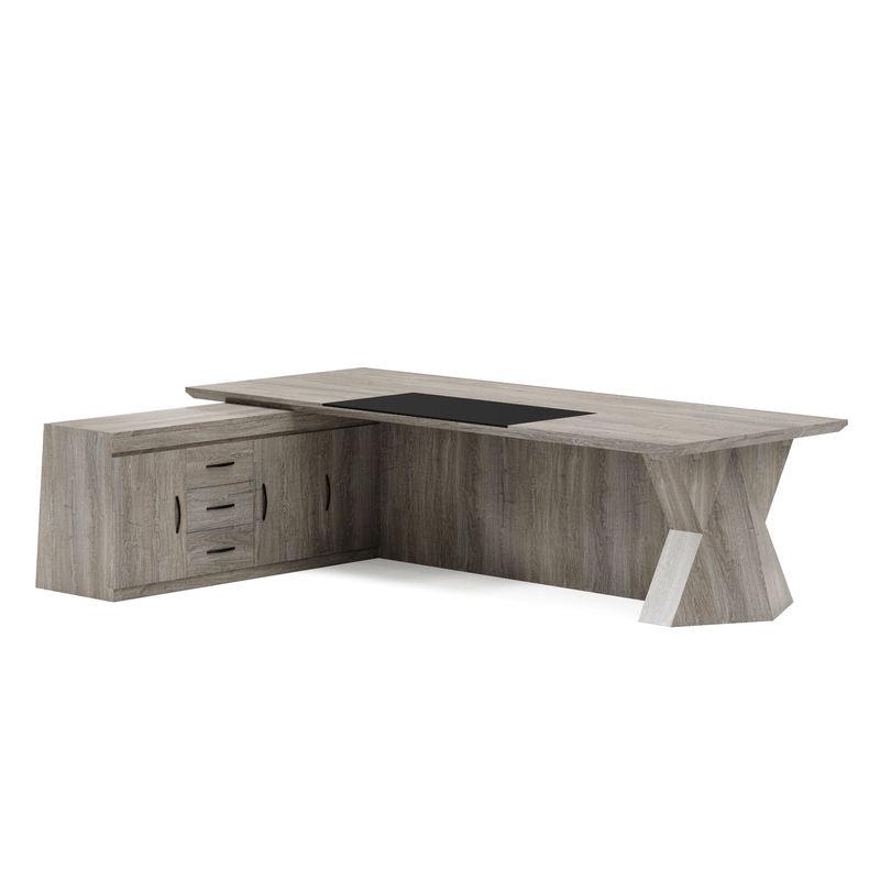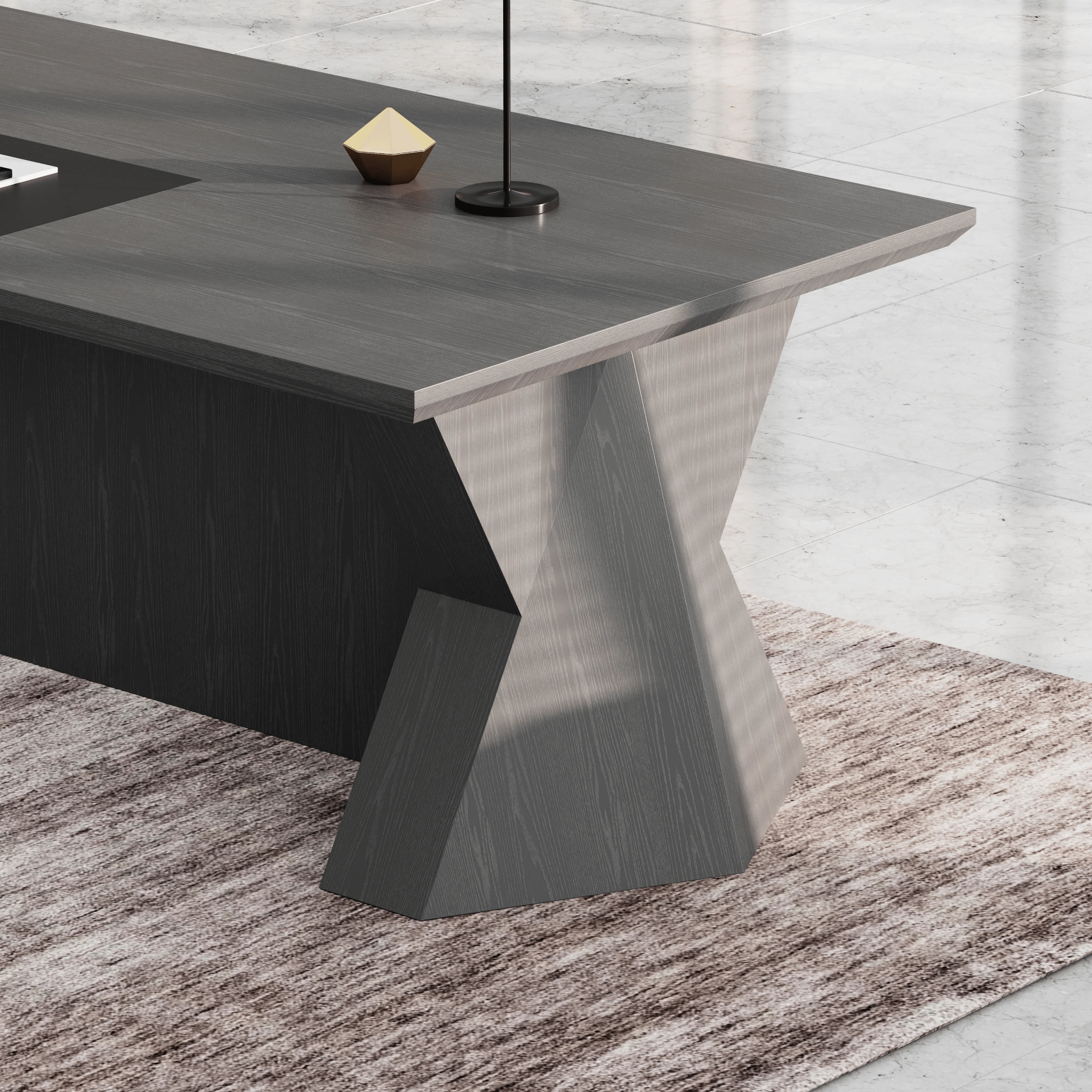 The desktop is enhanced with a genuine leather inlay, offering a tactile writing surface while adding visual depth and a touch of luxury to the overall design. With interchangeable return orientation (left or right), the Cupid adapts to diverse room layouts and workflow preferences.