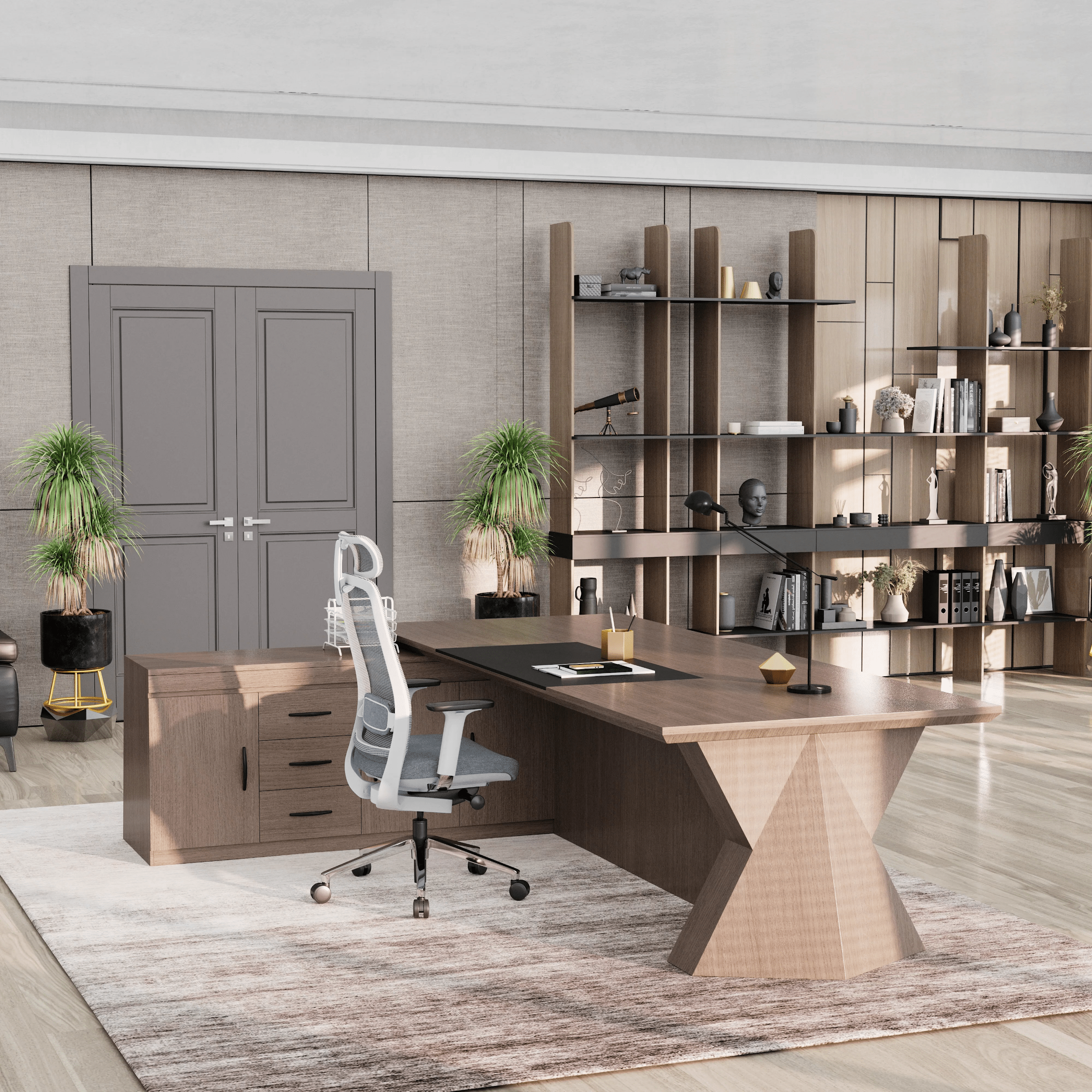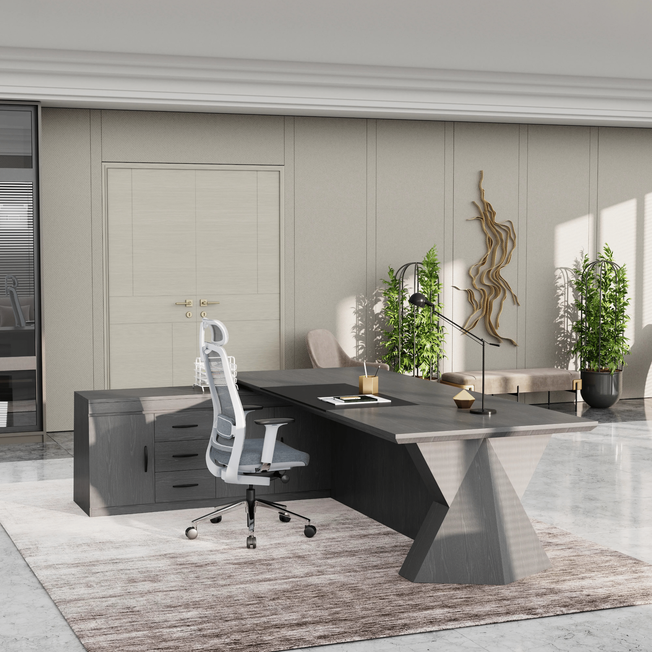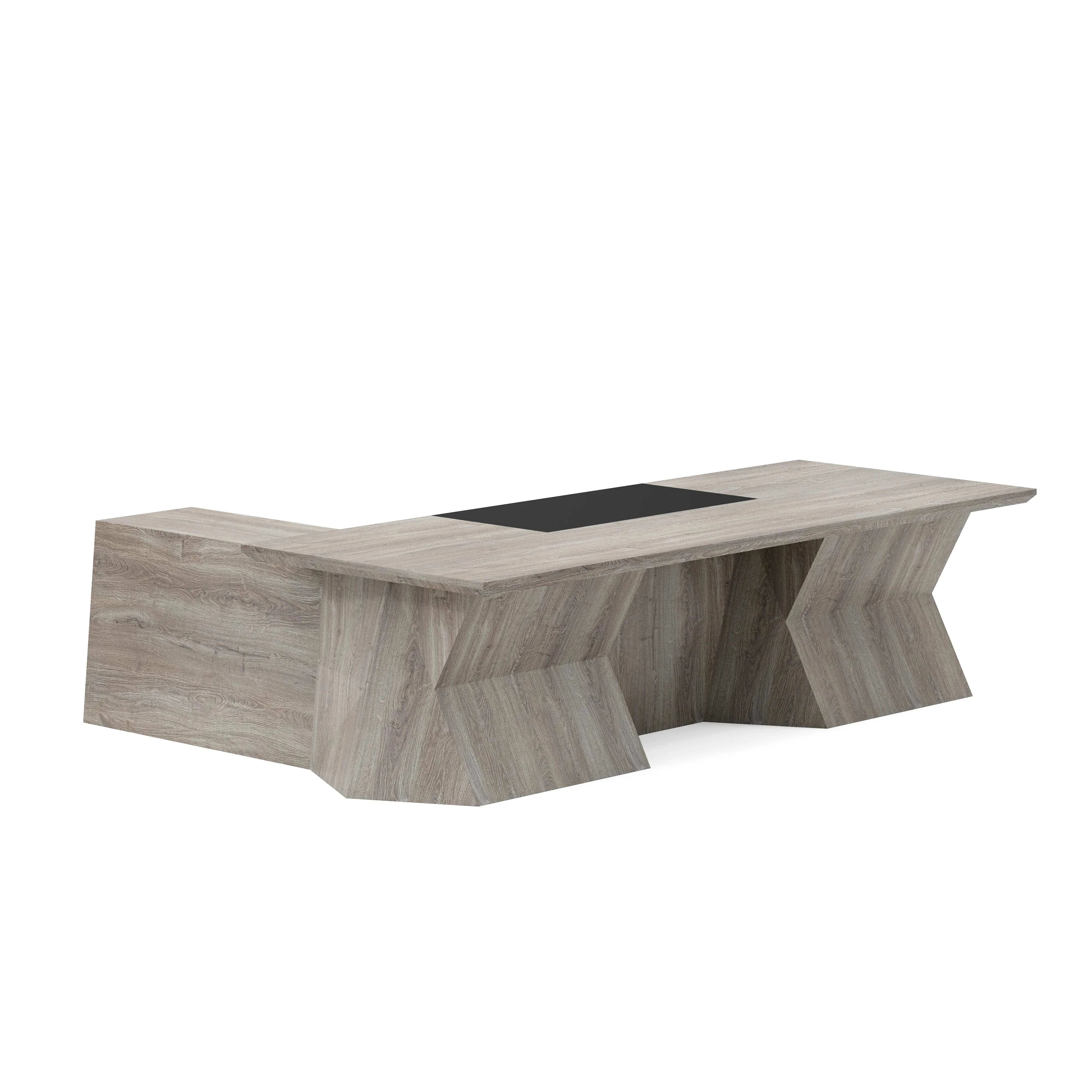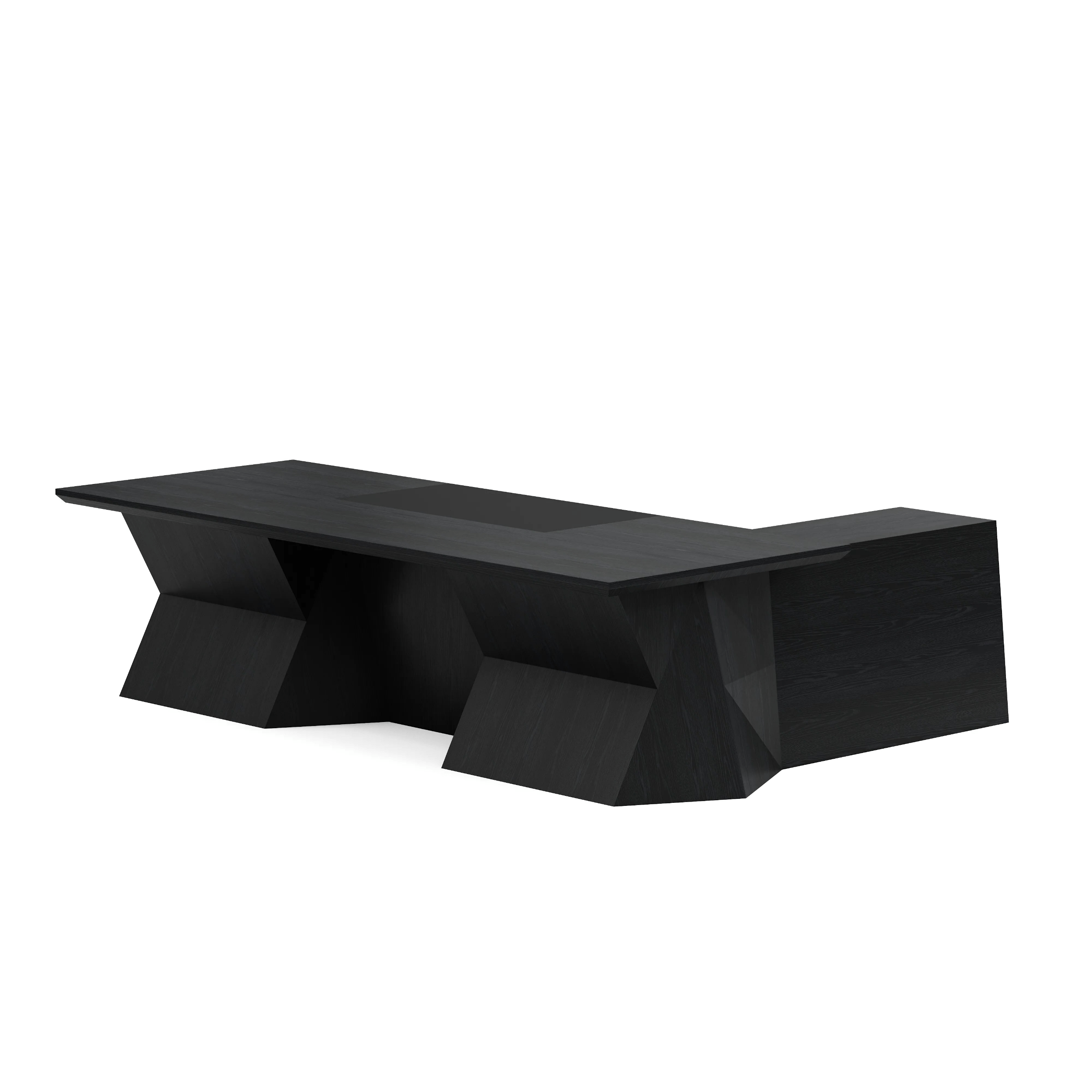 The desktop is enhanced with a genuine leather inlay, offering a tactile writing surface while adding visual depth and a touch of luxury to the overall design. With interchangeable return orientation (left or right), the Cupid adapts to diverse room layouts and workflow preferences.