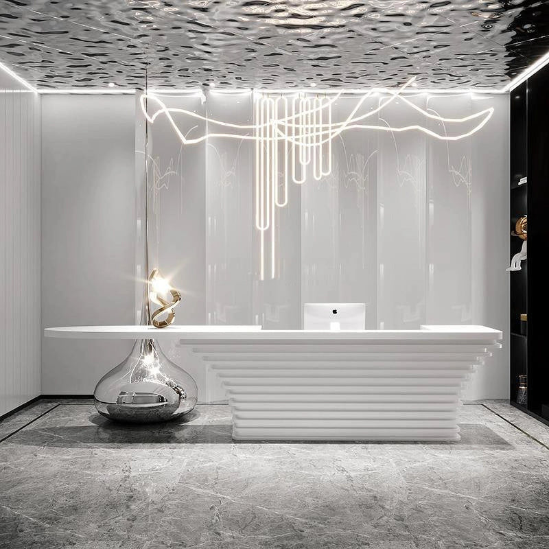 Crafted from E1-grade MDF coated with a high-quality lacquer, the desk ensures structural durability and stability while meeting environmental safety standards for low formaldehyde emissions. The lacquer finish enhances surface resistance against wear, moisture, and staining, making it suitable for high-use reception areas. Its gloss white exterior delivers a clean, luminous sheen that reflects light beautifully and gives the desk a polished, professional presence.