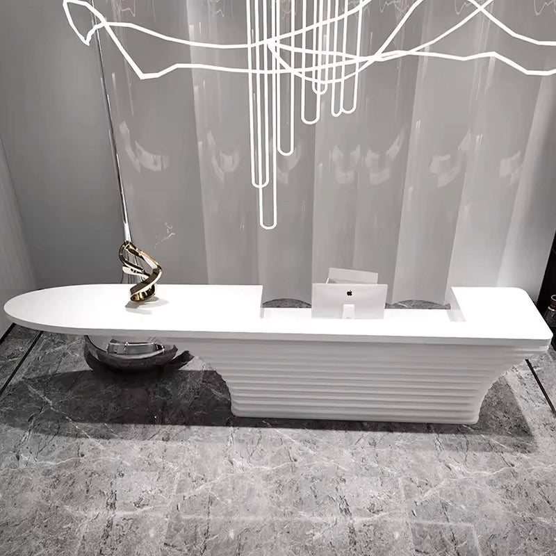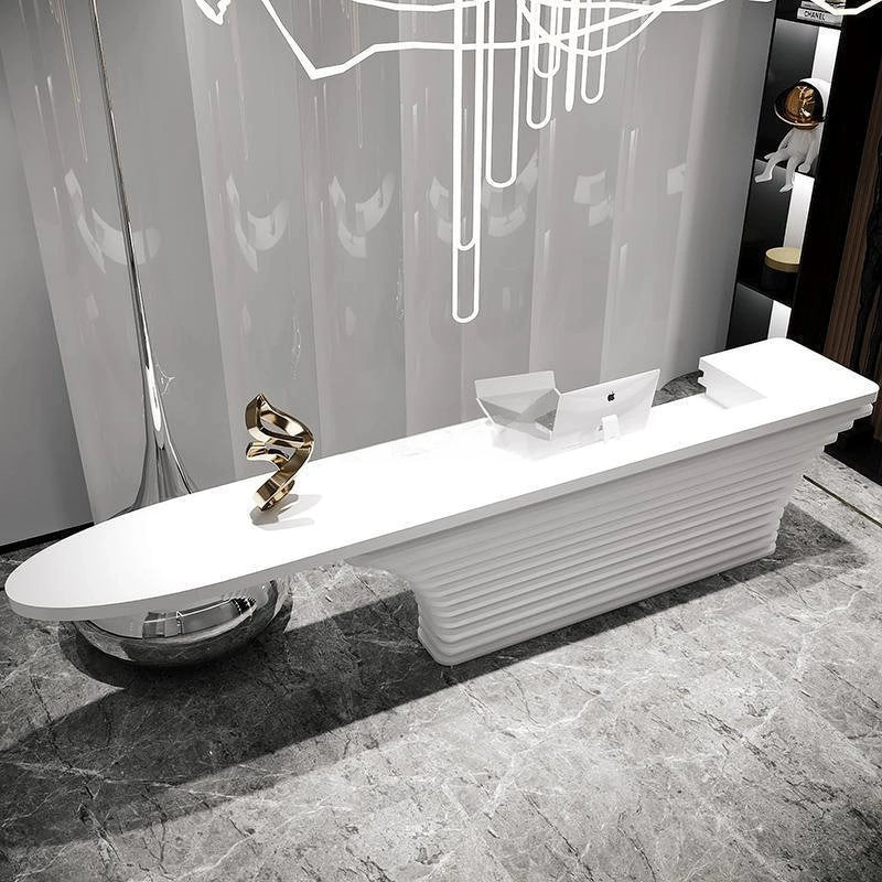 The desk features a layered, tiered front profile composed of horizontal ridges that form a striking stepped facade. These cascading ridges add visual texture and architectural rhythm to the overall silhouette. On one side, a sculpted teardrop pedestal base offers a striking focal point that balances the desk’s mass with fluid, modern elegance. This combination of bold lines and sculptural forms creates a truly artistic reception area centerpiece.