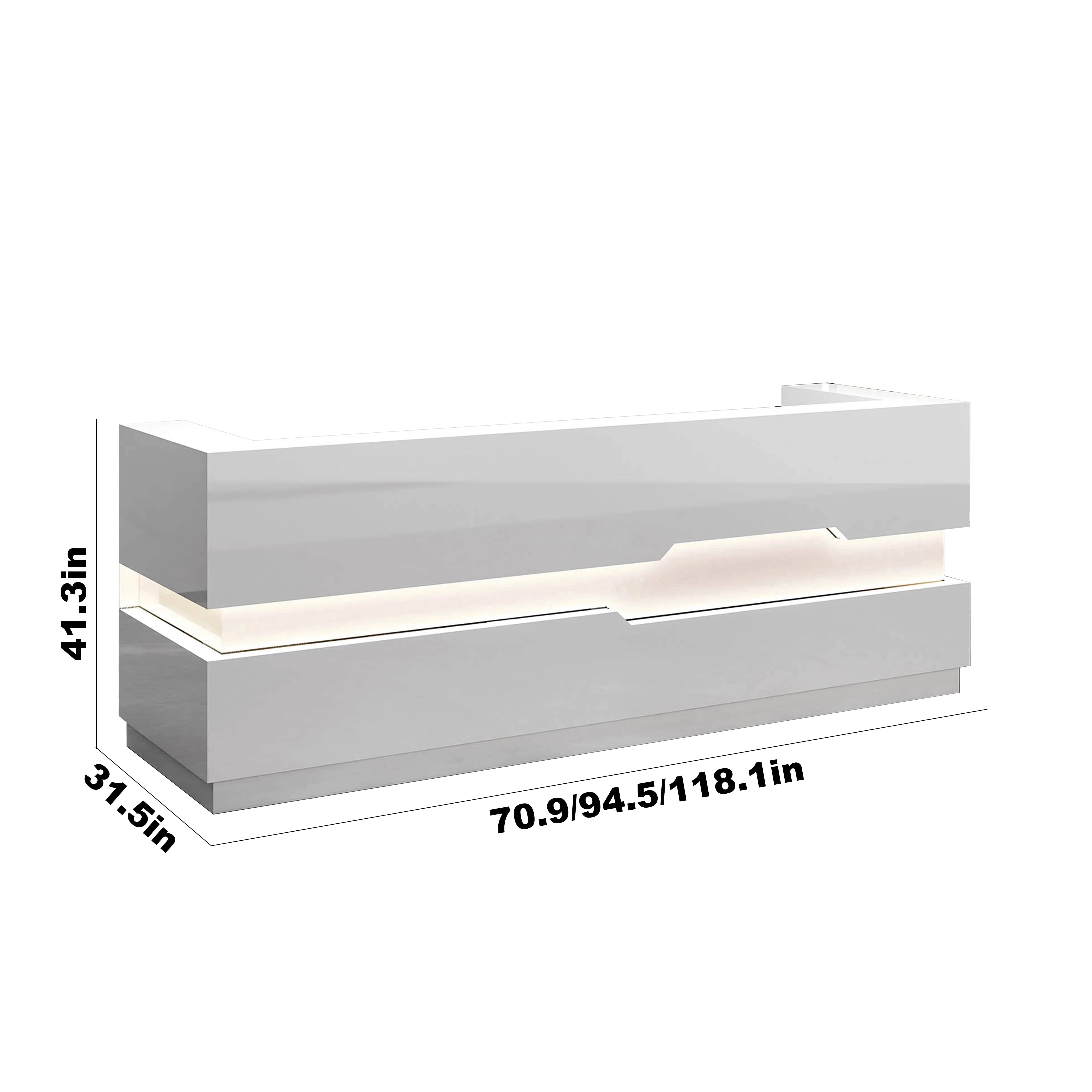Geometric paneling on the front facade adds dimensionality and architectural interest to the structure, while embedded LED underlighting enhances visibility and elevates the atmosphere with a soft glow across the base of the desk.