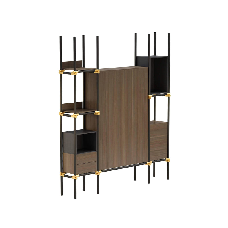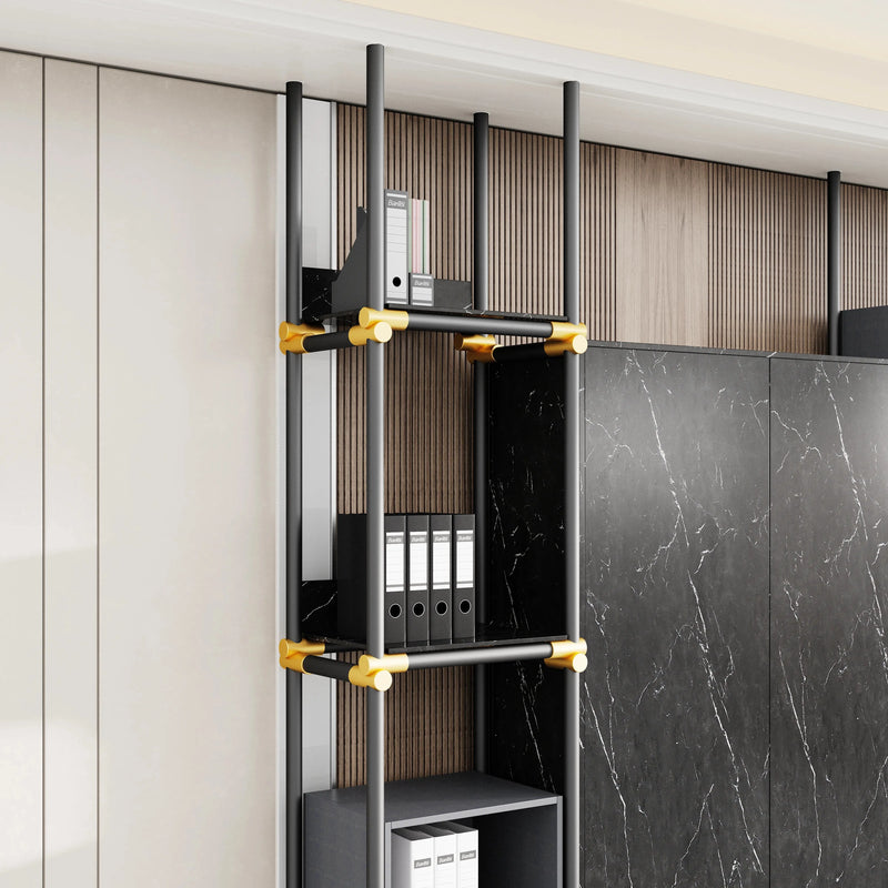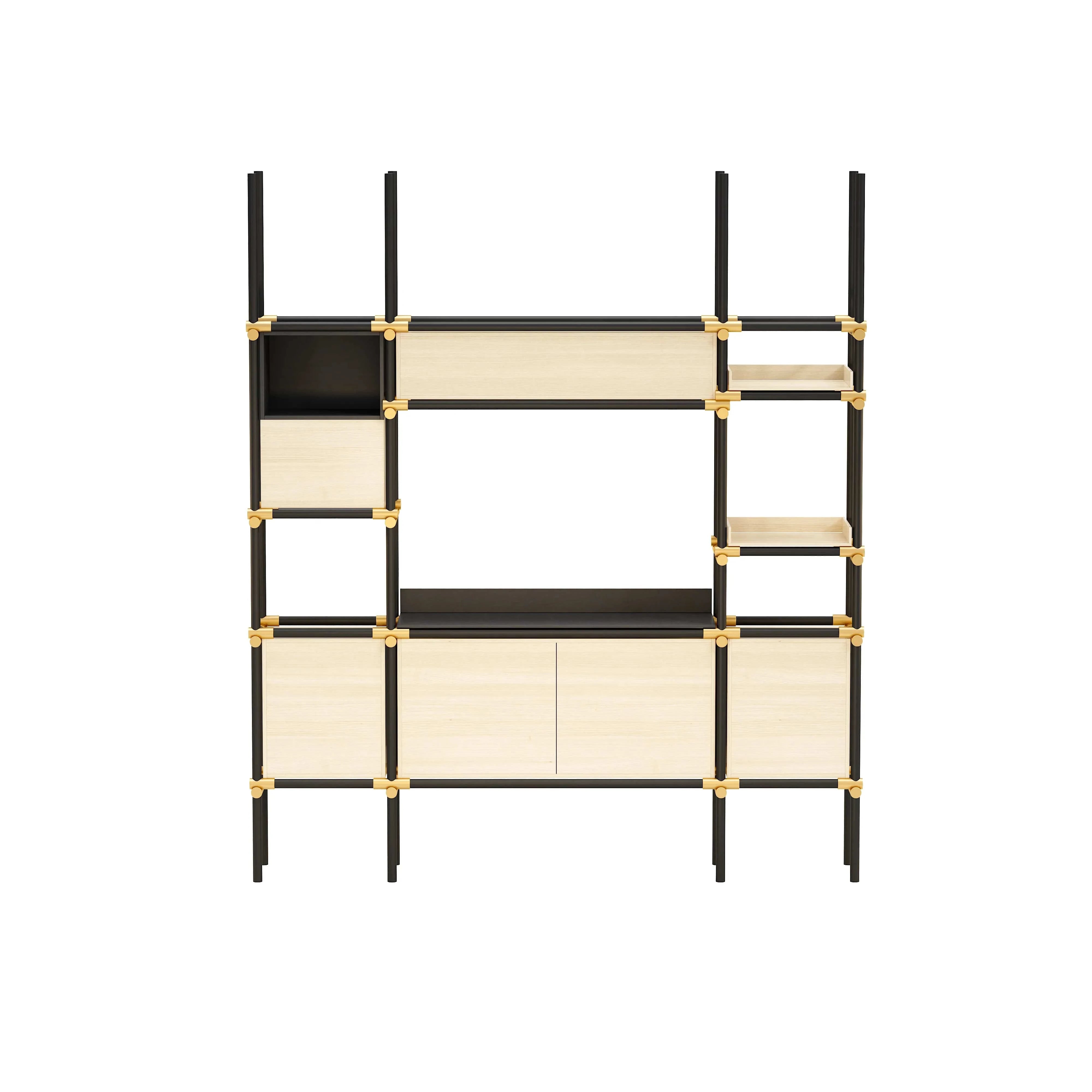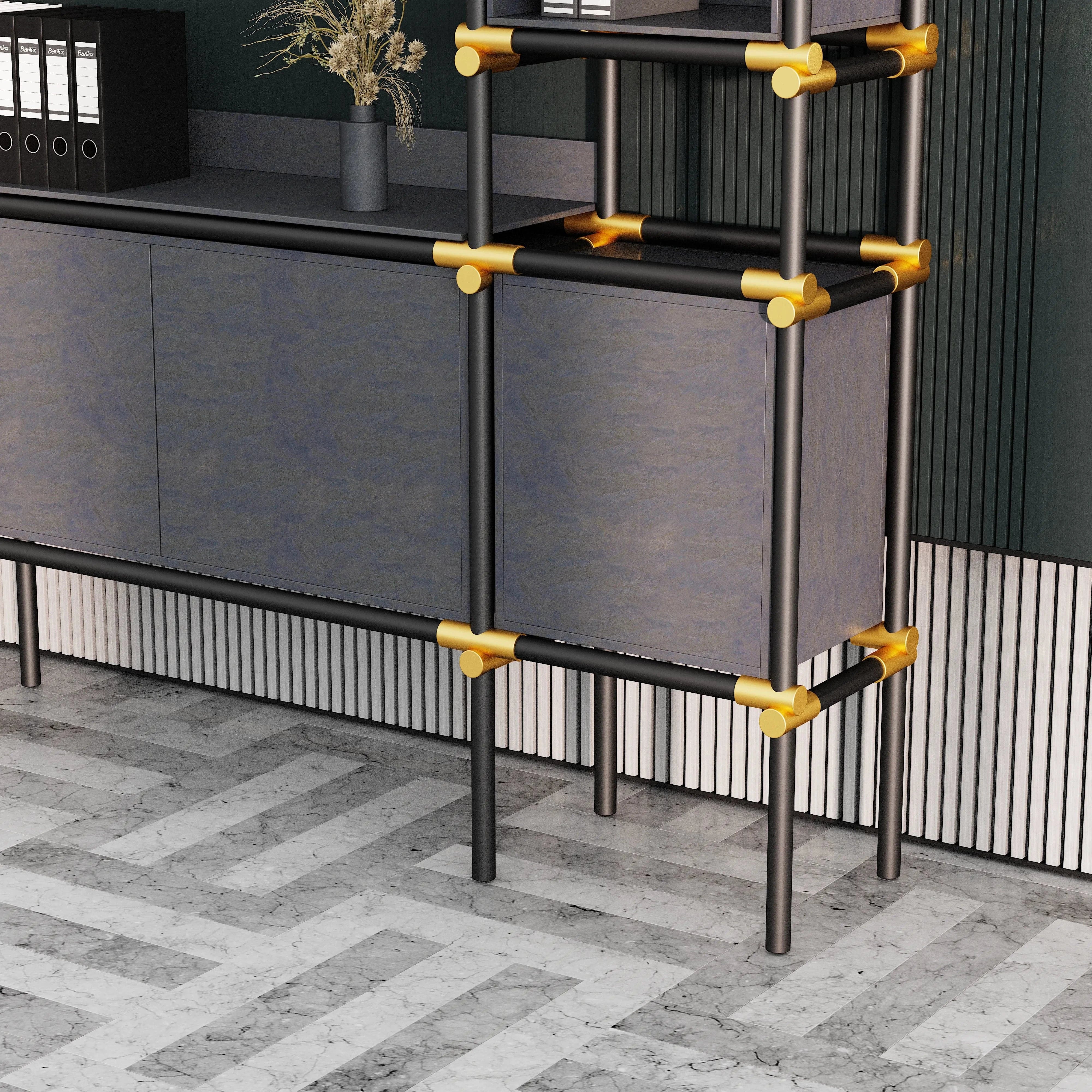 The design features vertical support risers that visually separate the upper shelving from the lower cabinet, creating a tiered effect that feels open yet grounded. This combination of elevation and contrast brings a contemporary edge to the structure while enhancing the sense of lightness in the room. Storage is split between open shelving and closed cabinets, allowing for flexible organization that blends accessibility and visual clarity.