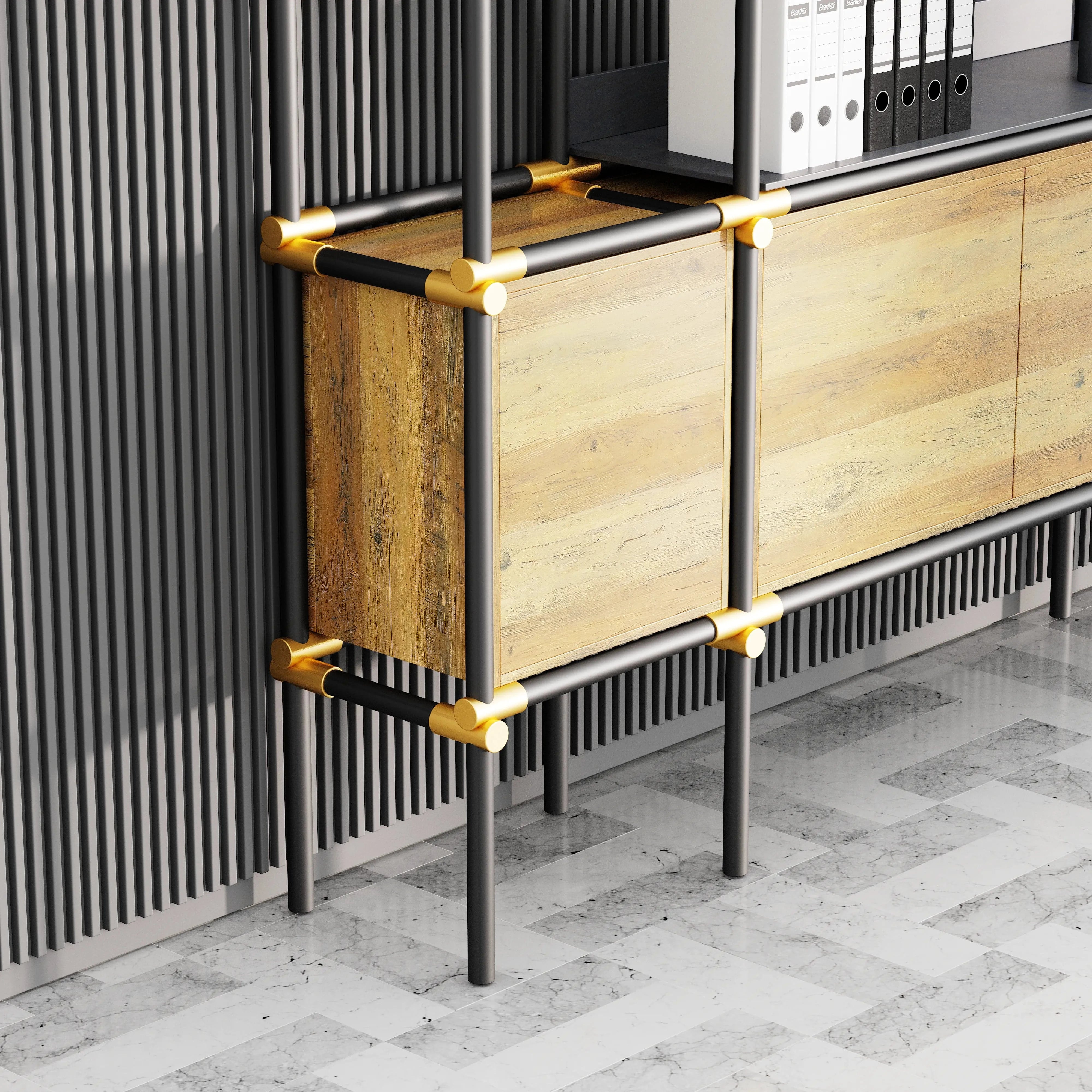 - Design Features: Elevated upper shelving with modern support posts, open and closed storage configuration