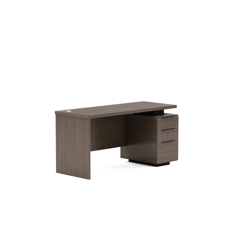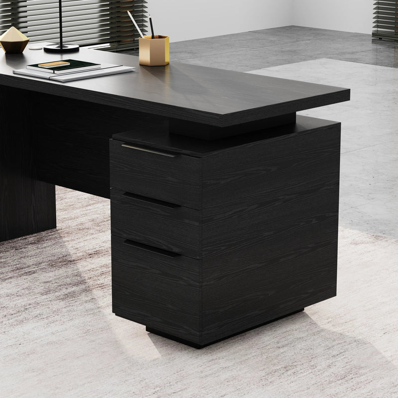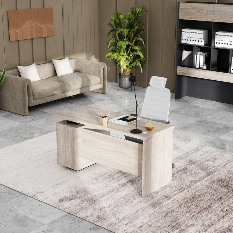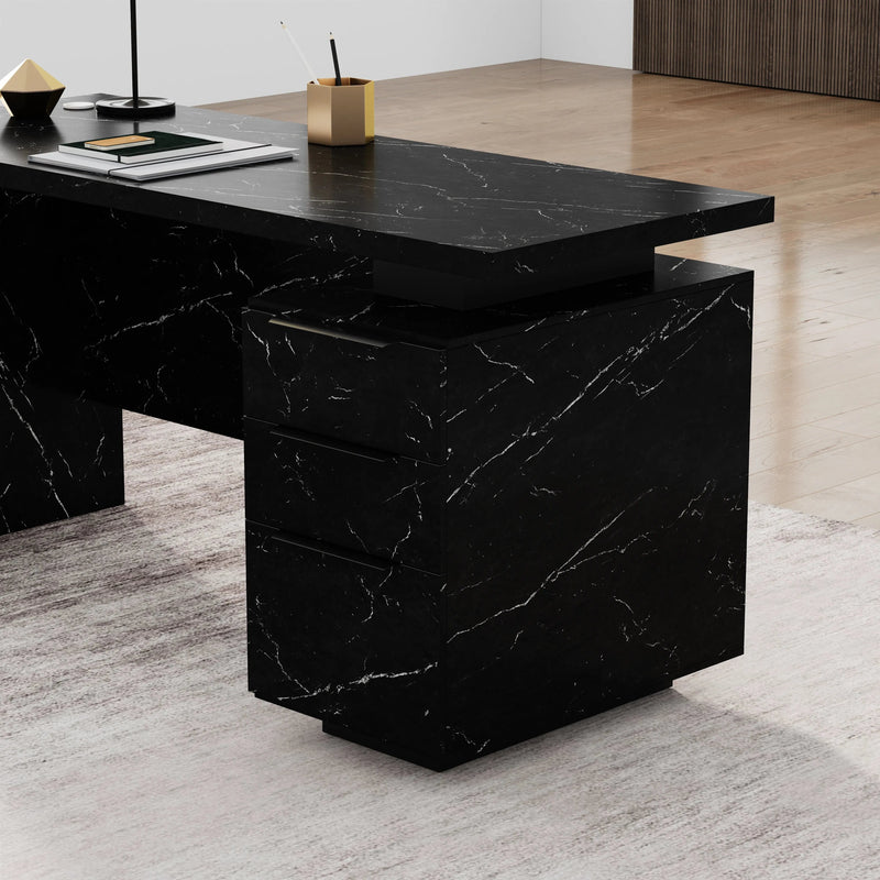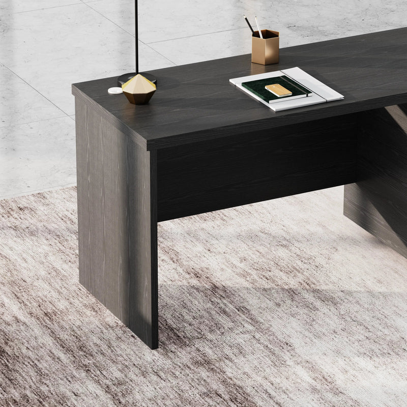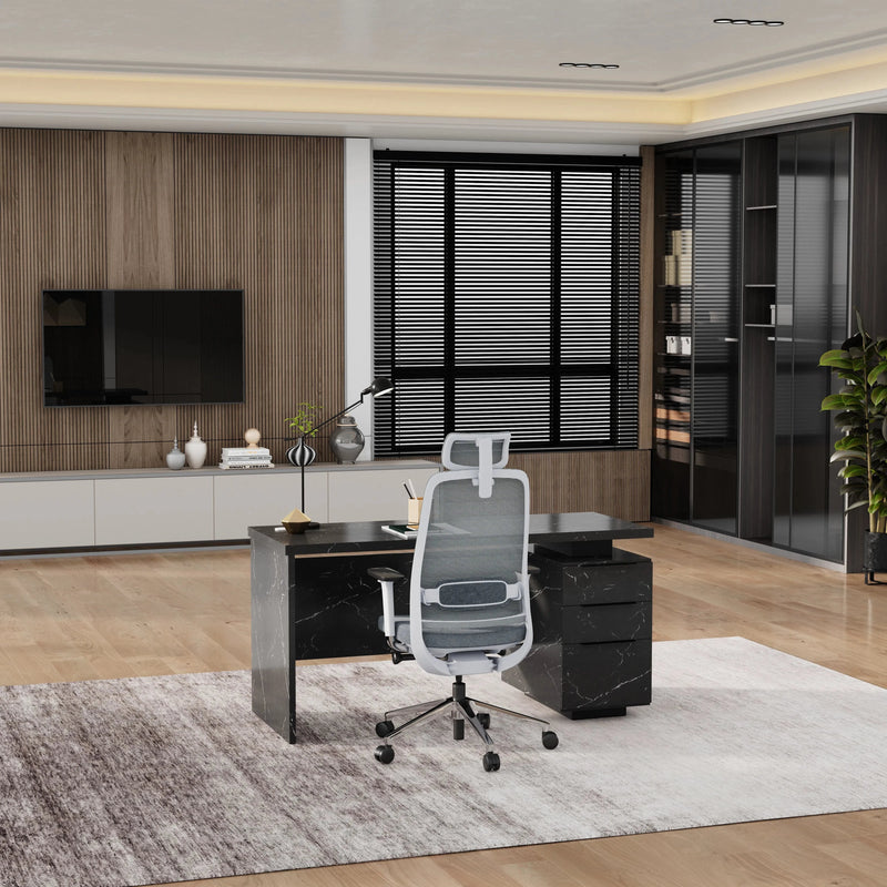 At the front, a privacy beveled slate provides subtle visual shielding and reinforces the desk's overall structure. The layout is minimal yet practical, offering three drawers for organizing essential documents, supplies, and personal items. Its compact 55-inch width fits easily into tighter floor plans, shared workspaces, or corner offices.