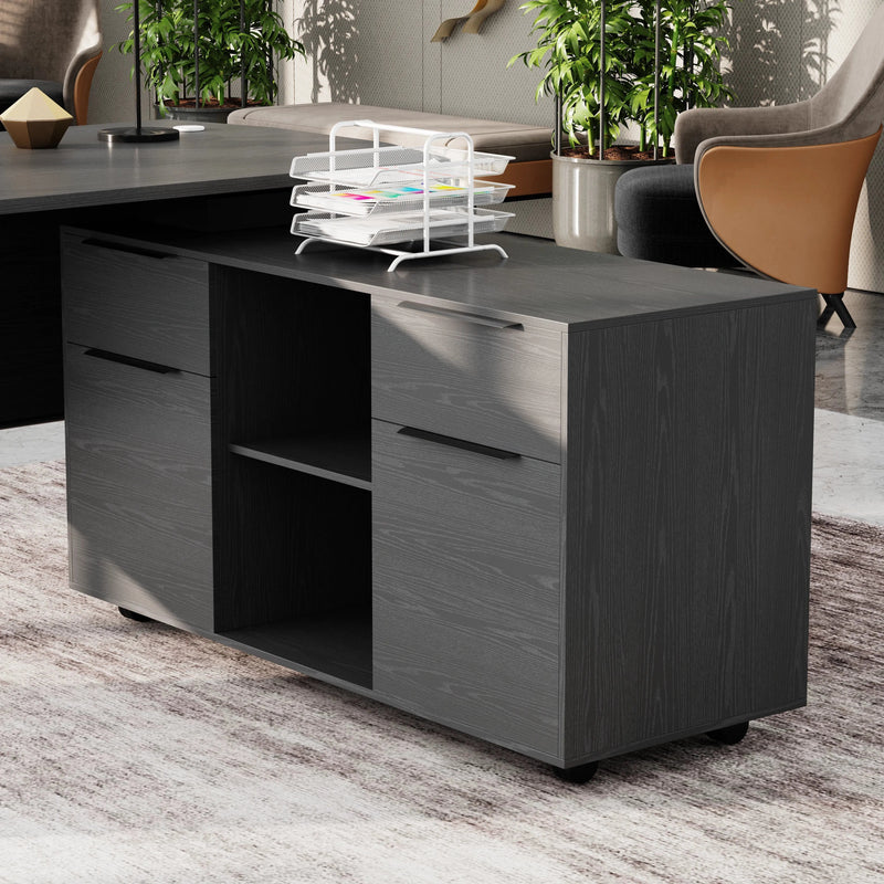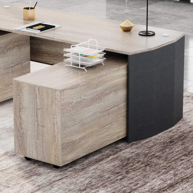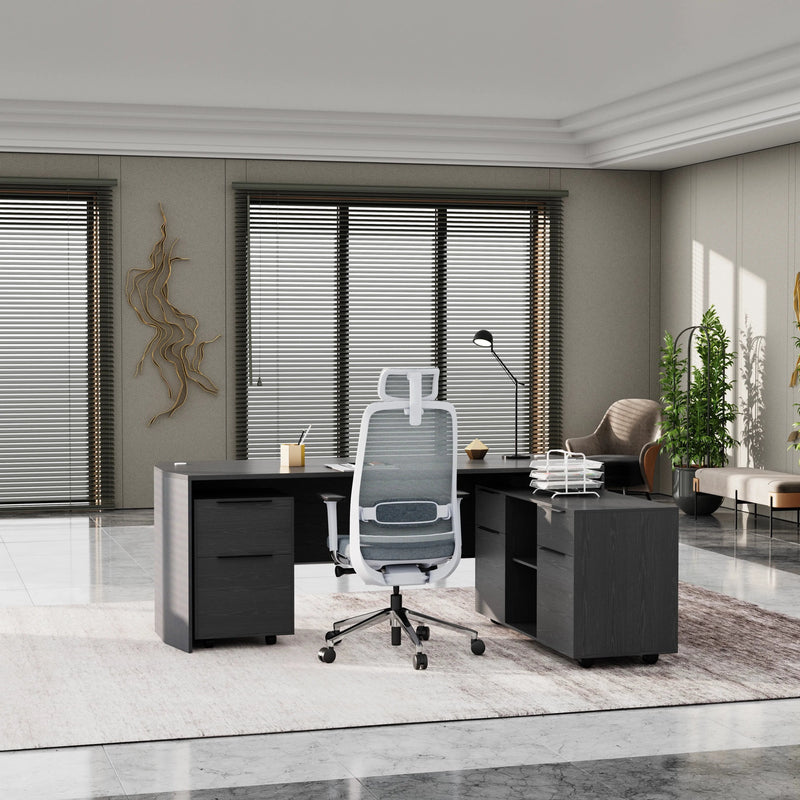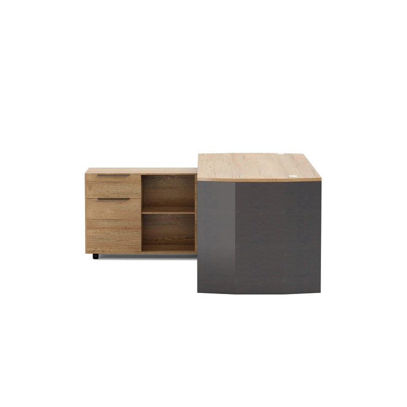 Functionally designed, the Jade features an interchangeable return, giving you flexibility to set up the layout for either left-handed or right-handed access. The desk includes four drawers, one of which is equipped with a secure lock for confidential storage, two enclosed cabinets for larger items, and two open shelving compartments for accessible organization.