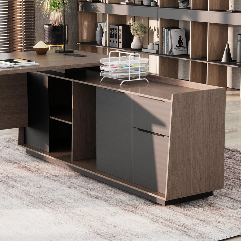 Three open storage compartments offer easy access to frequently used items, and two drawers provide space for private or sensitive documents. An on-desk cable grommet allows for organized wire routing and keeps cords out of sight for a cleaner setup.