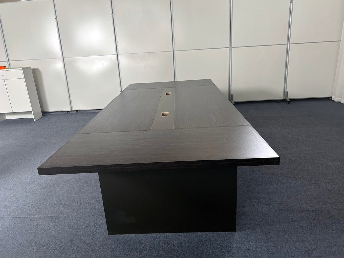 The double-plated tabletop adds to both the structural strength and the commanding aesthetic, delivering a solid, substantial surface that holds up under frequent use. Thick, reinforced legs provide excellent weight support and stability, making the table ideal for large-scale team discussions or presentations. A distinctive center strip design features a contrasting color block framed by woodgrain textures, creating subtle dimension without overwhelming the visual harmony.
