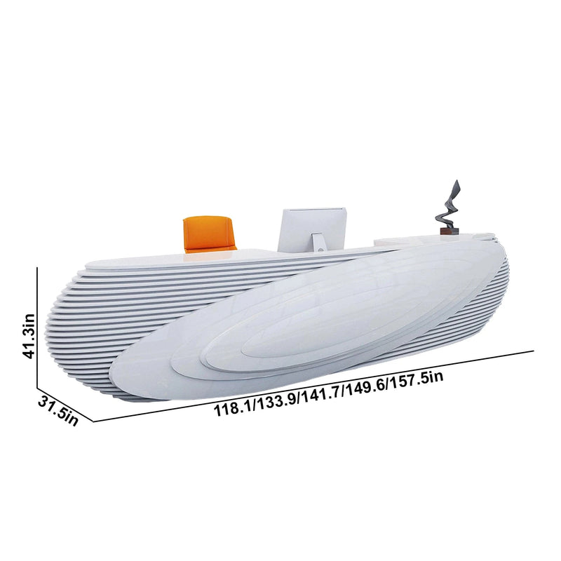 The Lynch Receptionist Desk makes a striking impression with its sculptural, aerodynamic silhouette. Featuring a layered elliptical front design and ribbed horizontal detailing that wraps around the body, this reception desk offers a bold, futuristic presence suited for high-concept interiors, creative studios, and design-forward commercial spaces.