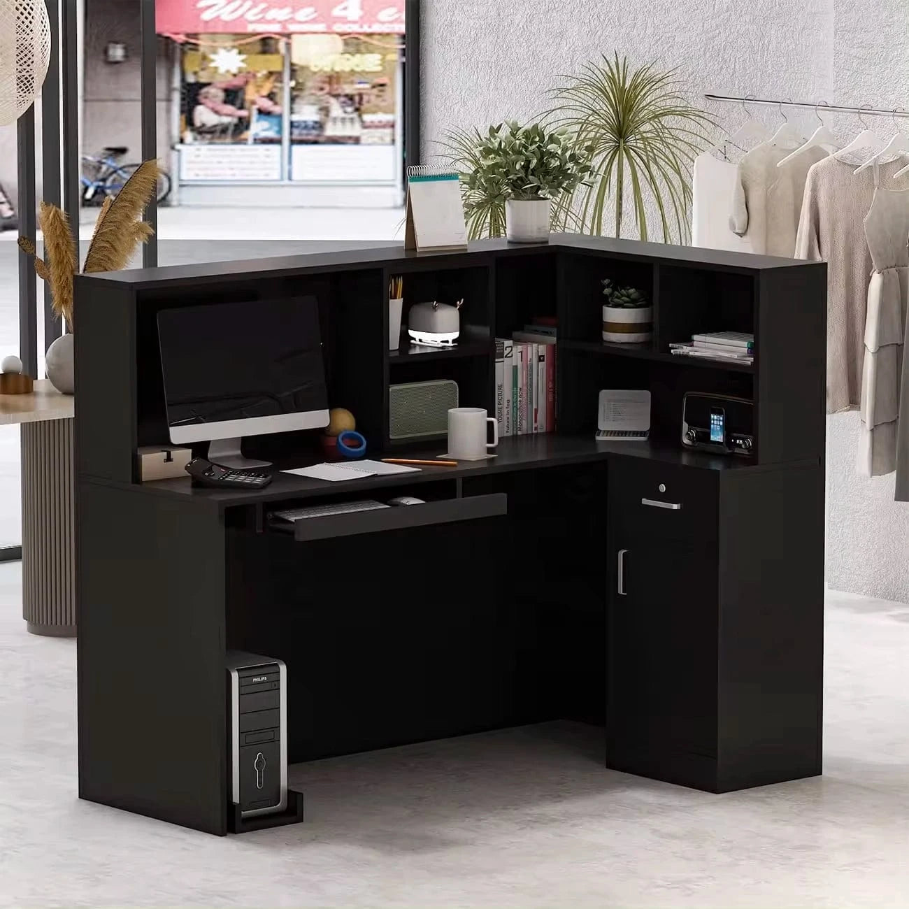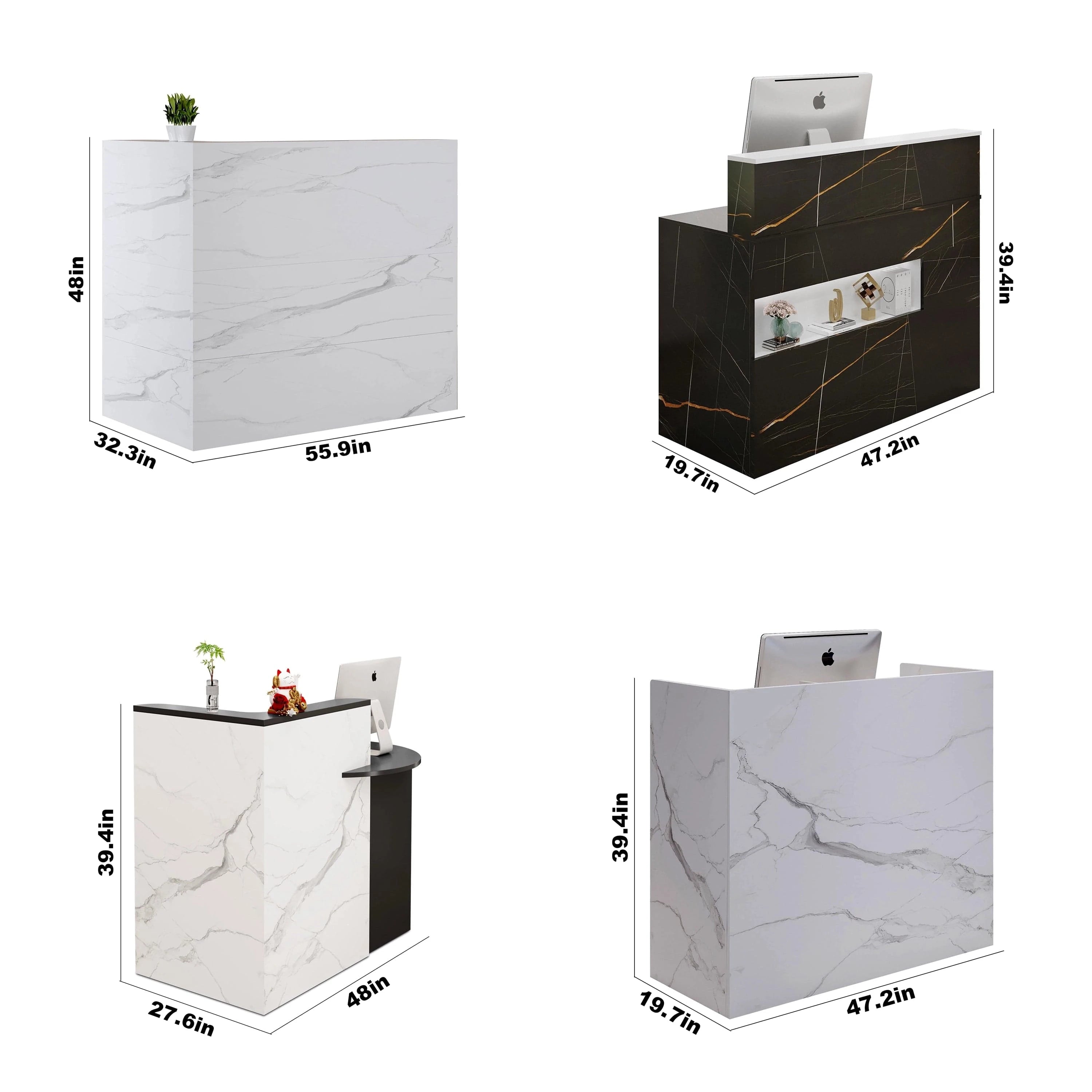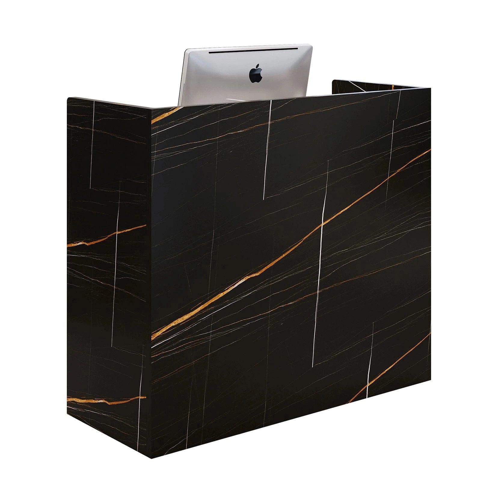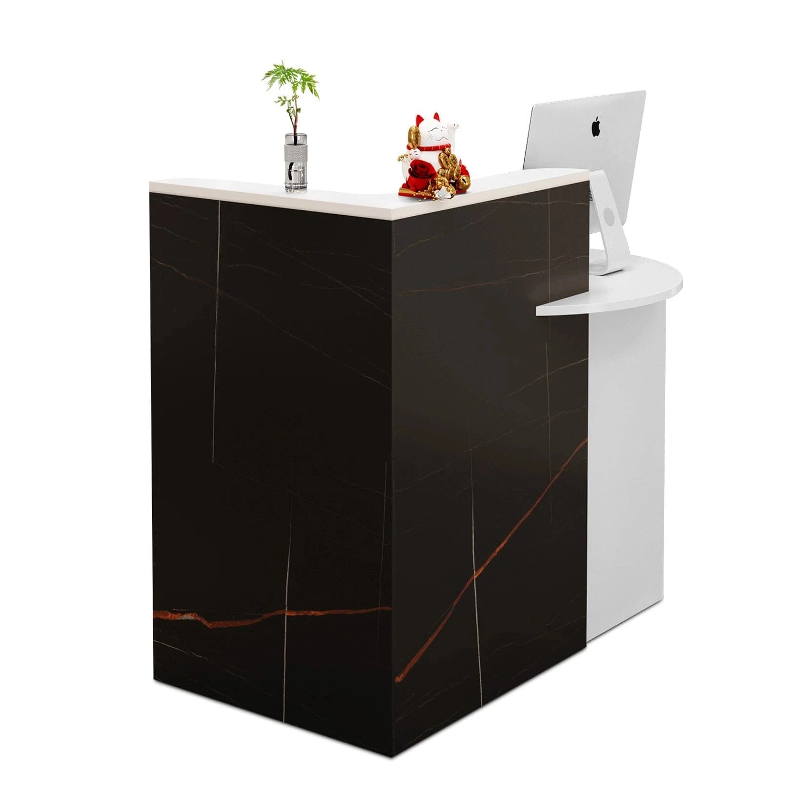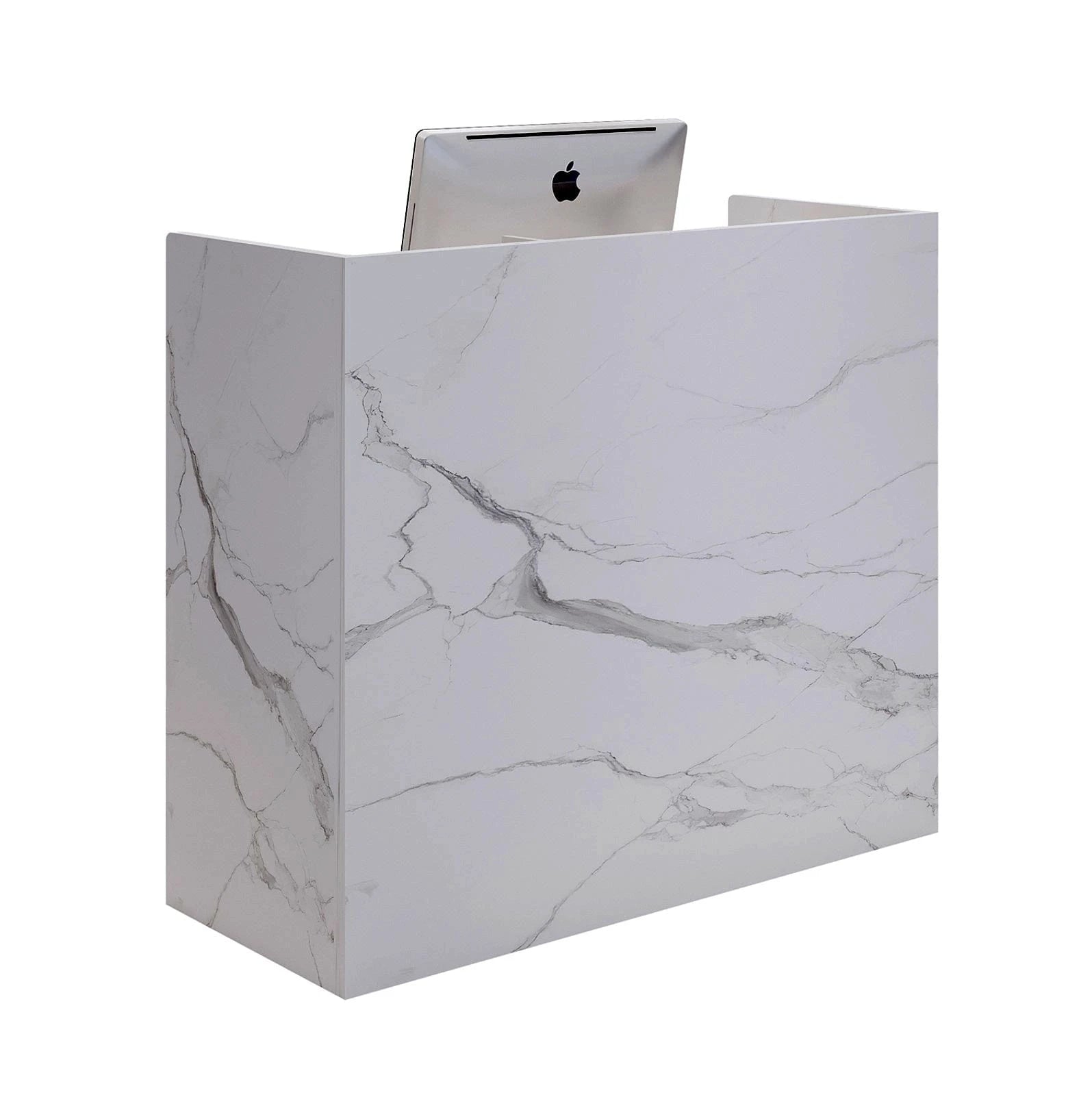 Designed with a stepped transaction counter and a recessed front display niche, this piece balances function and presentation. A contrasting side panel and open front-facing shelf create dimension and provide space to showcase brochures, décor, or branded materials.