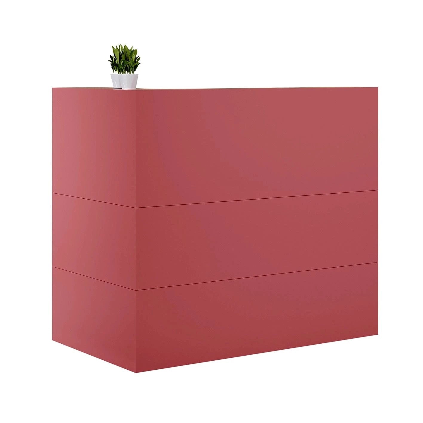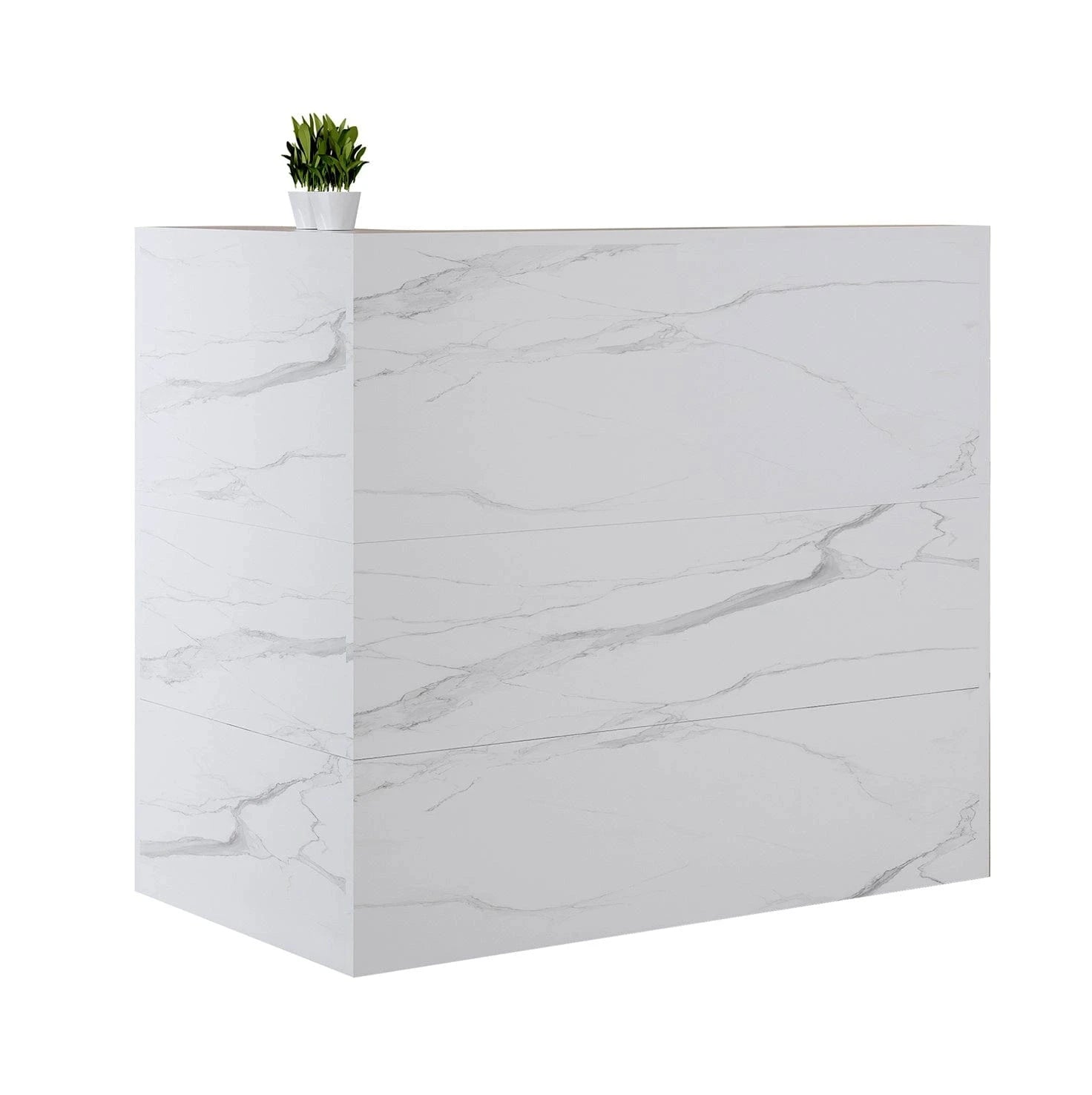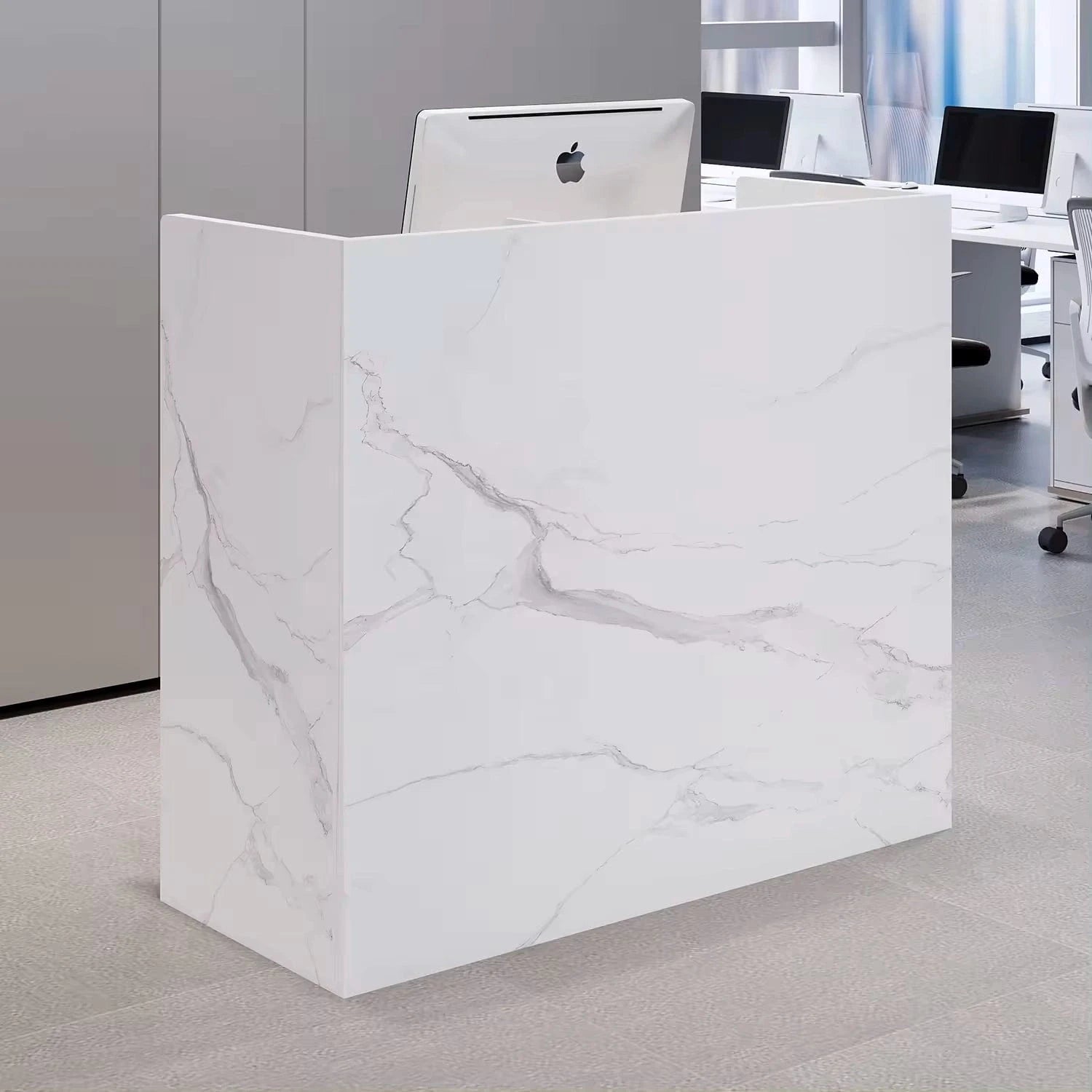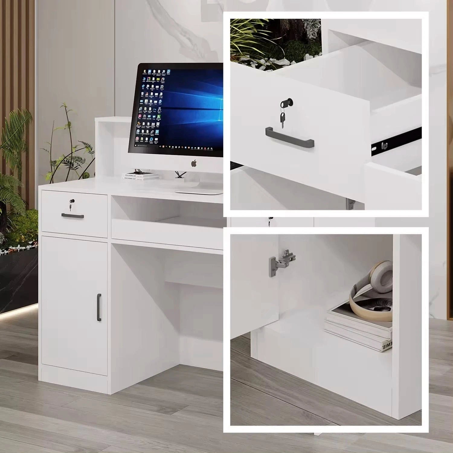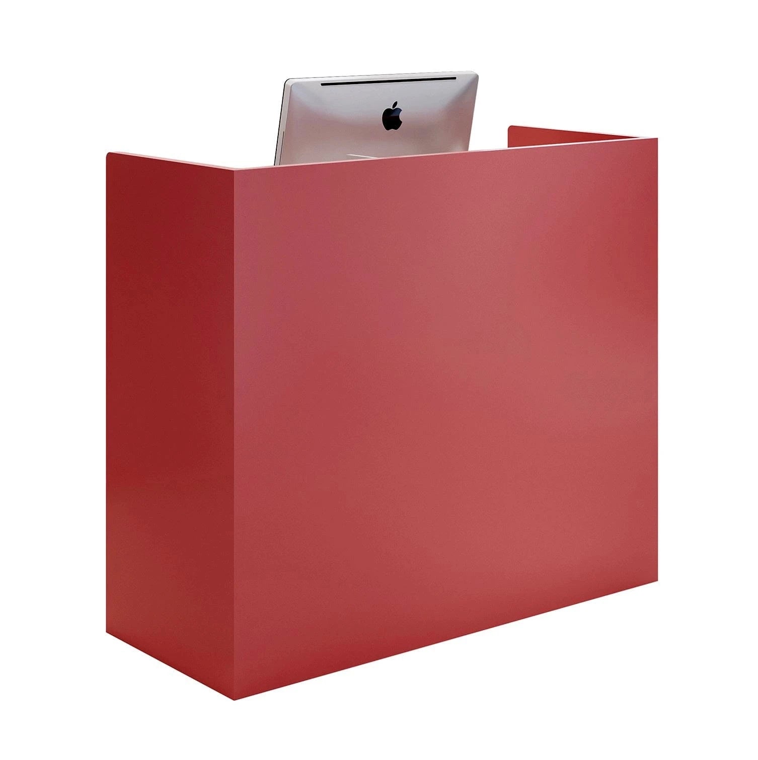 Designed with a stepped transaction counter and a recessed front display niche, this piece balances function and presentation. A contrasting side panel and open front-facing shelf create dimension and provide space to showcase brochures, décor, or branded materials.