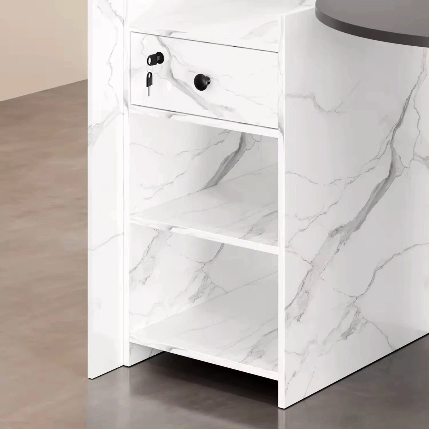 The built-in LED undertone lighting softly highlights the base, adding ambiance while ensuring visibility. A centered privacy slate shields the work surface, making it ideal for customer interactions or confidential work.