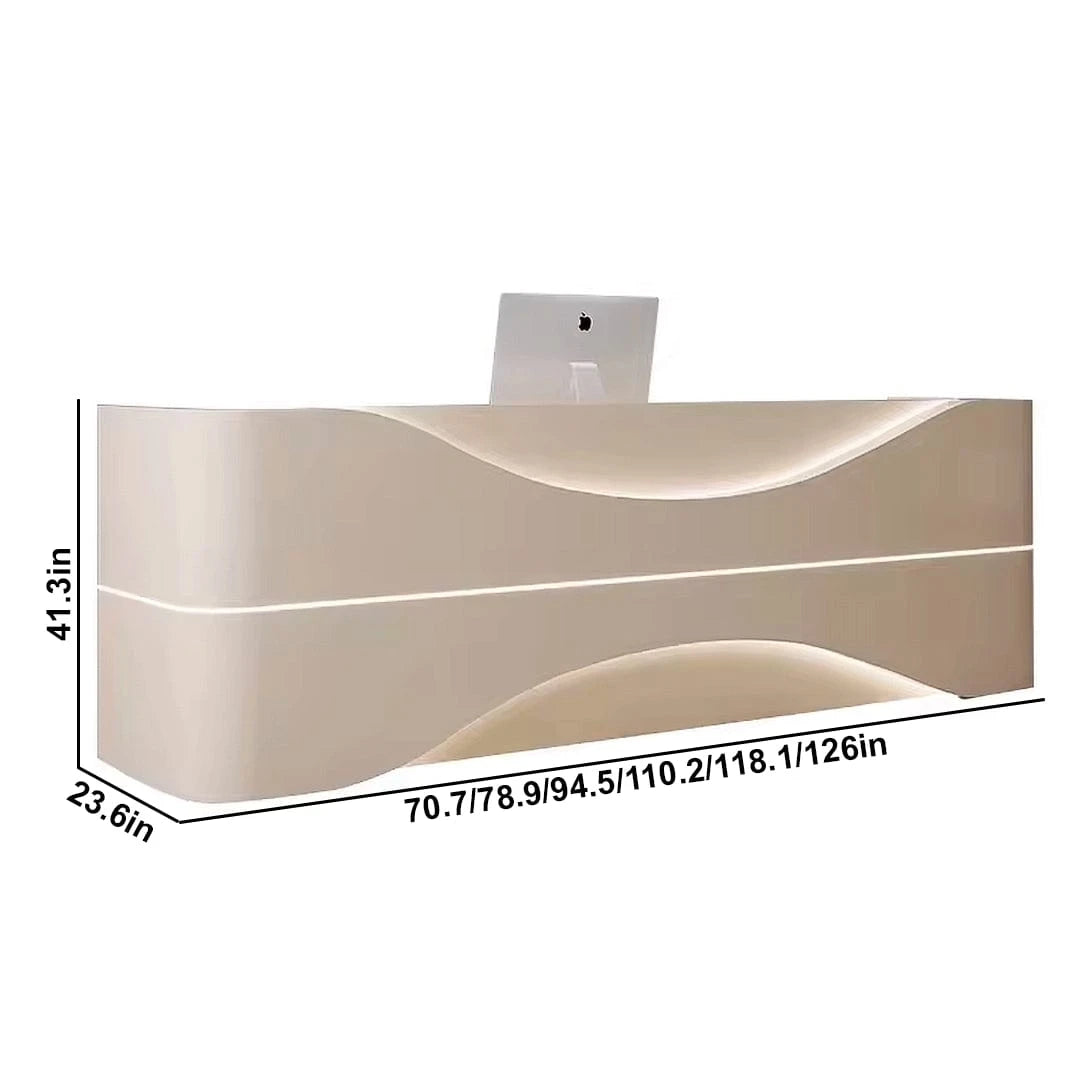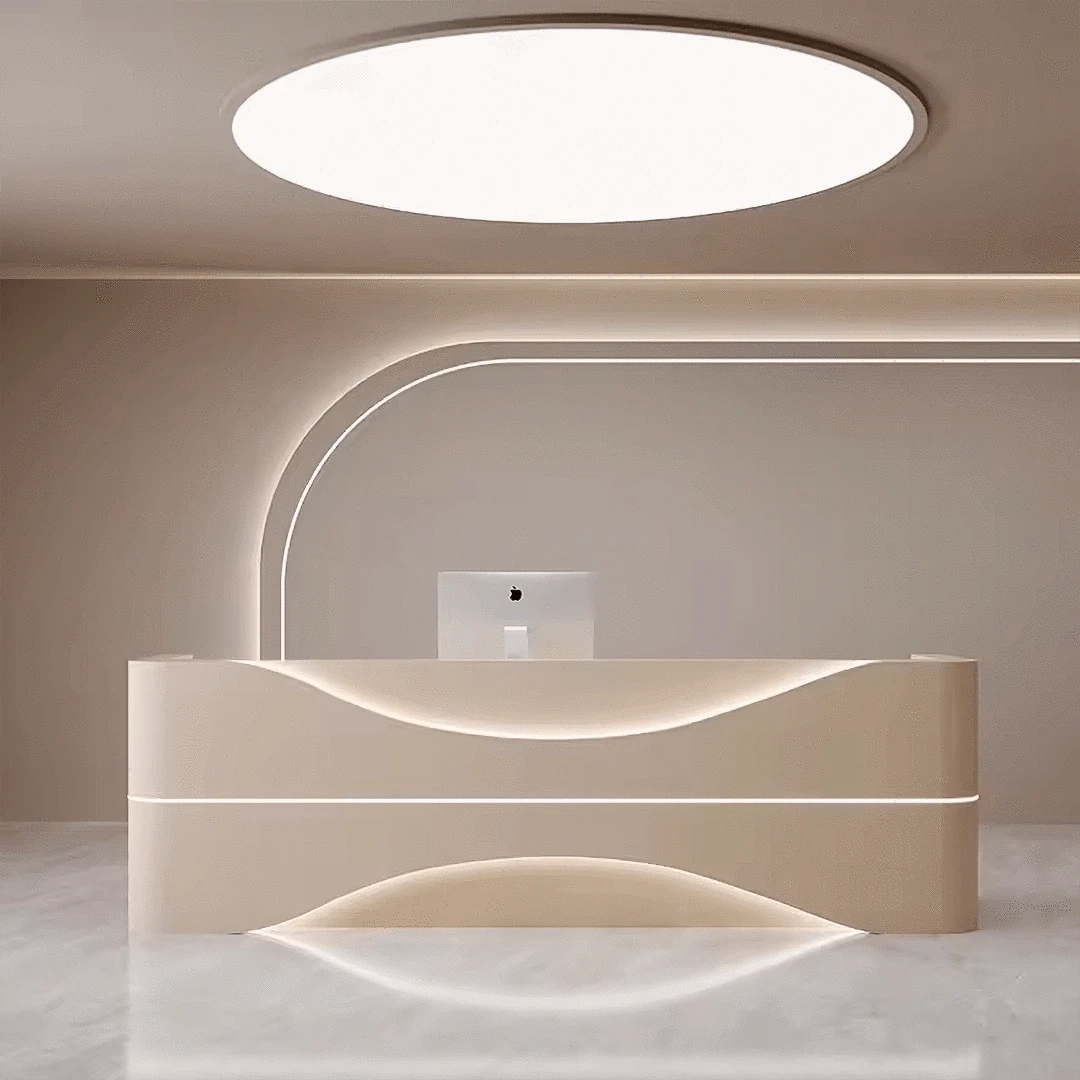 The rectangular structure is accentuated by a gently curved front panel that adds a sculptural quality without compromising function. Integrated ambient lighting runs discreetly along the form, casting a soft, inviting glow that highlights the desk’s fluid lines and adds to its luxurious atmosphere. This wave-inspired aesthetic brings a sense of calm and sophistication to busy environments.