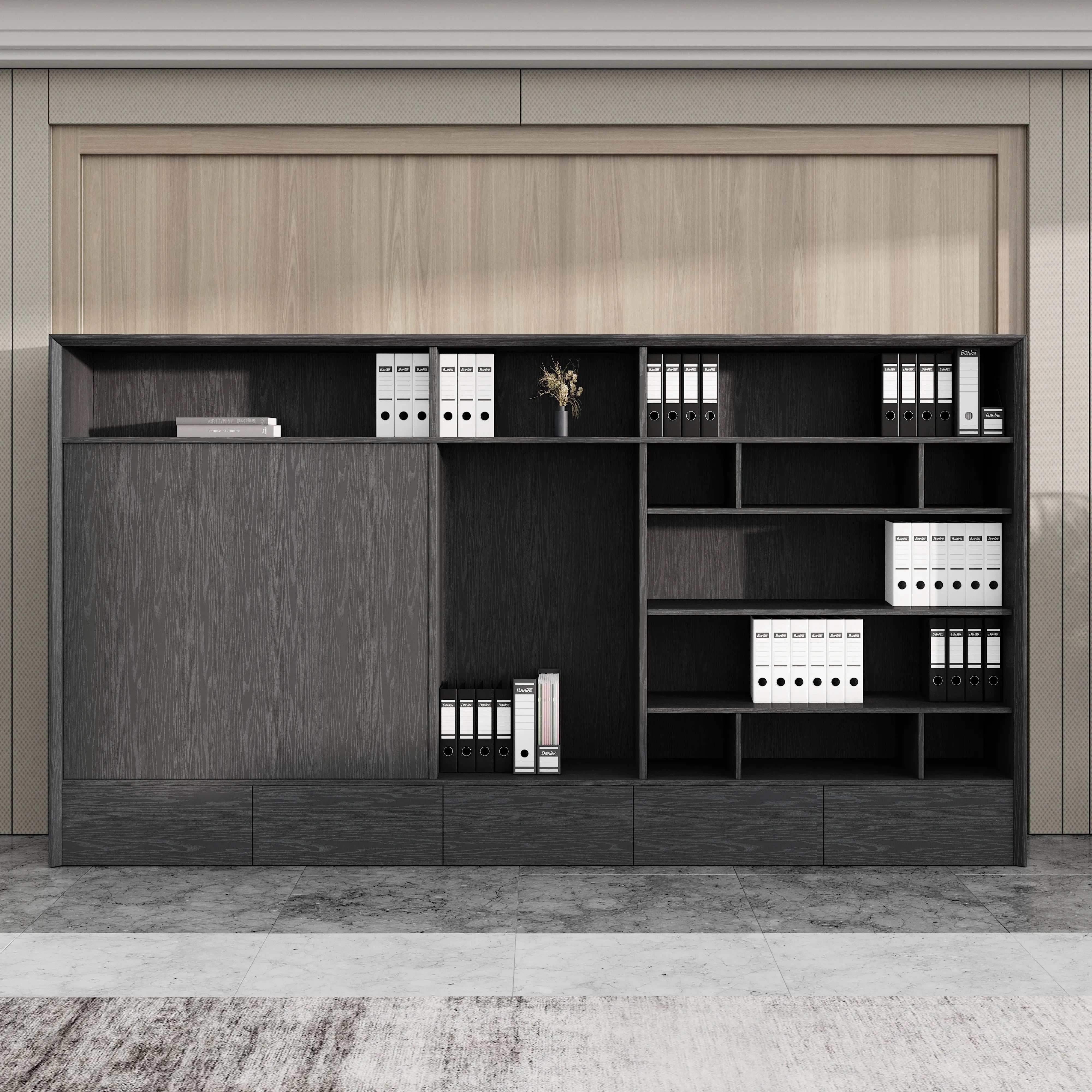 - Storage Configuration: Combination of open display and enclosed drawer storage