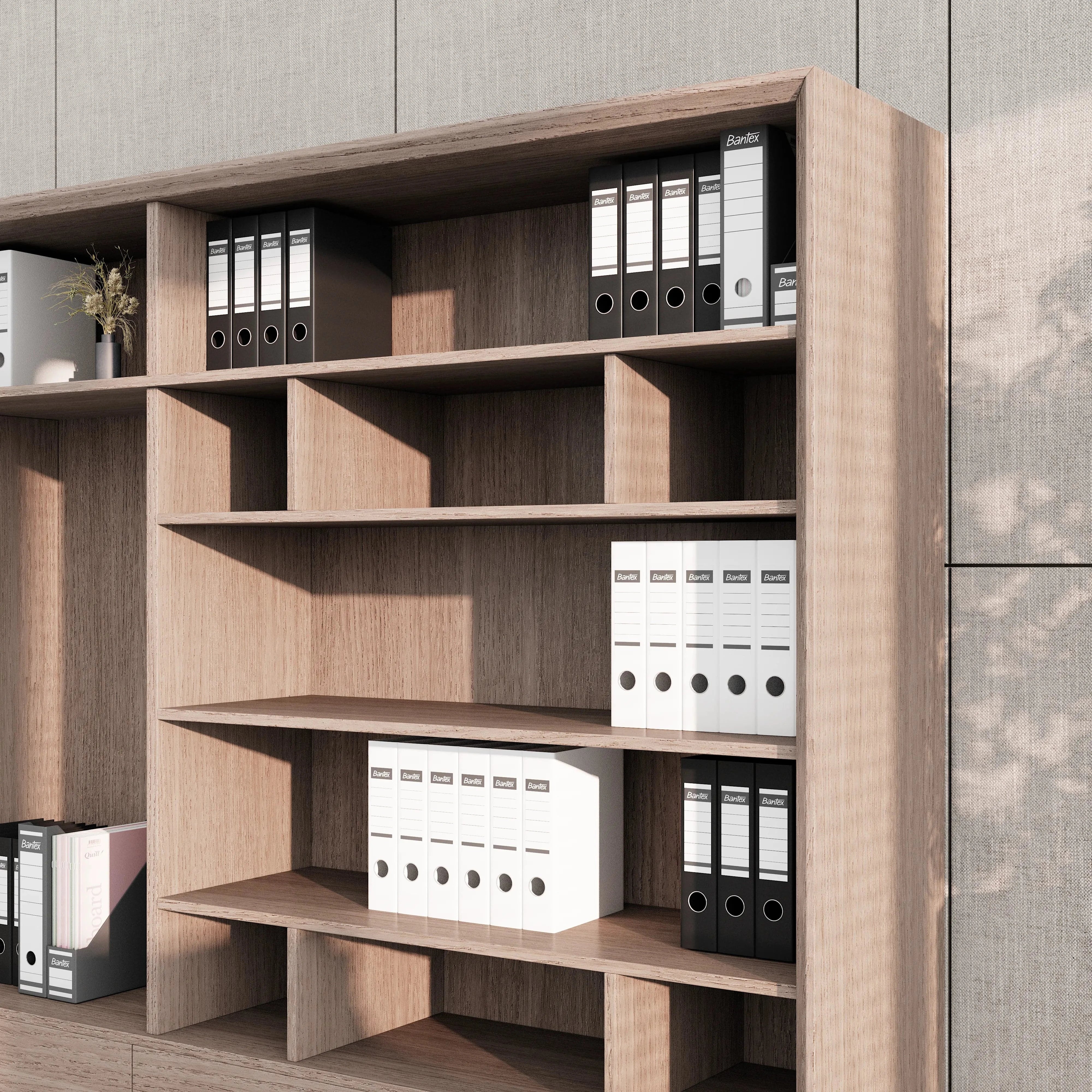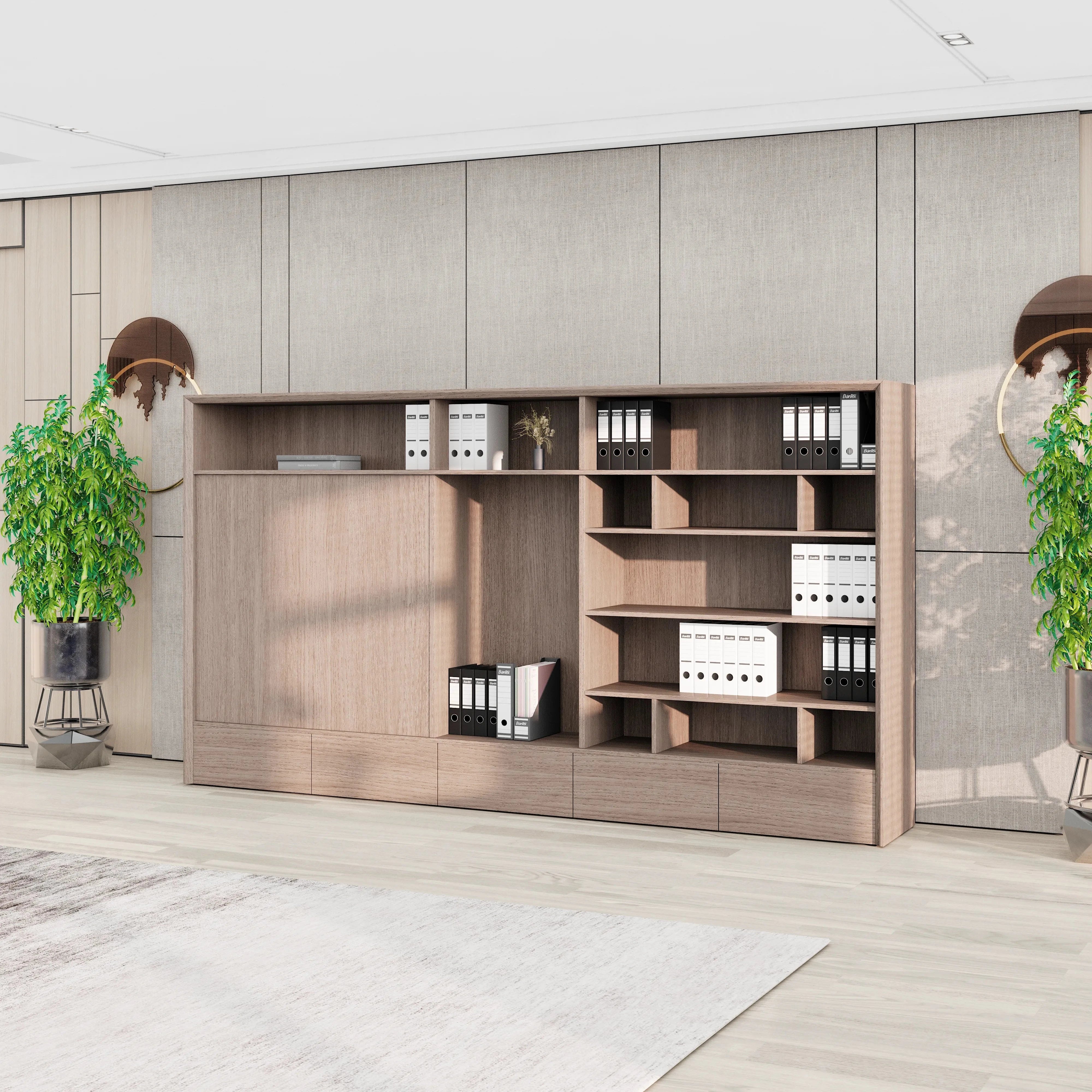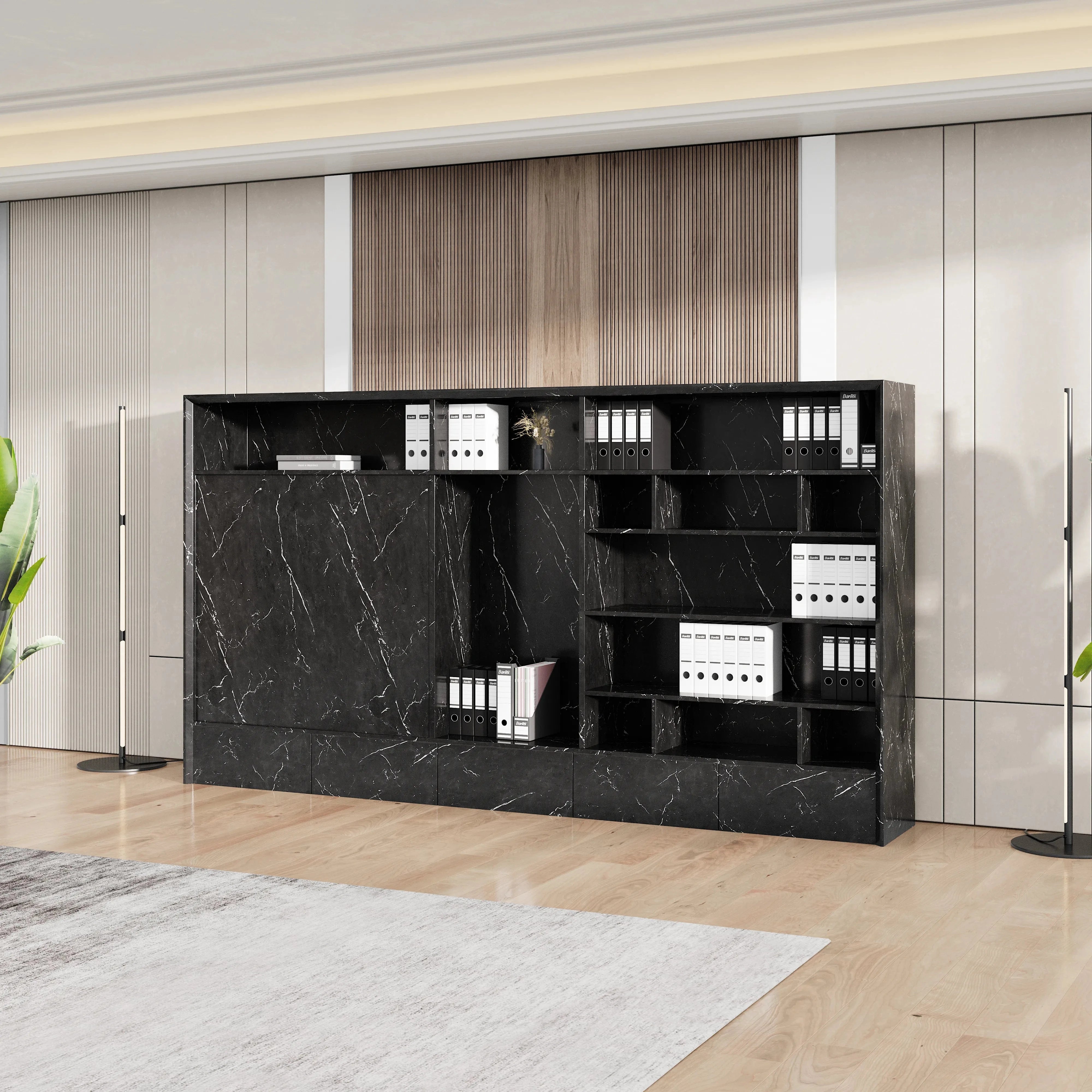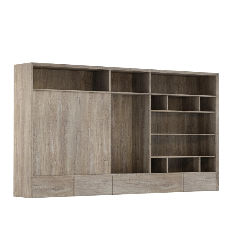Spanning 126 inches in width and 15.7 inches in depth, Nora includes a well-balanced combination of twelve open shelves and twelve drawers, offering a total of seventeen compartments across six vertical levels. This mix allows for thoughtful storage and display, so you can organize documents, showcase books, or add personal touches like art and décor without clutter.