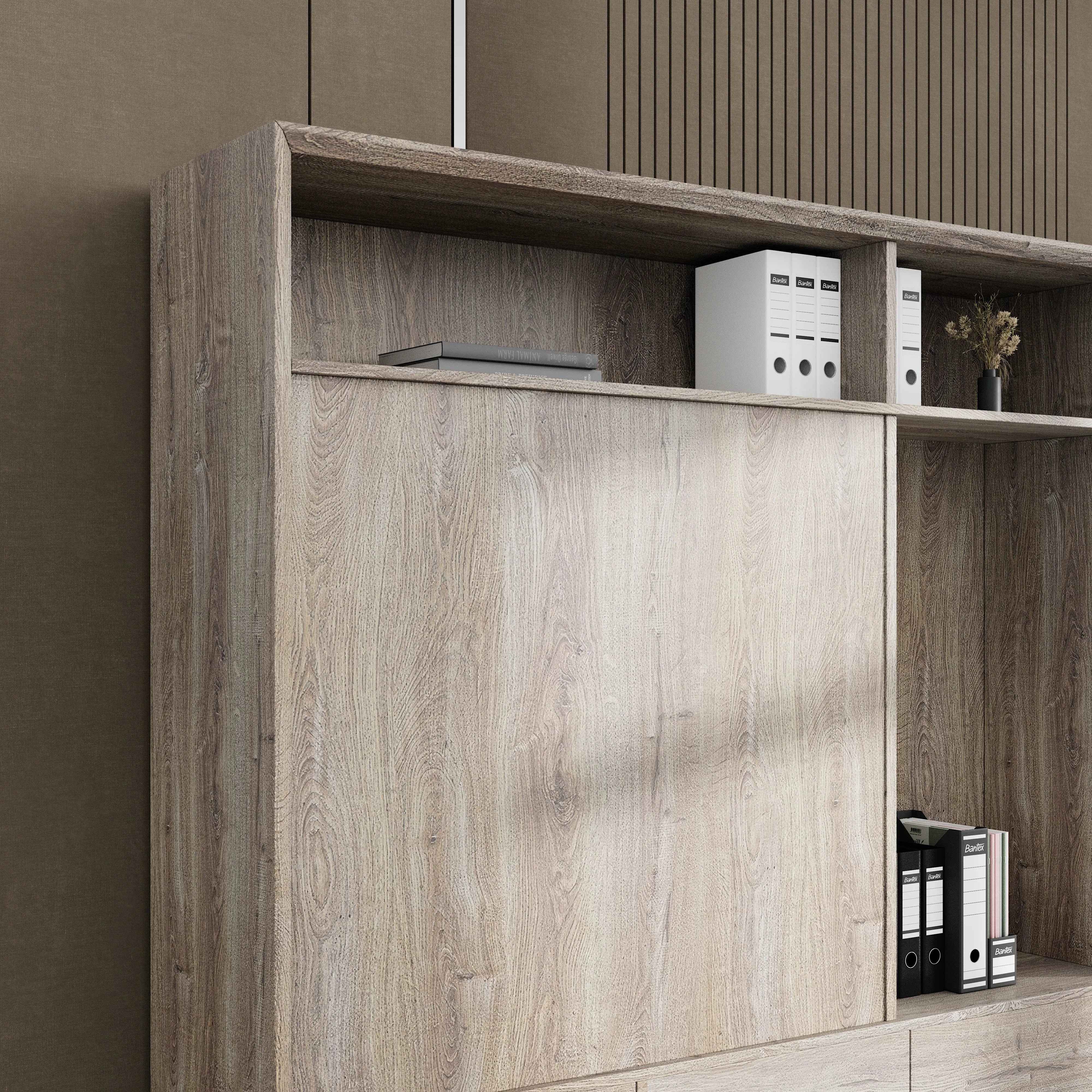 With 13 sophisticated finish options to choose from, Nora easily adapts to various interior aesthetics. Whether styled in a contemporary office or a transitional living room, the unit’s clean lines and neutral tones help ground the space without overwhelming it.