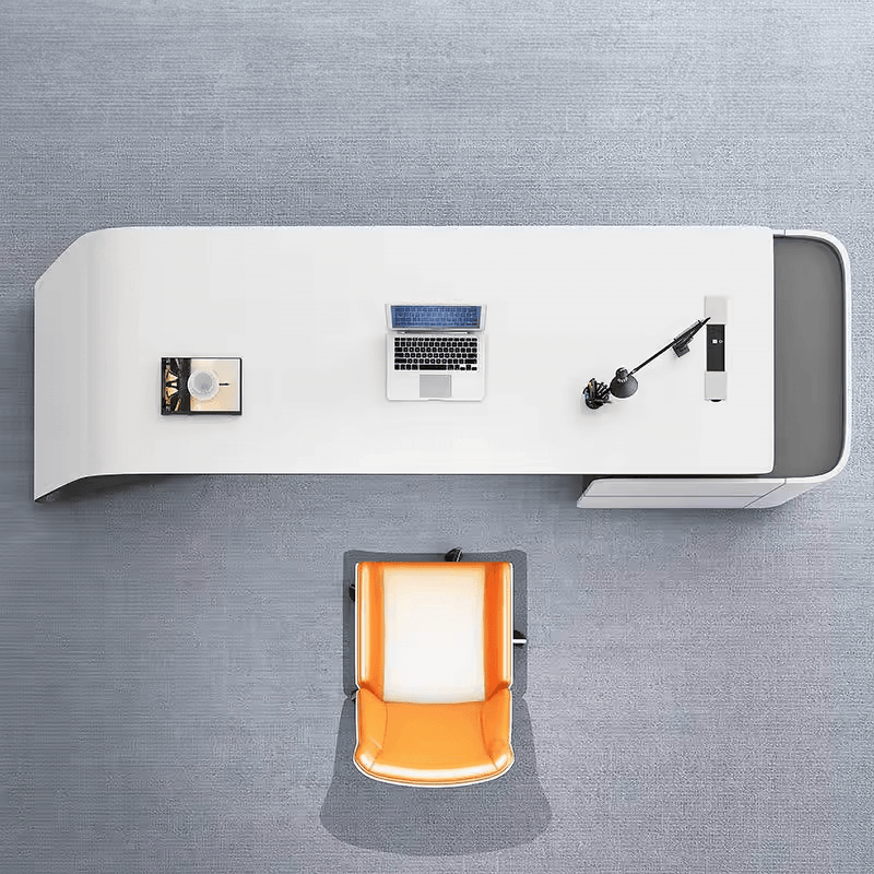 The rectangular silhouette is elevated by a cantilevered structure, supported by a dramatic angled leg that introduces architectural character and flow. This sculptural form is complemented by rounded corners and a curved-edge return storage unit, softening the overall geometry and offering enhanced safety in active office settings.