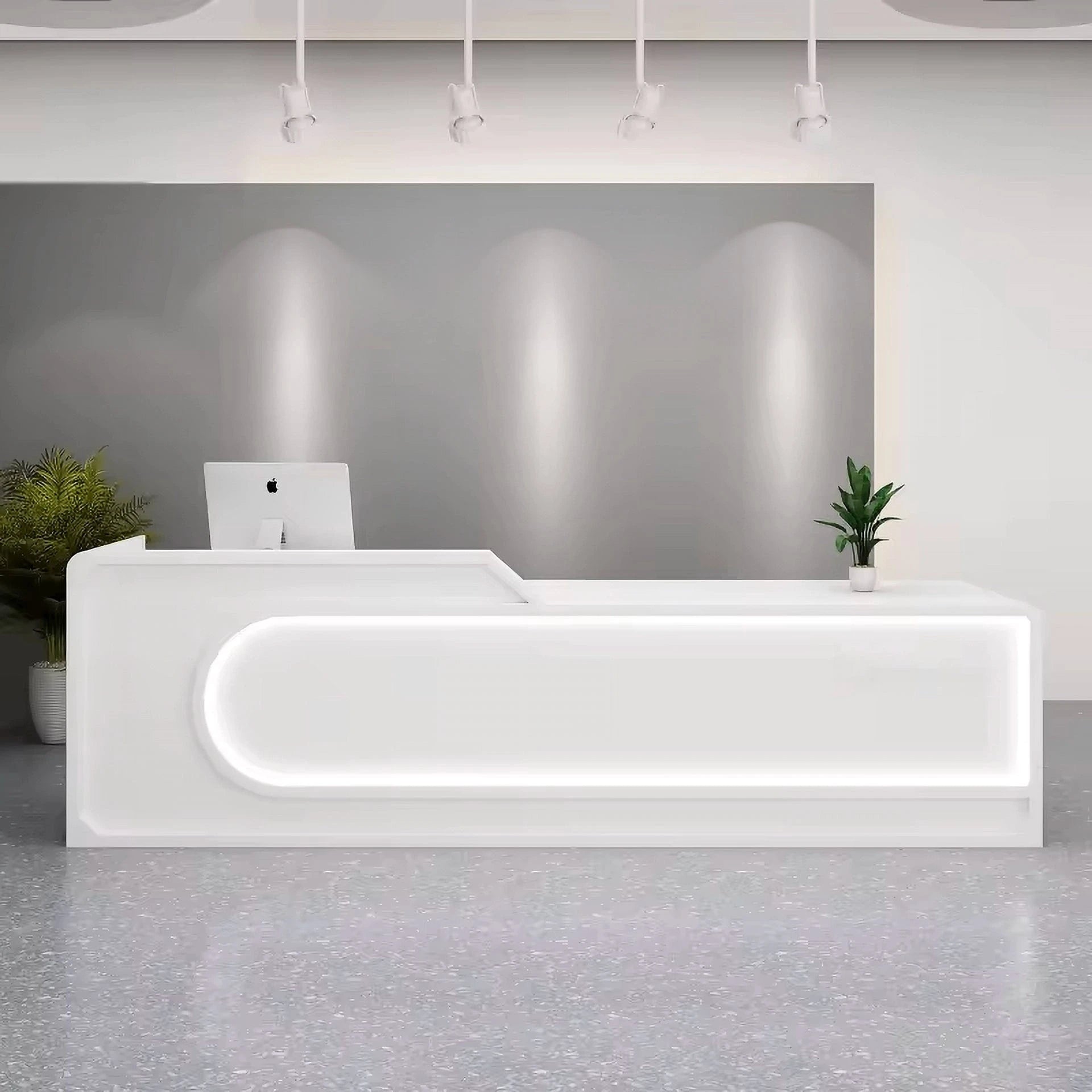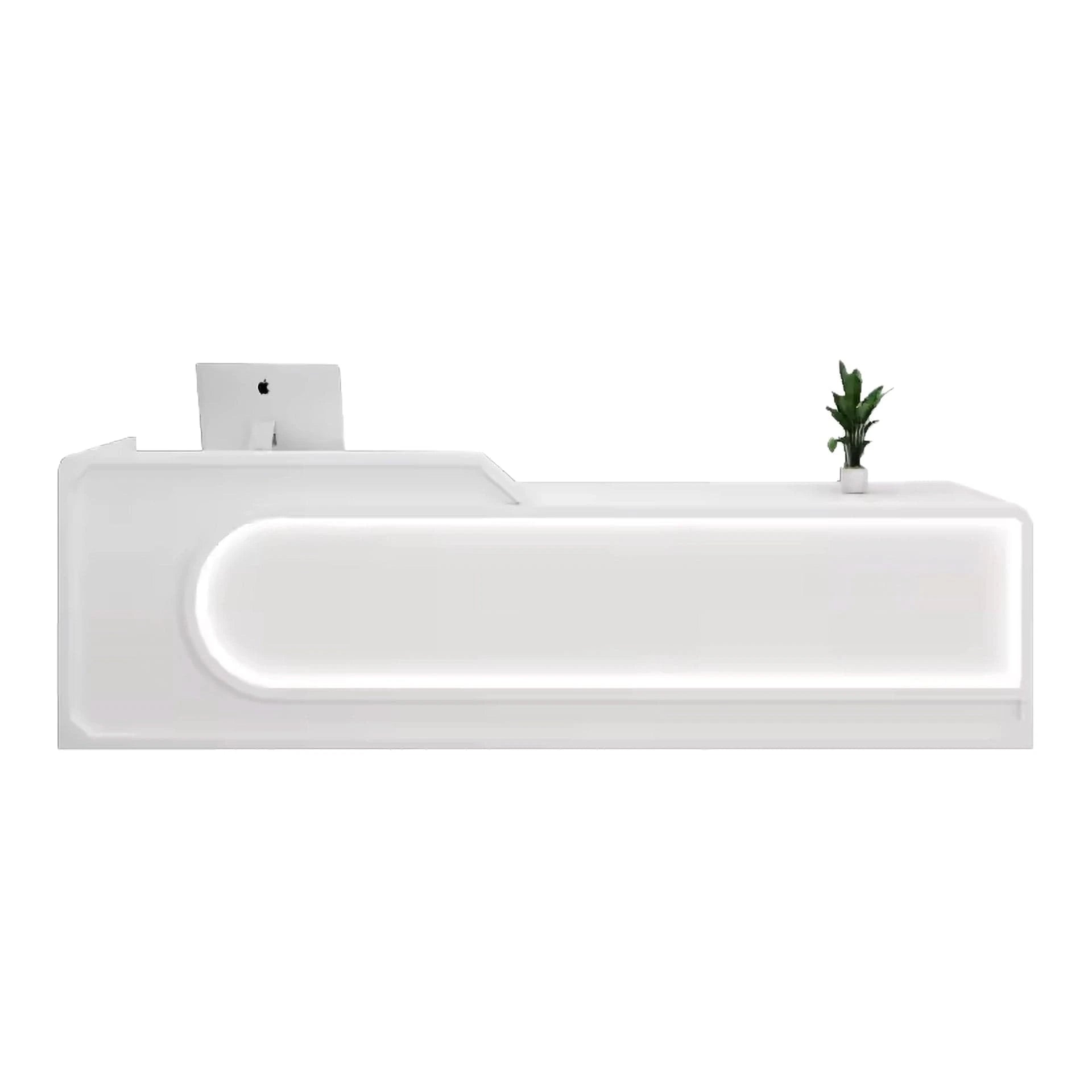 The gloss white finish offers a pristine look, further elevated by a rounded rectangular inlay across the front panel. Integrated ambient LED lighting along the inlay creates a soft glow, emphasizing the desk's sleek geometry and providing an inviting atmosphere for any professional reception or welcome area.