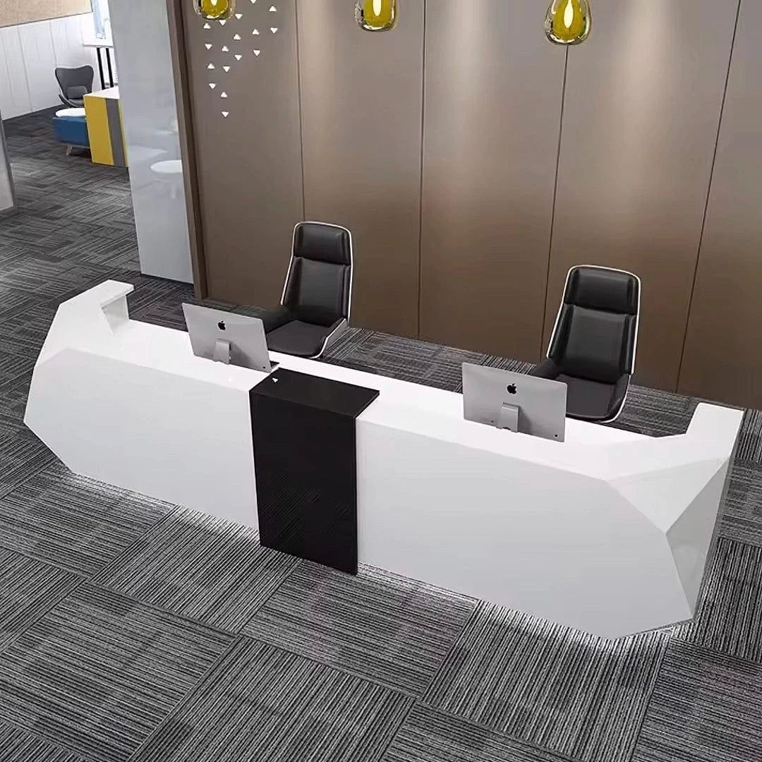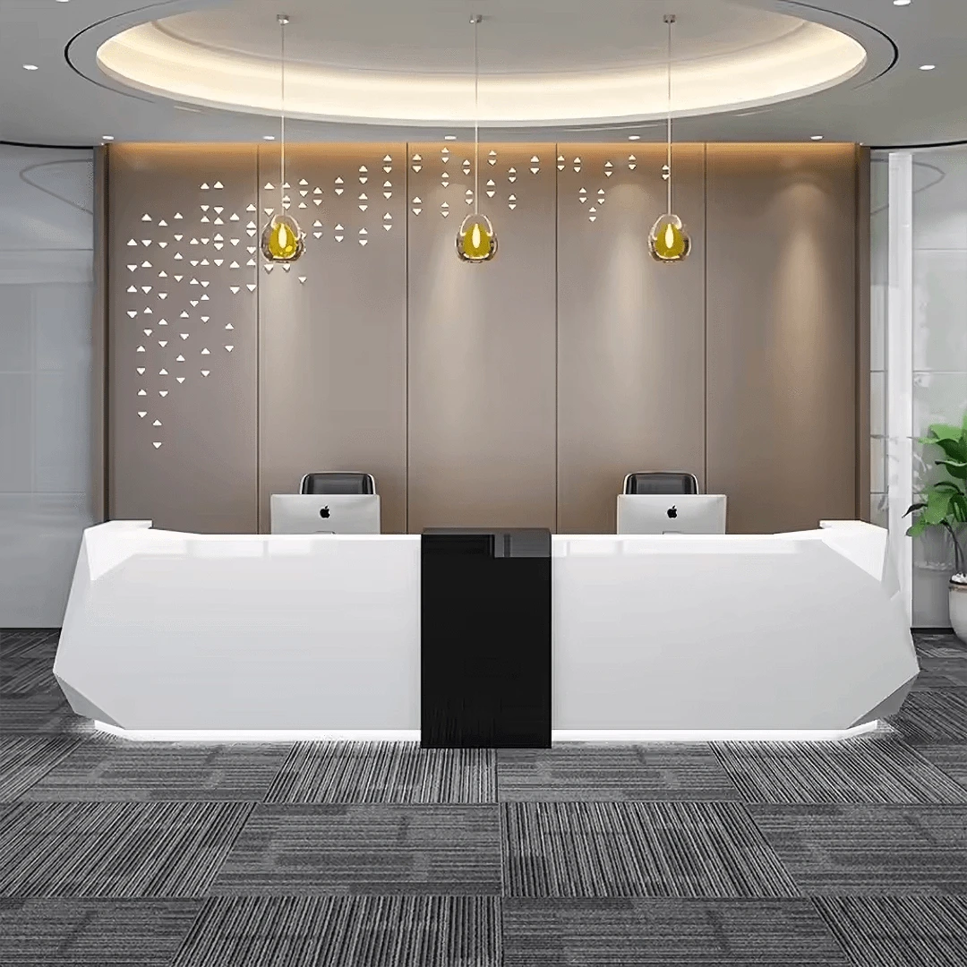 The desk’s faceted design and rounded front edges introduce a distinctive architectural presence. A contrasting central accent panel provides depth and symmetry, while LED base lighting subtly enhances the desk's geometry, offering a sophisticated glow that brings dimension to any reception space.