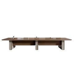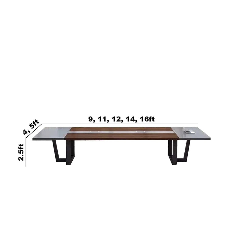 A double-plated tabletop reinforces the structure while visually enhancing the profile, delivering both thickness and presence without added bulk. The table’s design incorporates thick, powder-coated metal legs that provide excellent load-bearing support, ensuring it stays stable during high-capacity meetings. A contrasting center inlay across the tabletop introduces subtle detailing, blending a textured woodgrain center with solid-colored framing to create visual interest without distraction.