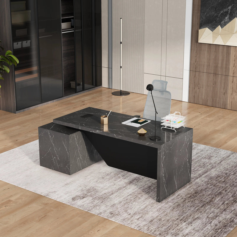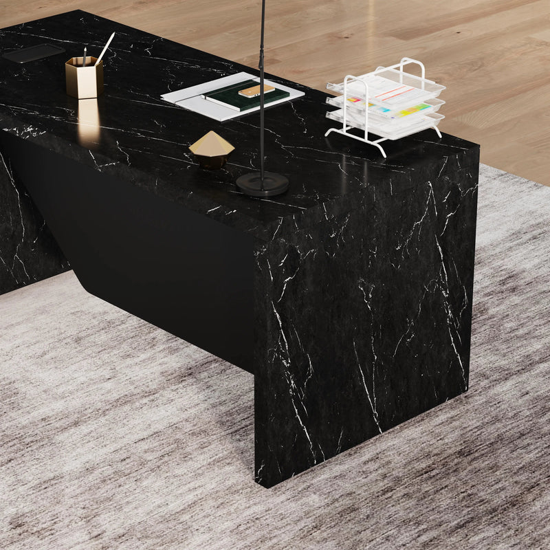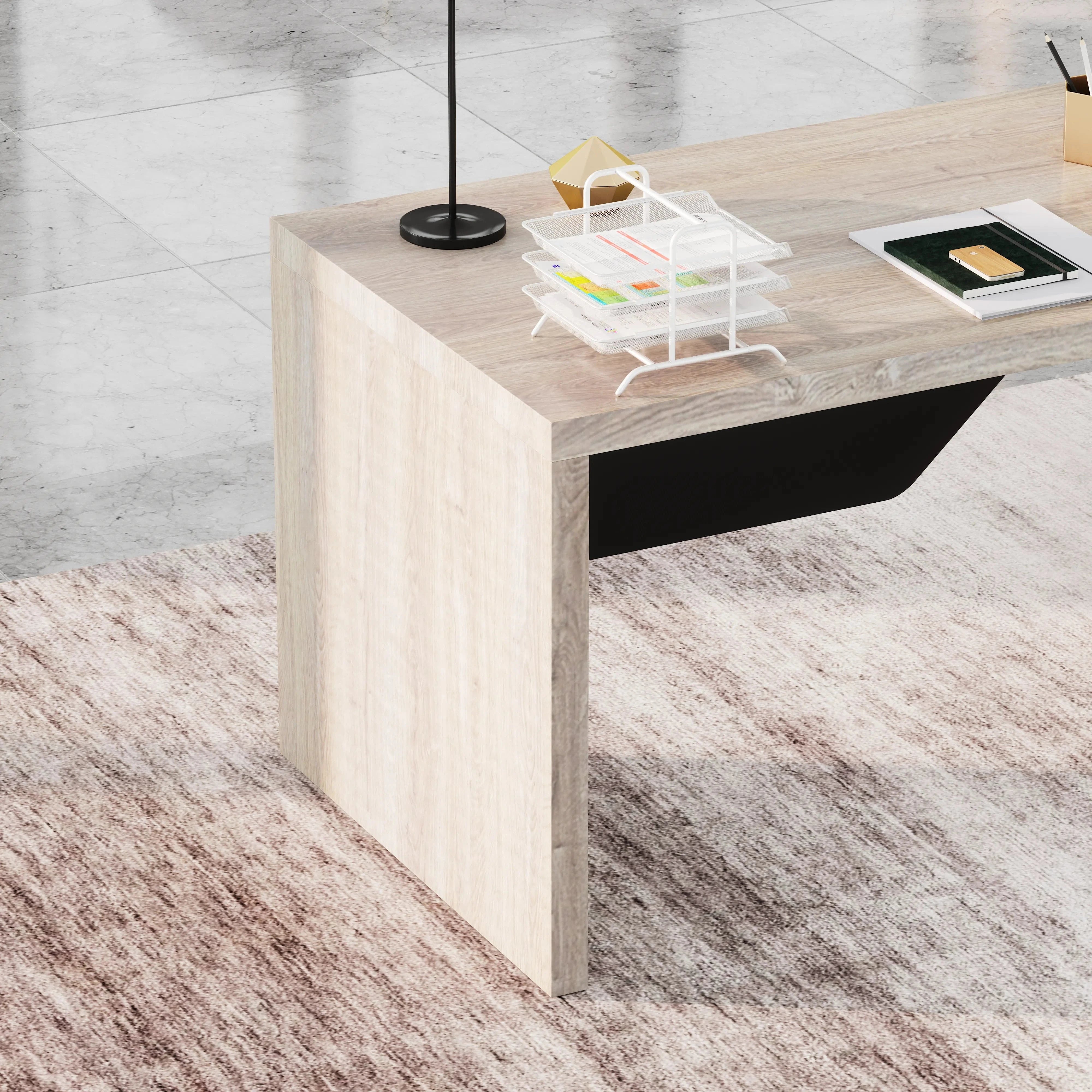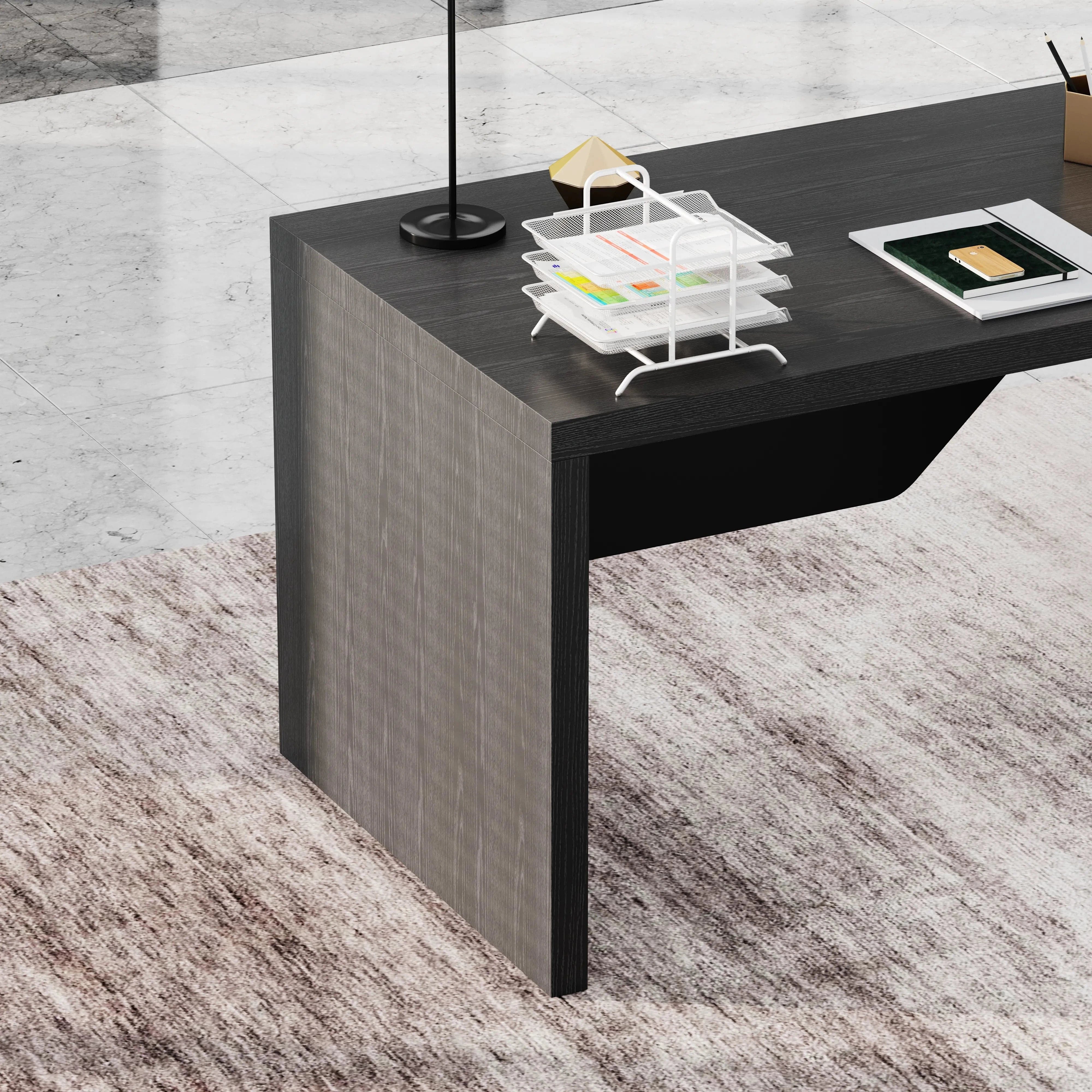 The desk’s design includes a privacy beveled slate that enhances both functionality and discretion, giving the user a designated space that feels enclosed and protected. The expansive desktop and generous leg space promote comfort and efficiency across long work sessions.