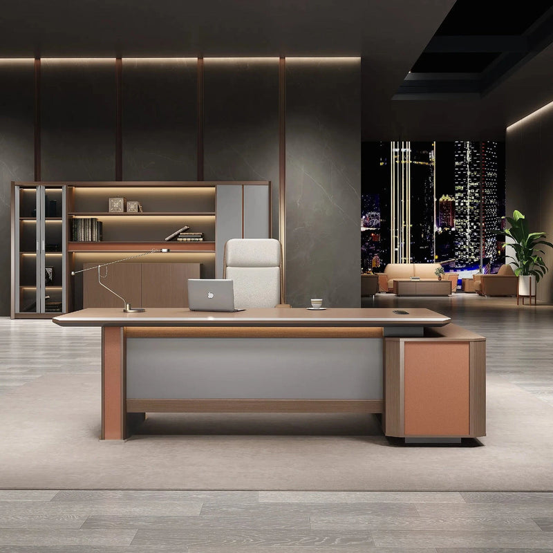 The return cabinet is uniquely designed with wooden leather and saddle leather materials, bringing a luxurious touch to the desk’s overall design. The cabinet is also equipped with a password lock, adding an extra layer of security to store confidential materials safely and securely.