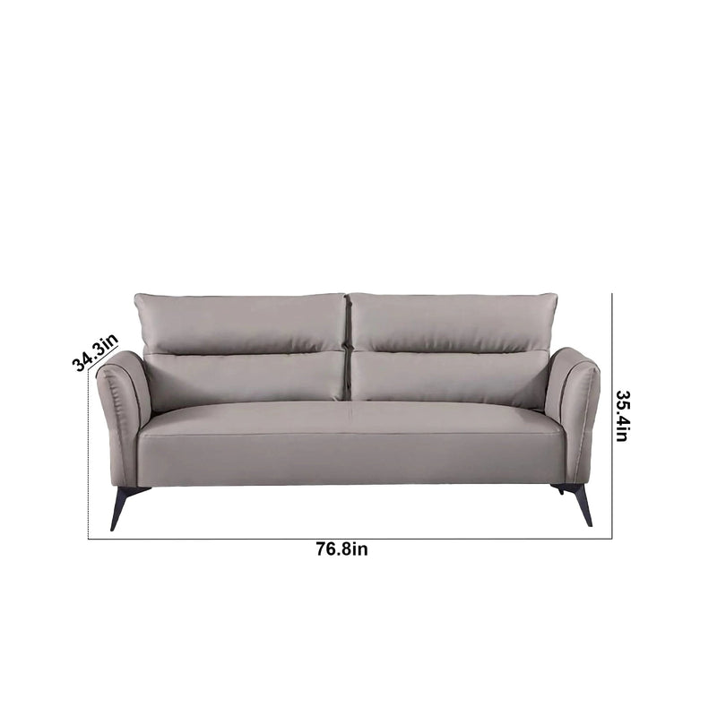 The slim metal legs with a dark-colored finish complement the overall aesthetic, providing a contrast to the lighter upholstery. These legs are slightly angled inward, adding an extra touch of elegance while contributing to the minimalist look. The use of metal not only ensures strength and stability but also maintains a light, airy feel, allowing the sofa to fit easily into any space without overwhelming the room.