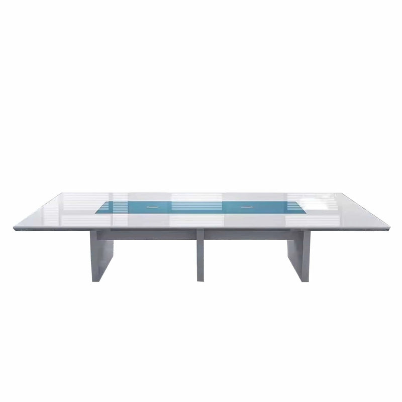 The design features a long rectangular tabletop with refined, straight lines and softened corners for a professional yet welcoming presence. A central contrast inlay strip runs along the tabletop, adding a visual accent that subtly breaks the surface and provides a point of focus without interrupting the workspace.